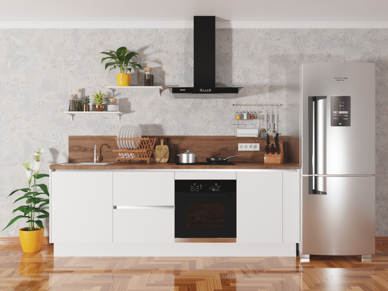 Кухонные гарнитуры без верхнего яруса отлично подходят для маленьких помещений. Многие дизайнеры пользуются этим приемом, а для организации хранения рекомендуют оборудовать открытые полки или поставить шкаф-колонну до потолка и в цвет стен. Так, шкаф не будет выглядеть громоздким, а потолок будет казаться выше.