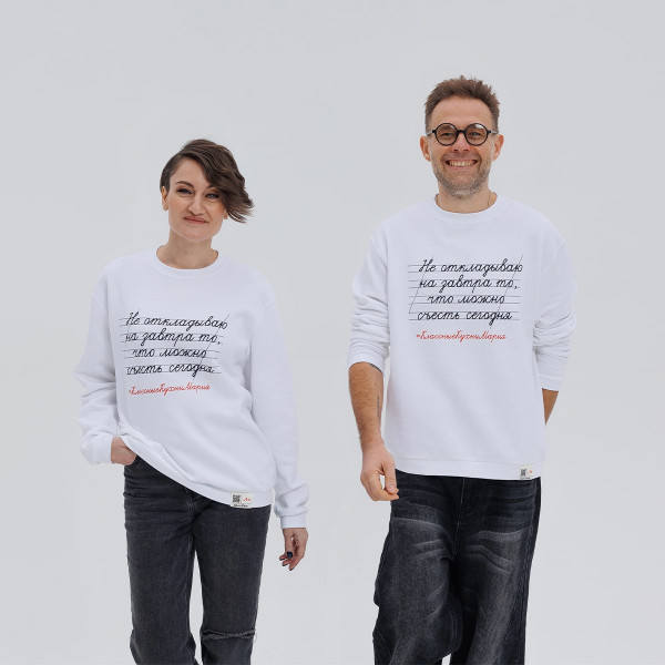 Свитшот белого цвета, без боковых швов, внутренняя сторона с начесом, укрепляющая тесьма по вороту, манжеты, ворот и низ изделия связаны резинкой с эластаном, втачной рукав