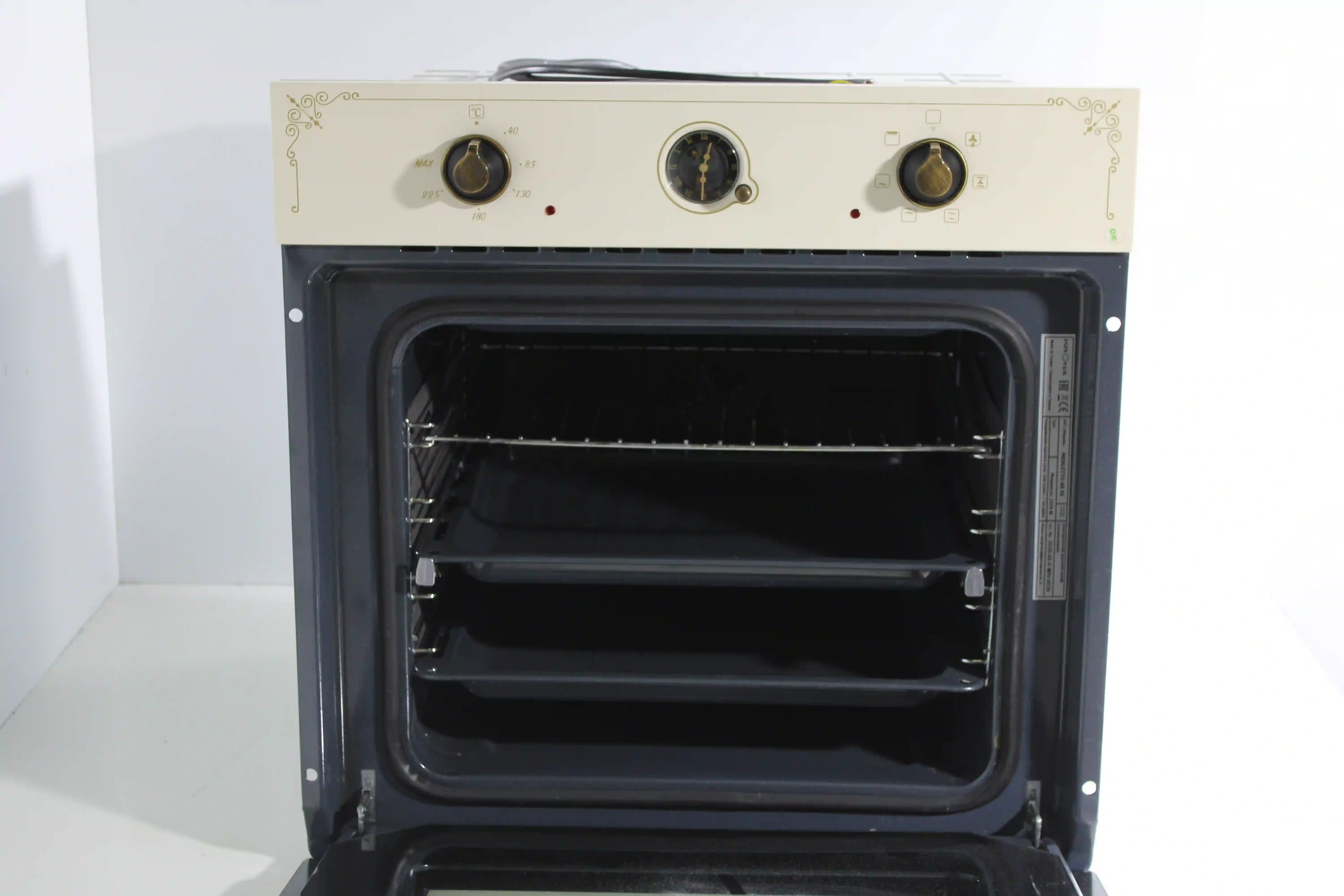Когда вы не пользуетесь духовкой, аналоговый программатор с таймером на 90 минут превращается в стильные часы. Телескопические направляющие помогают аккуратно доставать готовые блюда, не обжигая руки.