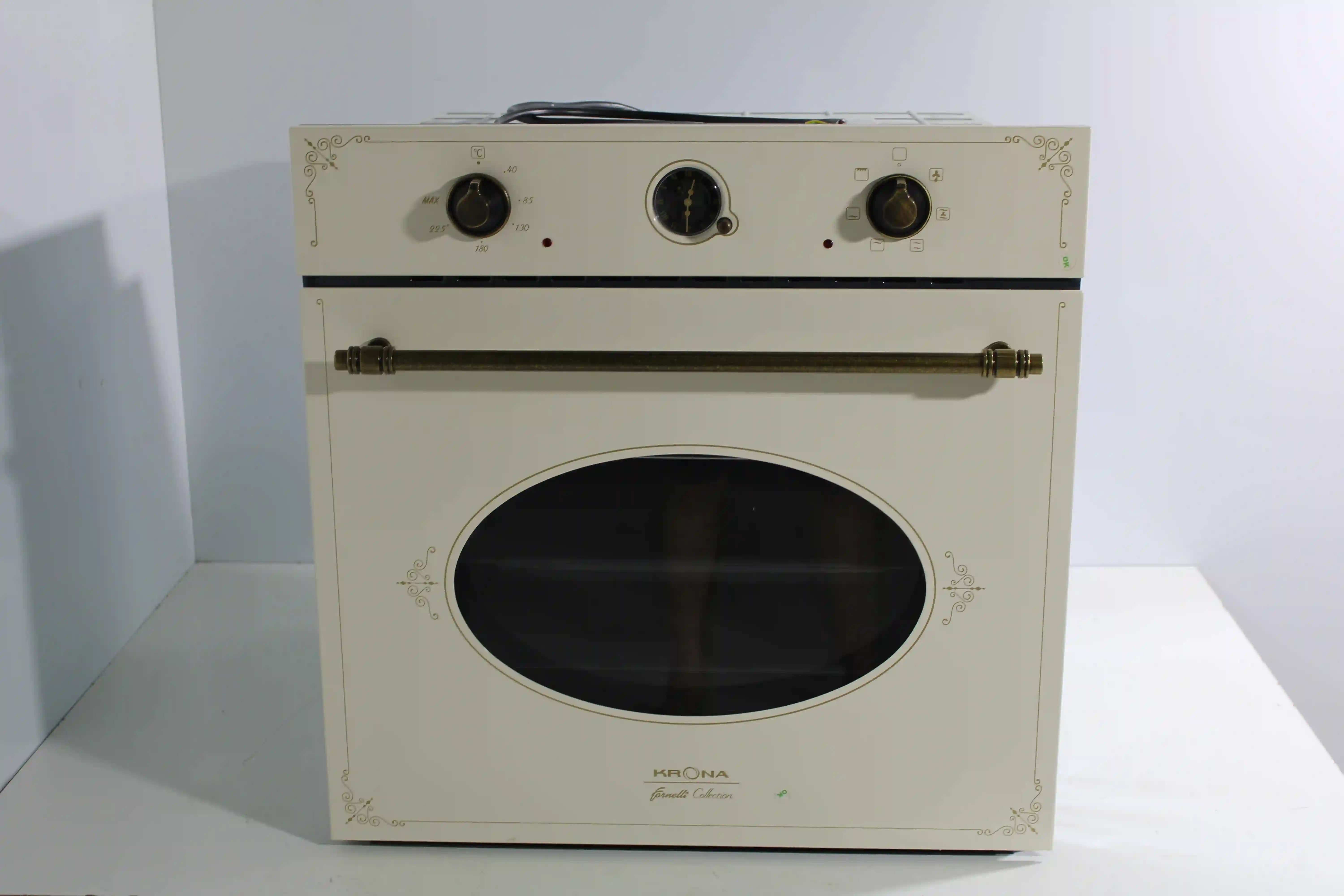 Электрический духовой шкаф Krona Merletto 60 идеально впишется в кухню с классическим оформлением. Оригинальная форма стекла и фурнитура с отделкой под натуральную бронзу делают его настоящим украшением интерьера.