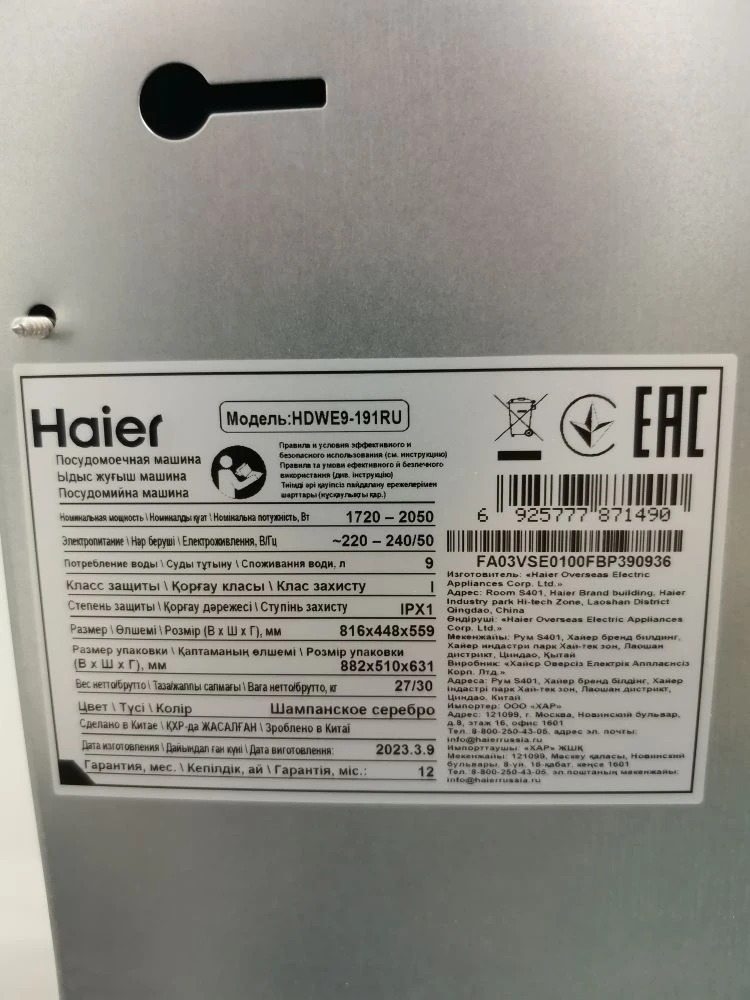 Энергопотребление за цикл 0.89 кВтч
