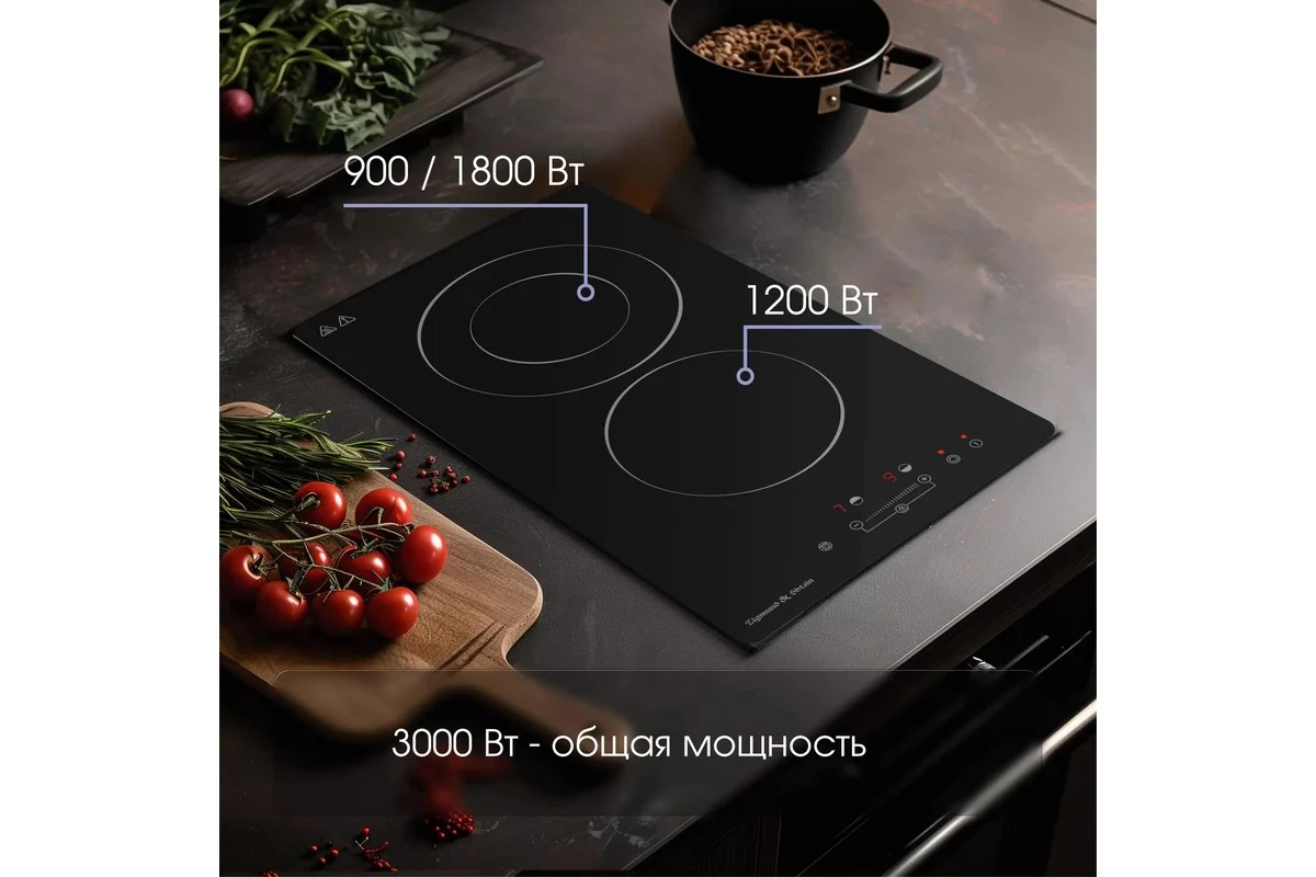 Мощность и размер горелок,1 элемент 165 мм 1200 Вт: ; 1 лемент 200 мм 900 / 1800 Вт , общая мощность - 3000
