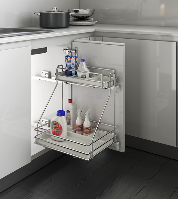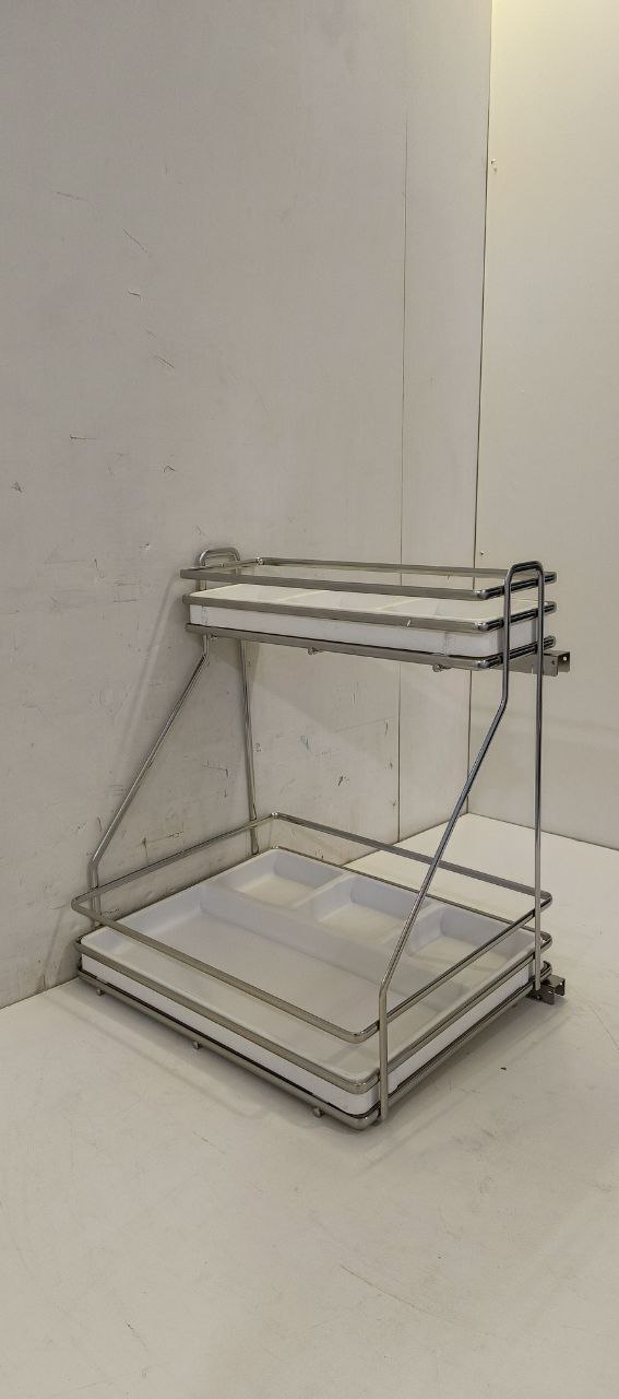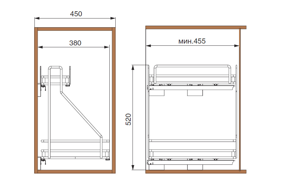 Кассетница для хоз. принадлежностей правая с двумя уровнями полок за распашной фасад шириной от 450 мм.