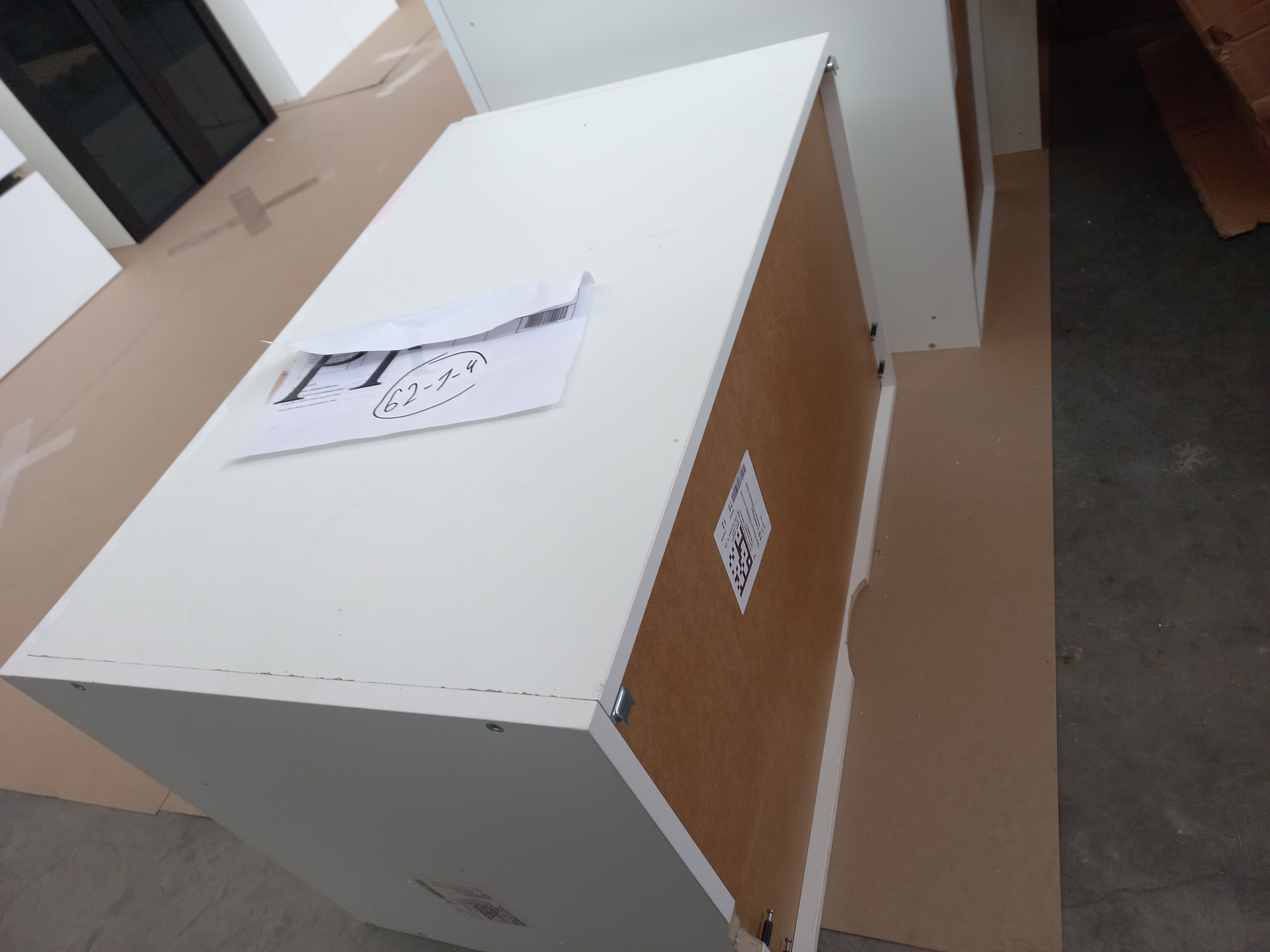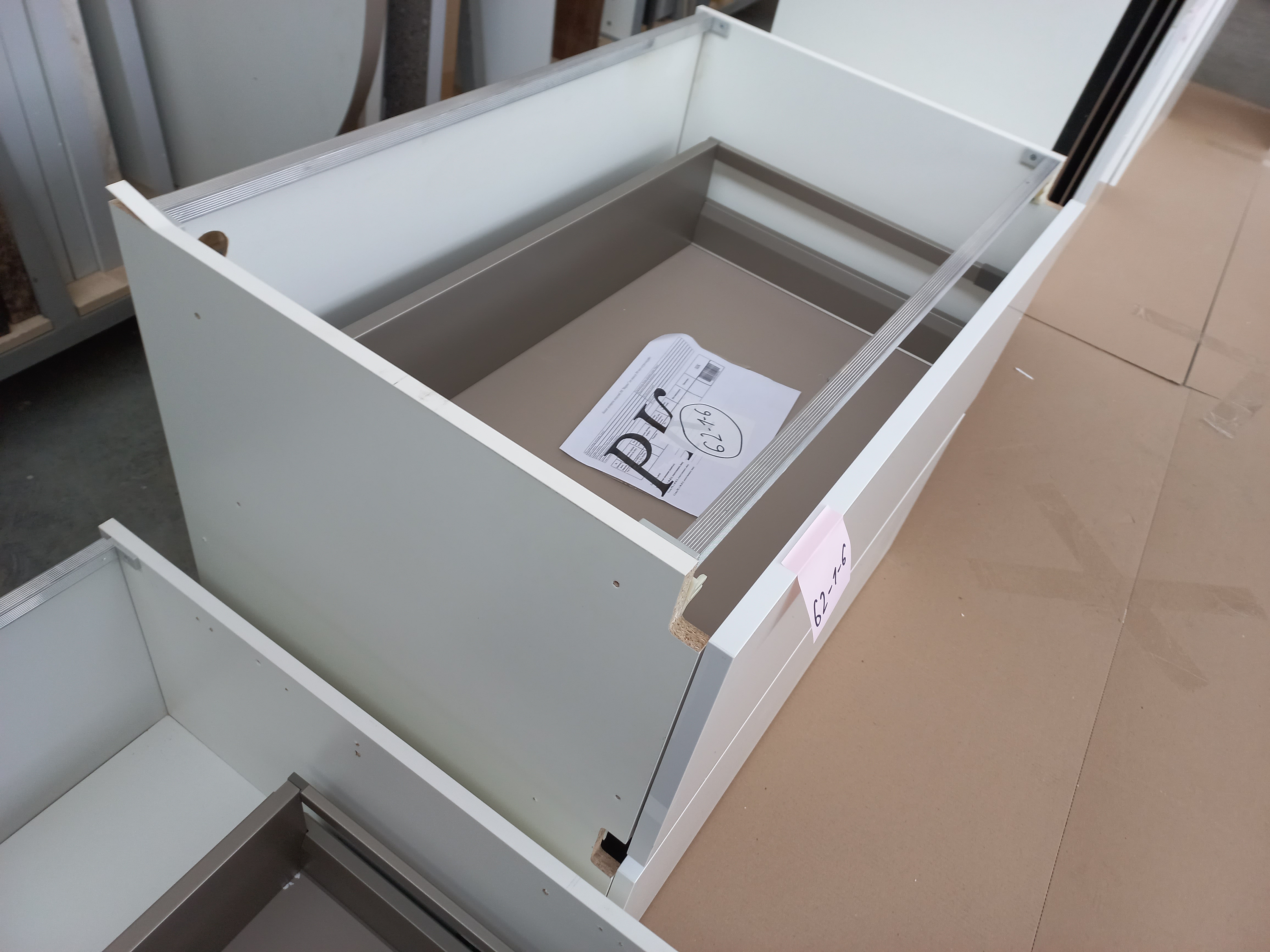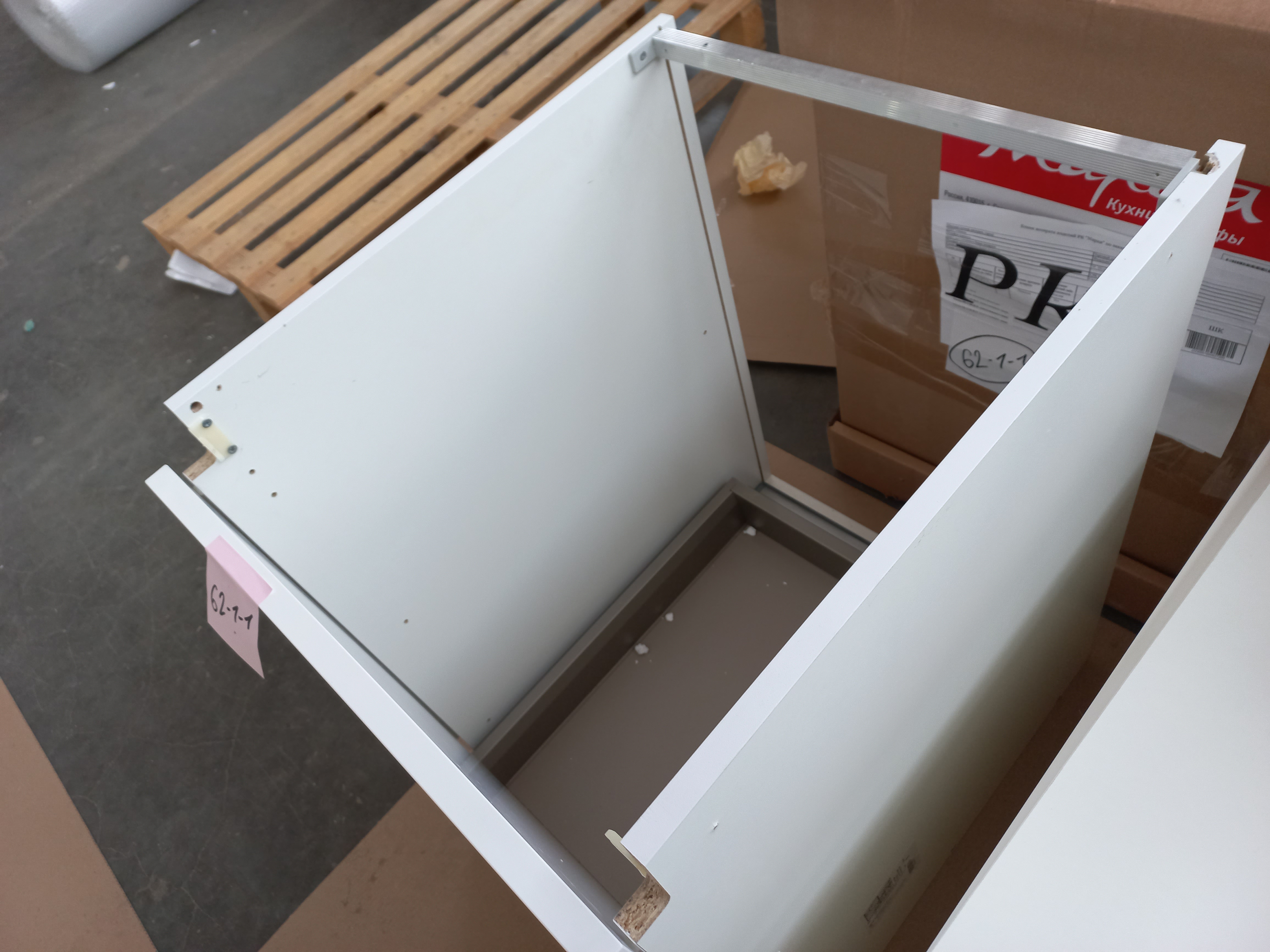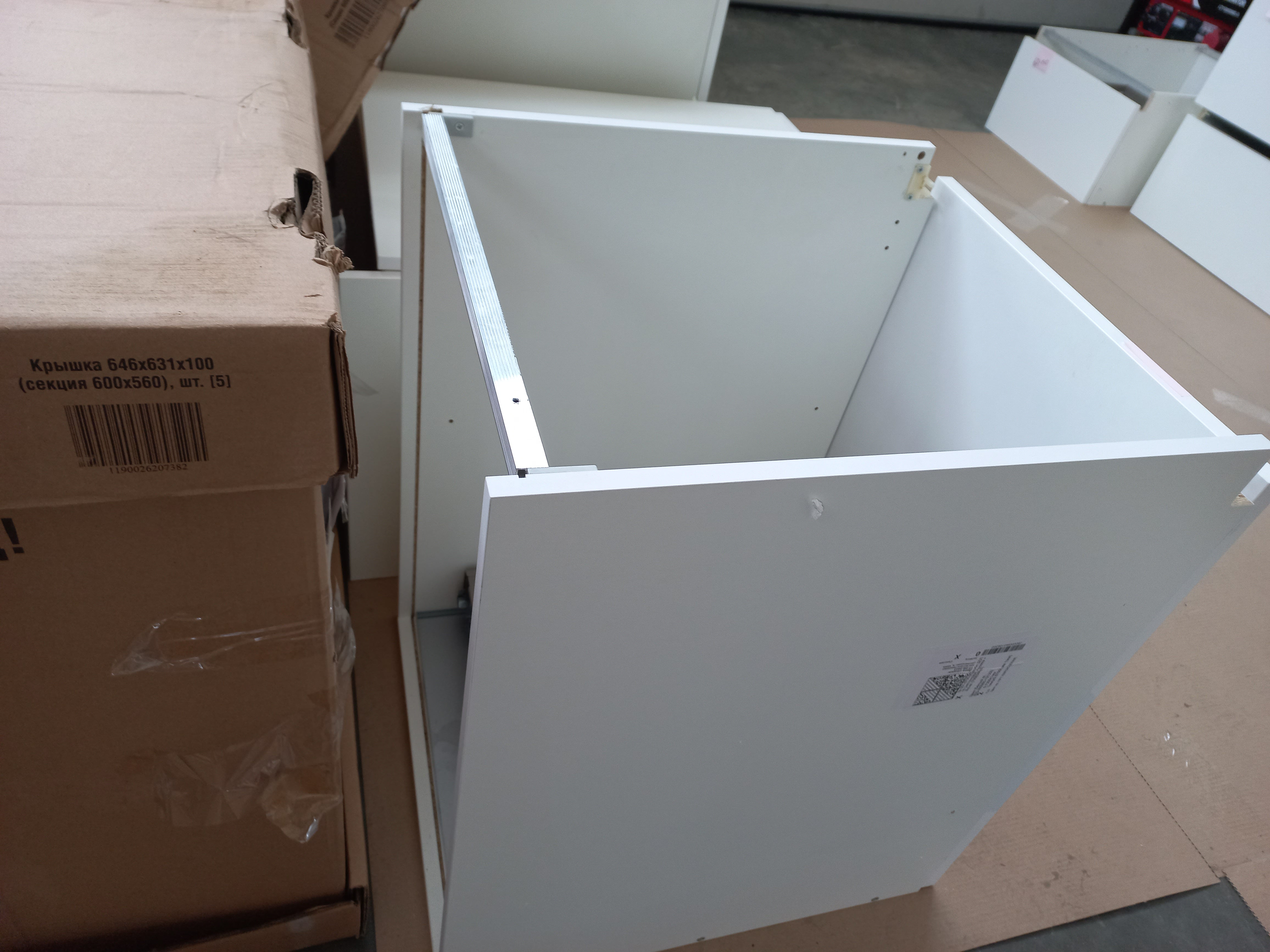 Внешний вид, описание дефектов: Возможно присутствие незначительных потертостей и царапин. Сколы, царапины, вырезы каркаса. В некоторых секциях сломаны: скрепляющие части каркаса и элементы каркаса рядом с профилем GOLA (см. фото). Секция над варочной панелью под встраиваемую вытяжку, с фасадным дном снизу (см. фото). Нестандартные глубины секций подразумевают свес столешницы сзади 200мм.