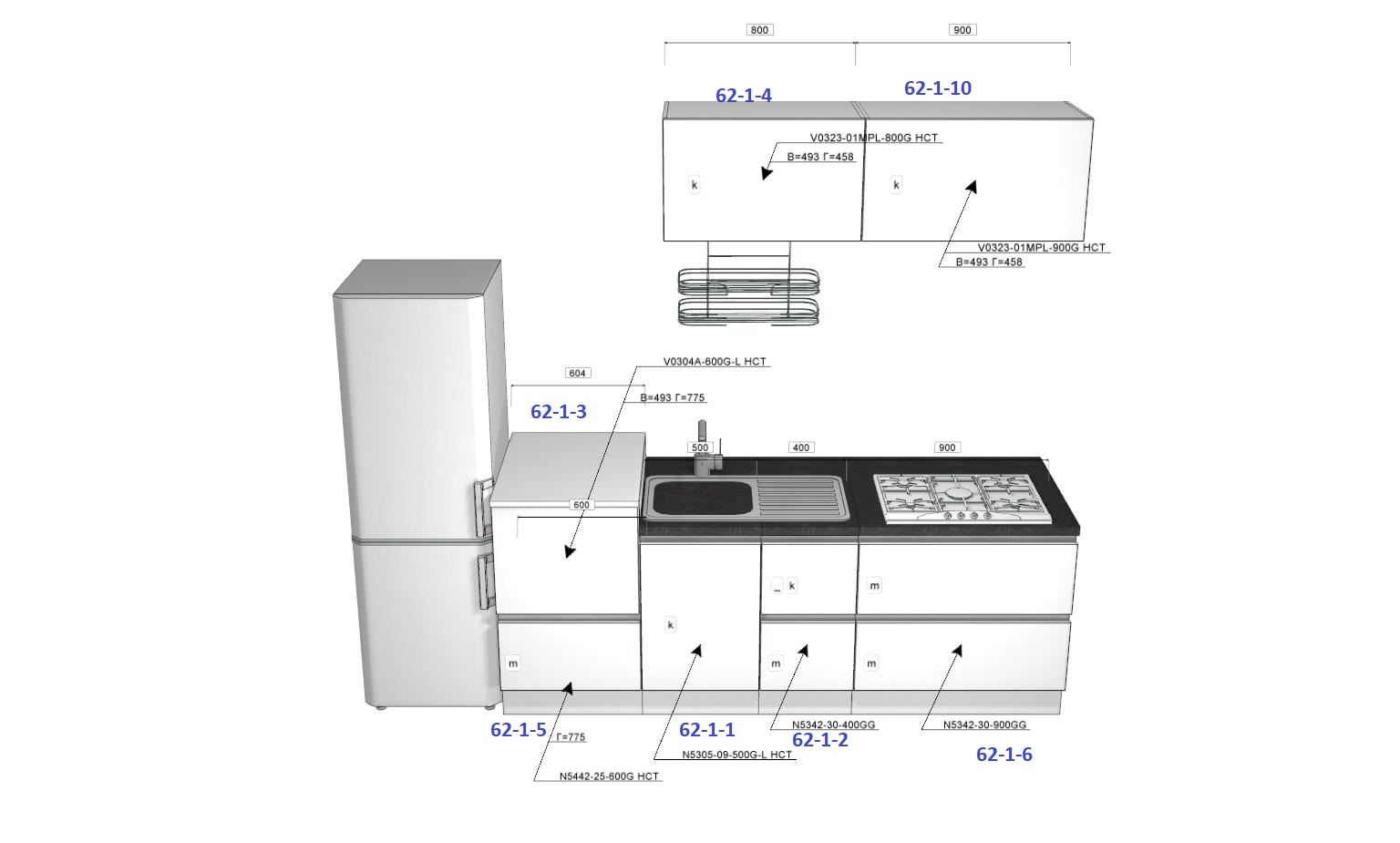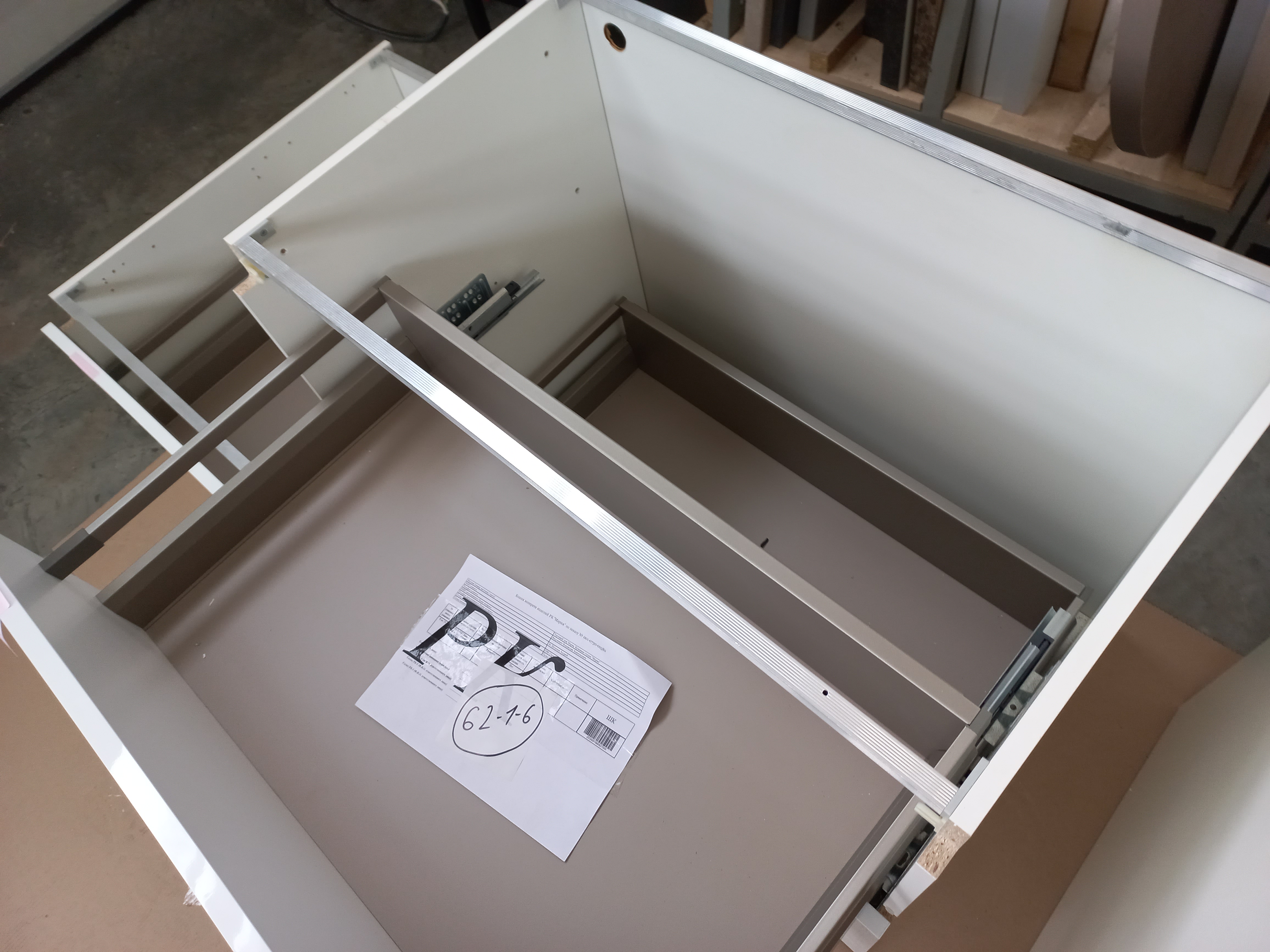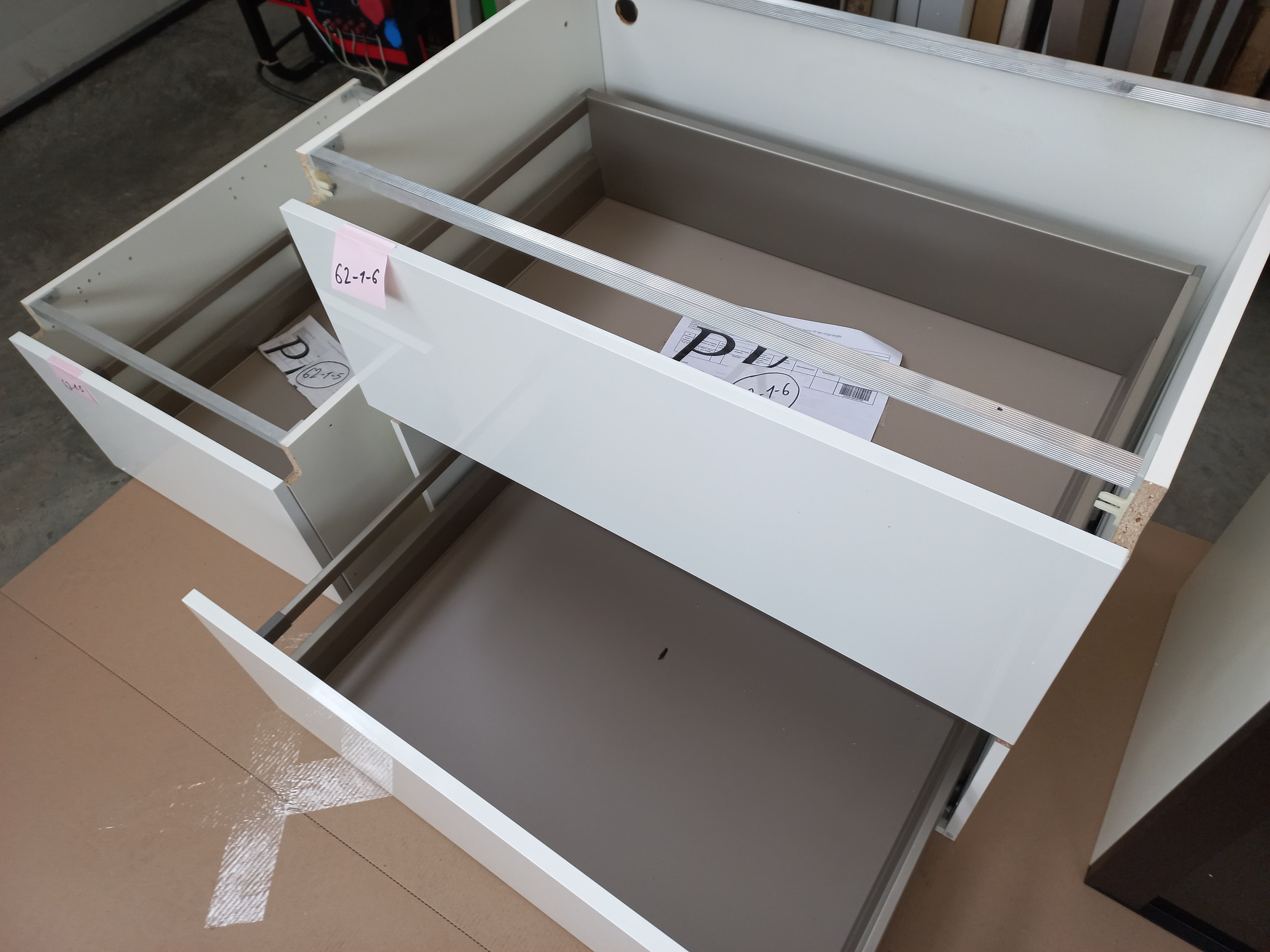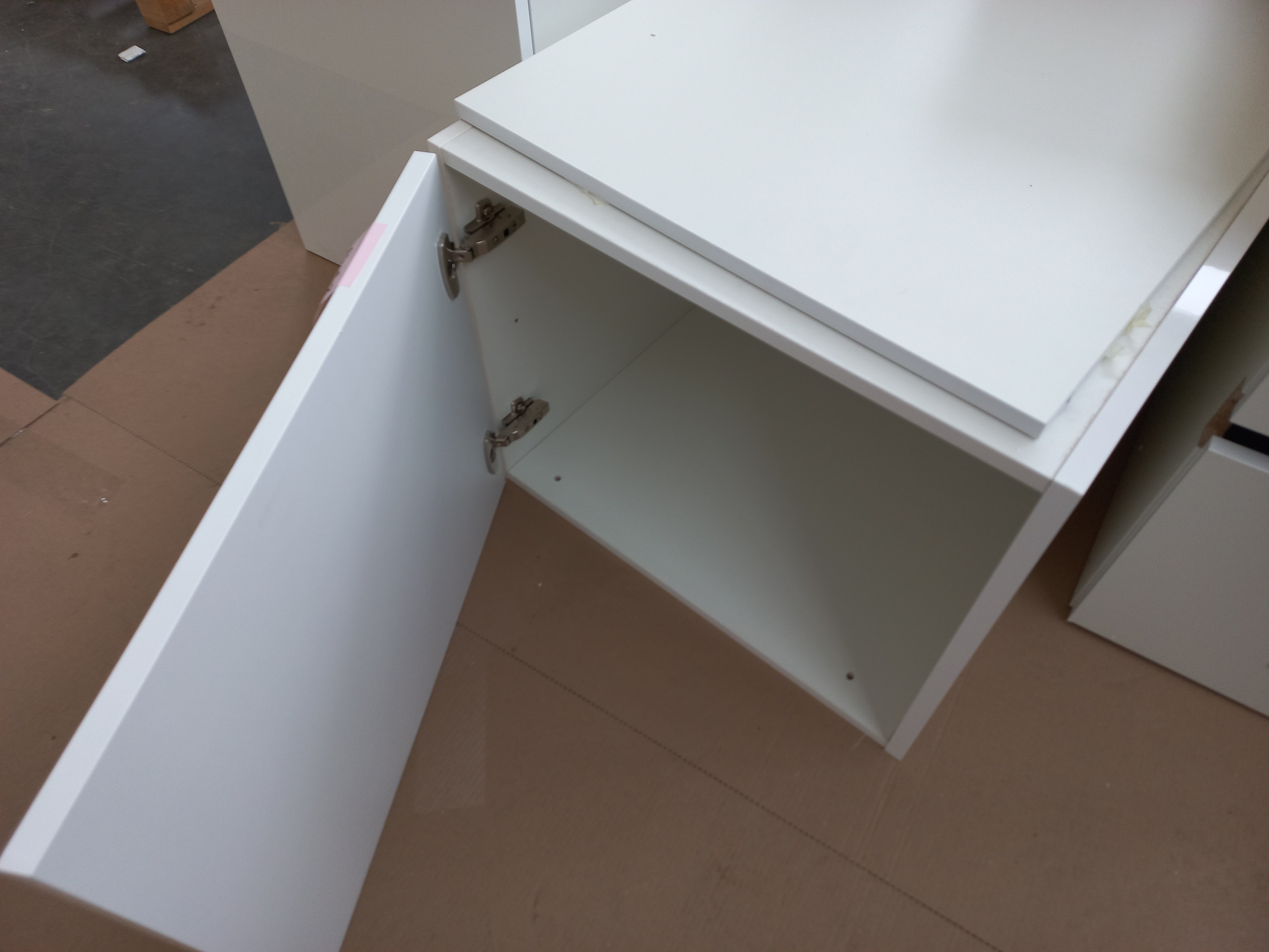 Внешний вид, описание дефектов: Возможно присутствие незначительных потертостей и царапин. Сколы, царапины, вырезы каркаса. В некоторых секциях сломаны: скрепляющие части каркаса и элементы каркаса рядом с профилем GOLA (см. фото). Секция над варочной панелью под встраиваемую вытяжку, с фасадным дном снизу (см. фото). Нестандартные глубины секций подразумевают свес столешницы сзади 200мм.