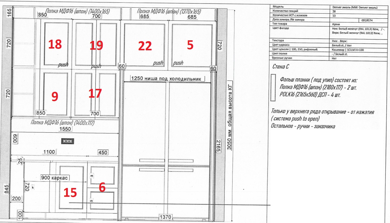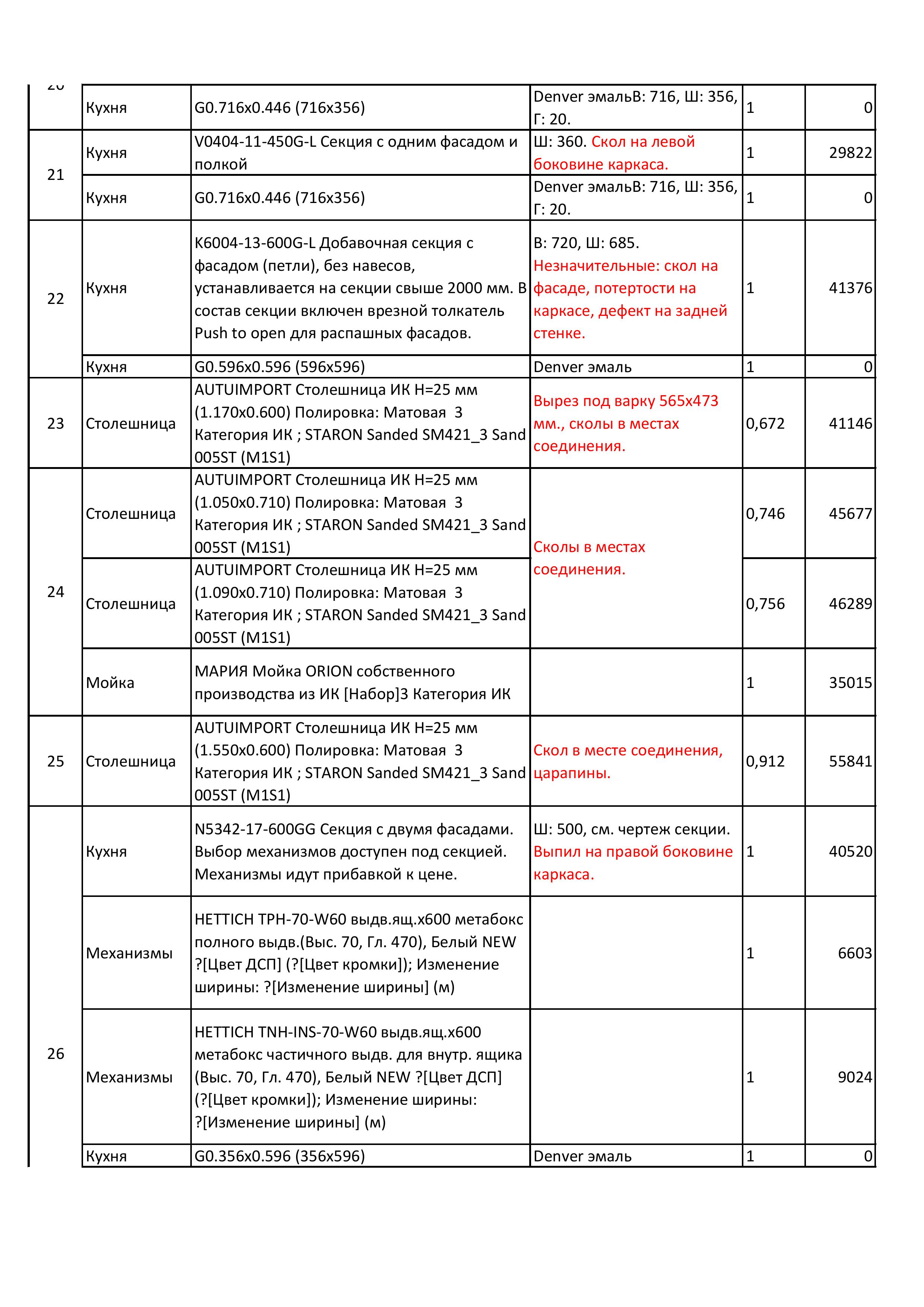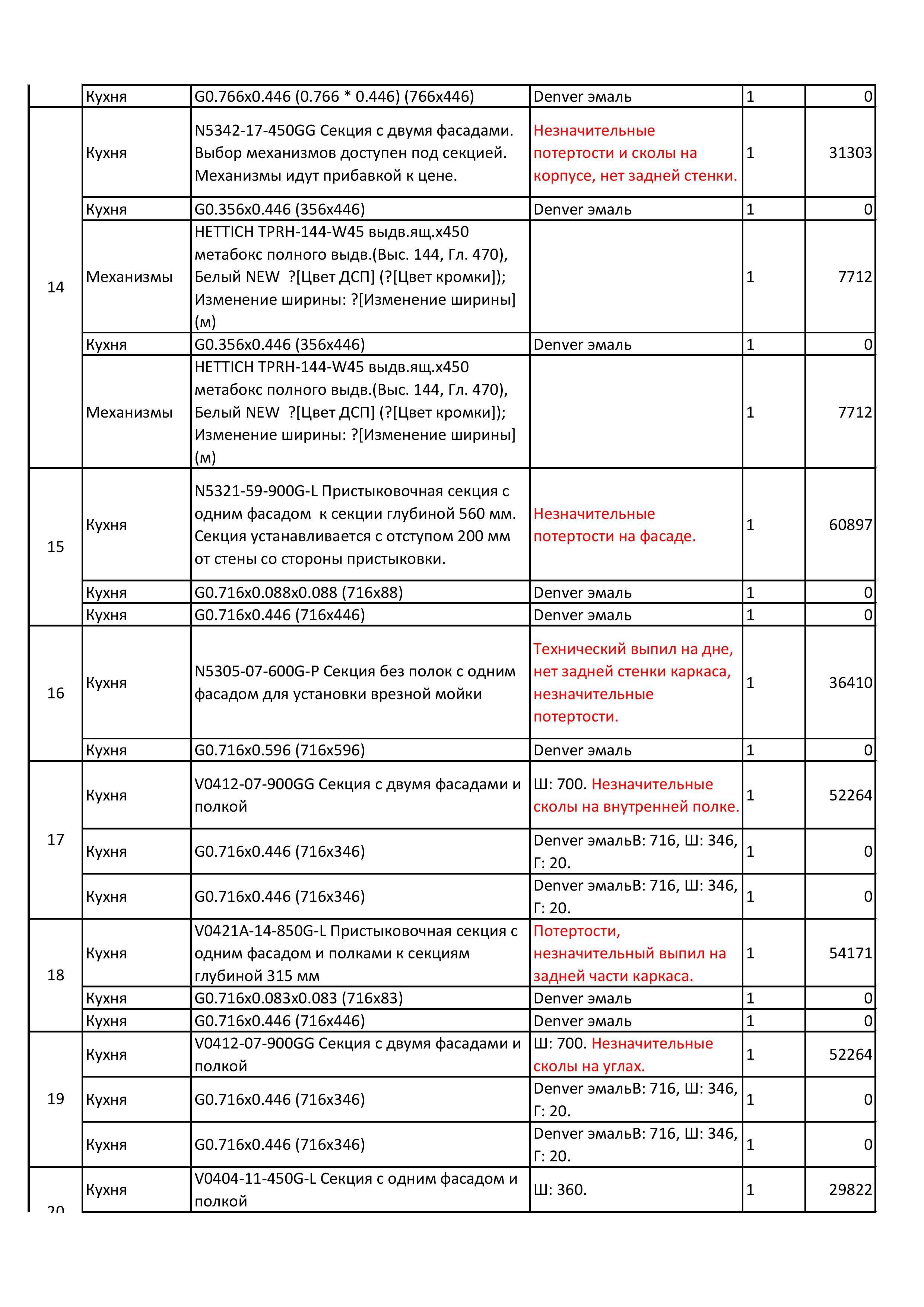 Внешний вид, описание дефектов: Кухонный гарнитур устанавливался! Имеются выпилы и установочные отверстия. В некоторых позициях гарнитура имеются дефекты. Дефекты указаны под номерами секций которые отражены на эскизе и прописаны в спецификации – в характеристиках товара! Во всех остальных позициях дефекты не обнаружены, могут присутствовать незначительные потертости, царапины. Все секции модульные, возможно изменение конфигурации в рамках данных комплектующих.