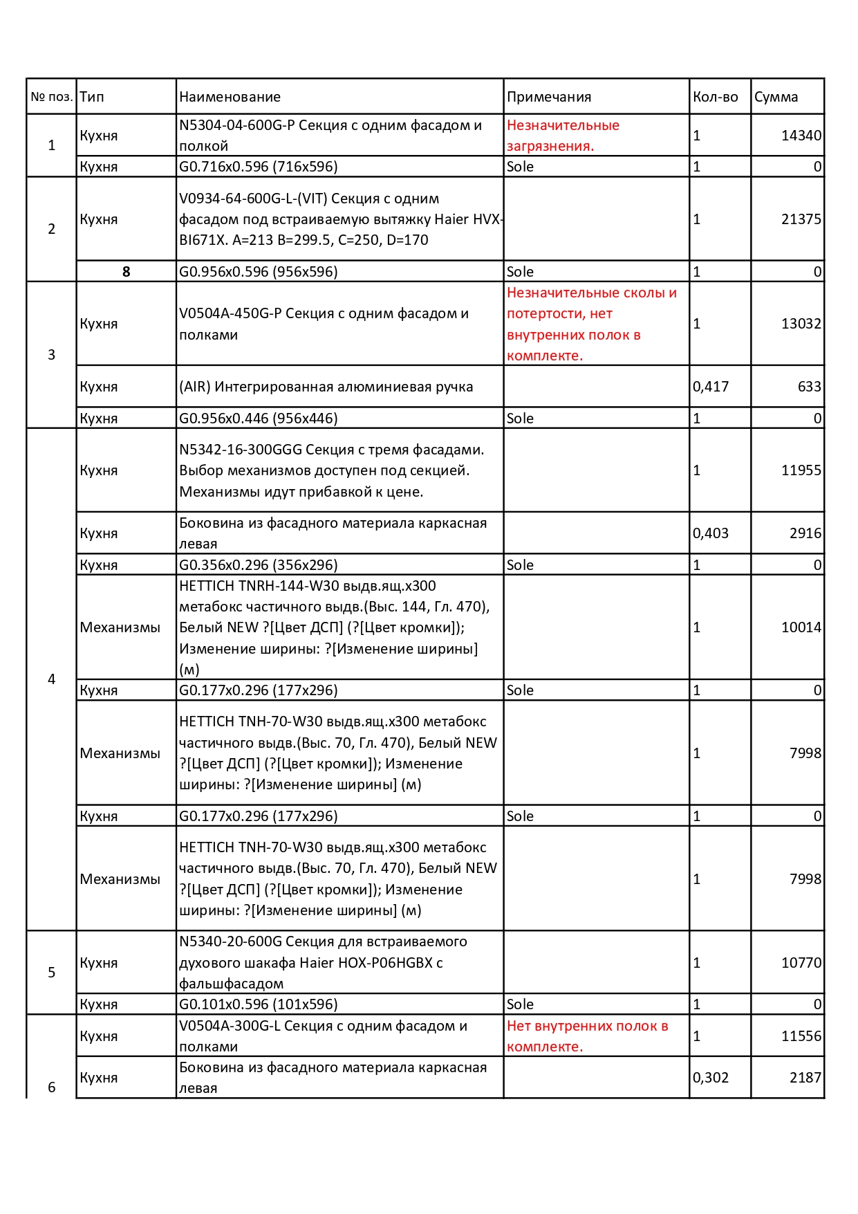 Внешний вид, описание дефектов: Кухонный гарнитур не устанавливался! Имеются незначительные потертости и сколы в верхней секции на 40мм., и незначительные загрязнения на дне секции под мойку. Во всех остальных позициях дефекты не обнаружены, могут присутствовать незначительные потертости, сколы, царапины. В секции под ПММ предусмотрен только фасад. Все секции модульные, возможно изменение конфигурации в рамках данных комплектующих.