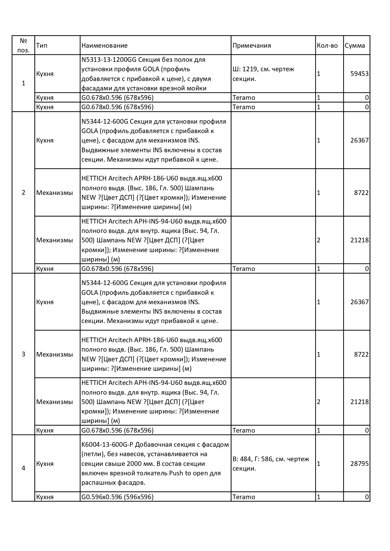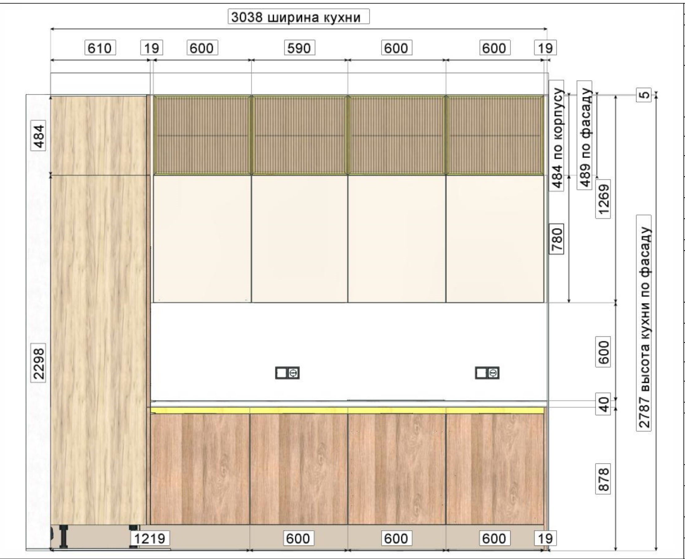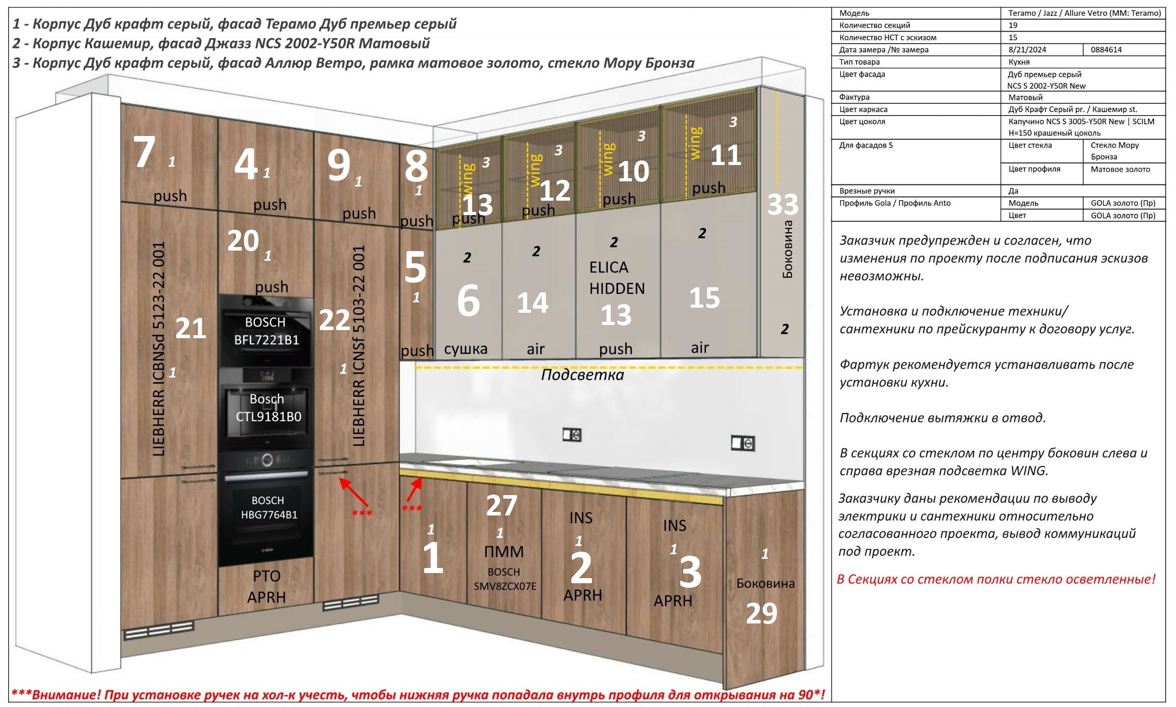 - (19 шт.) секции с фасадами, фасад под ПММ + накладные боковины…