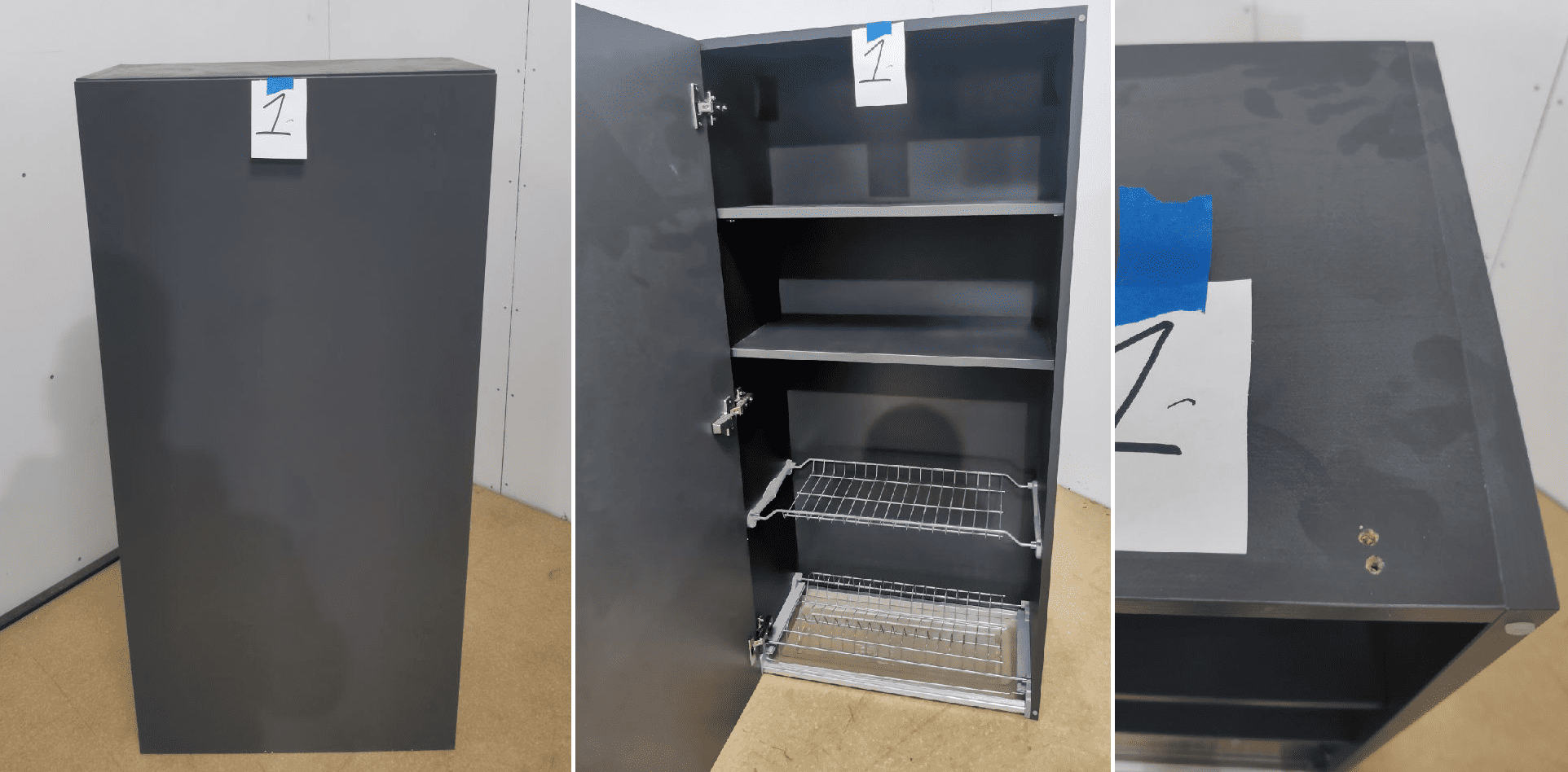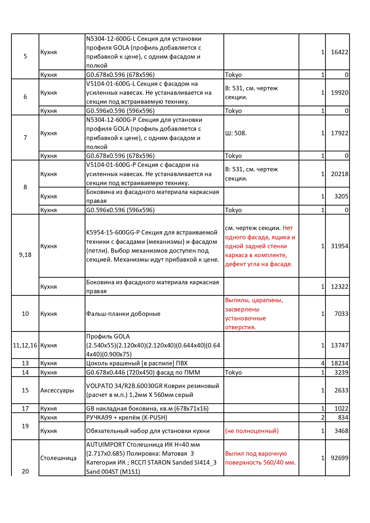 Внешний вид, описание дефектов: Кухонный гарнитур устанавливался! Эксплуатировался не длительный период. Имеются выпилы, установочные отверстия и незначительные загрязнения. В некоторых позициях гарнитура имеются дефекты. Дефекты указаны под номерами секций которые отражены на эскизе и прописаны в спецификации – в характеристиках товара! Во всех остальных позициях дефекты не обнаружены, могут присутствовать незначительные потертости, царапины. В секциях под технику предусмотрены только фасады. Все секции модульные, возможно изменение конфигурации в рамках данных комплектующих.