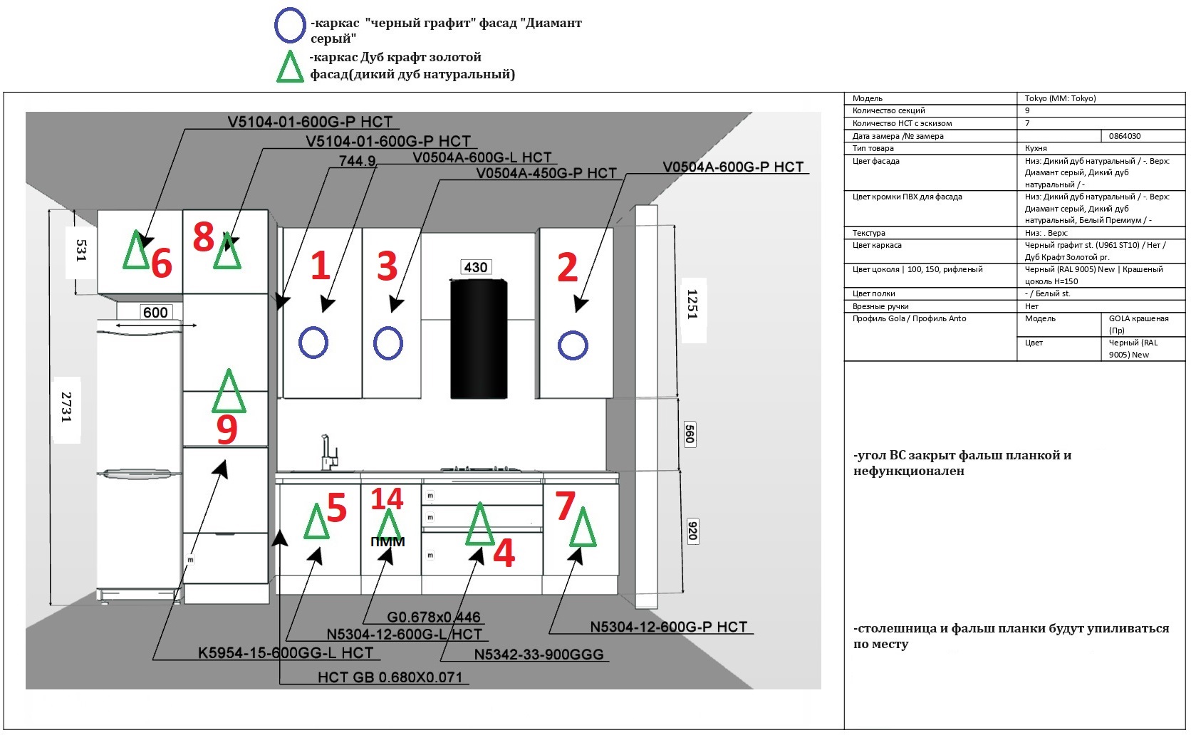 - (9 шт.) секции с фасадами, накладные боковины + фасад под ПММ