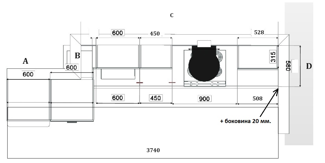 Размер Кухни слева направо В/Ш/Г: 2731/3740/685 мм. (см. эскизы)