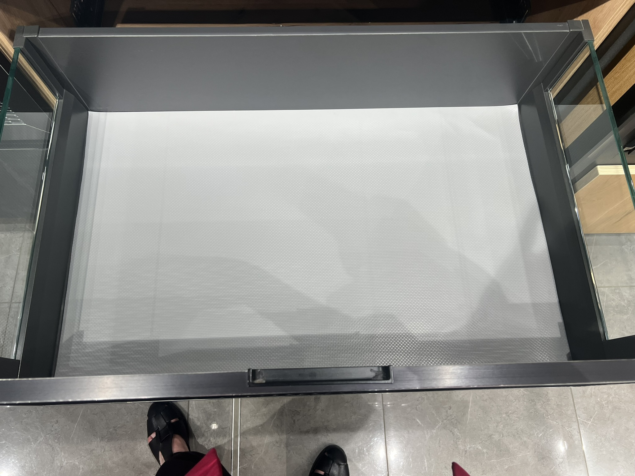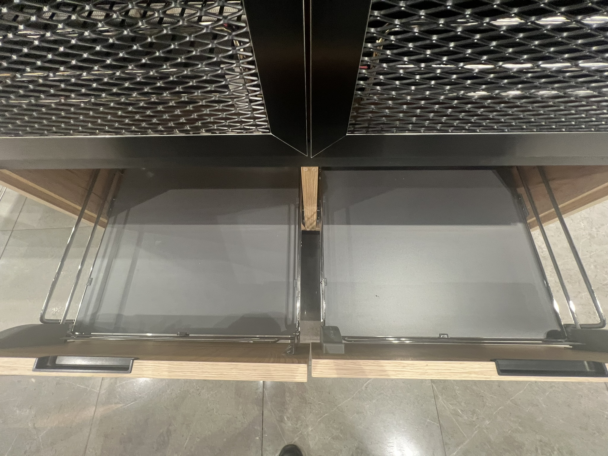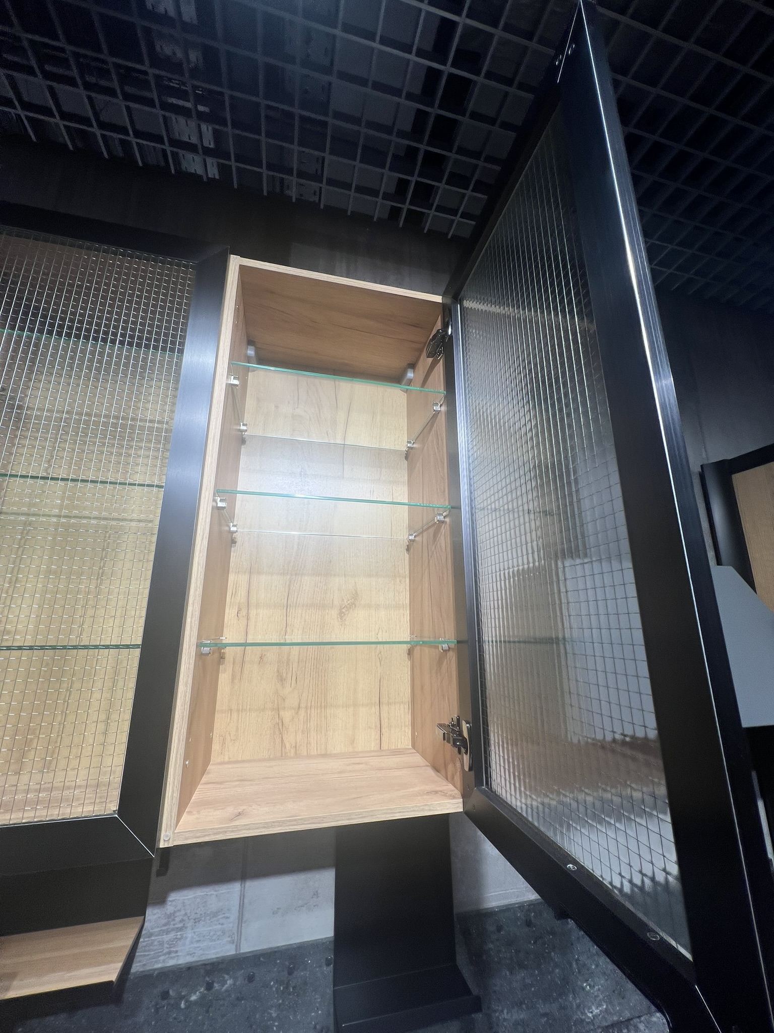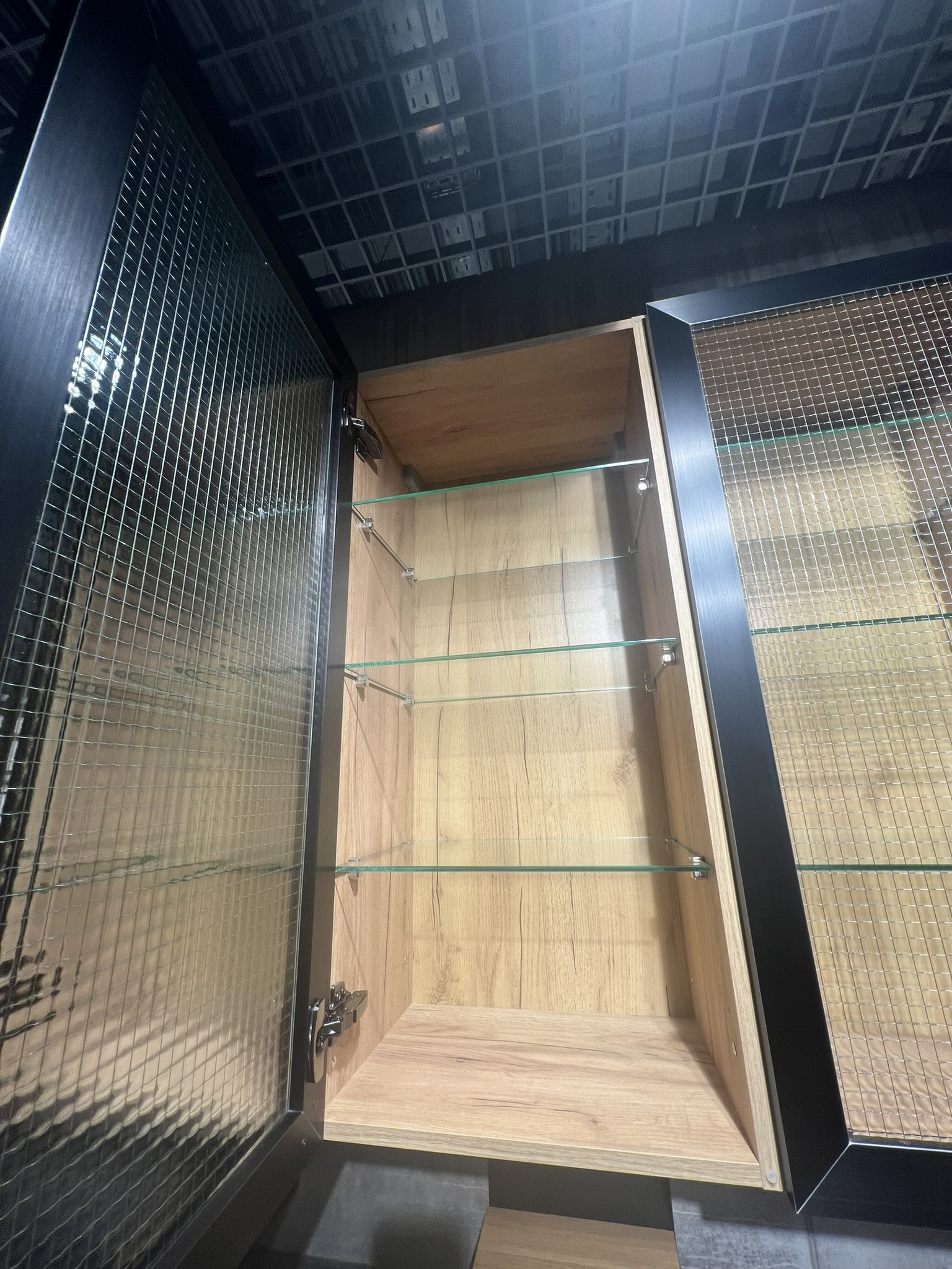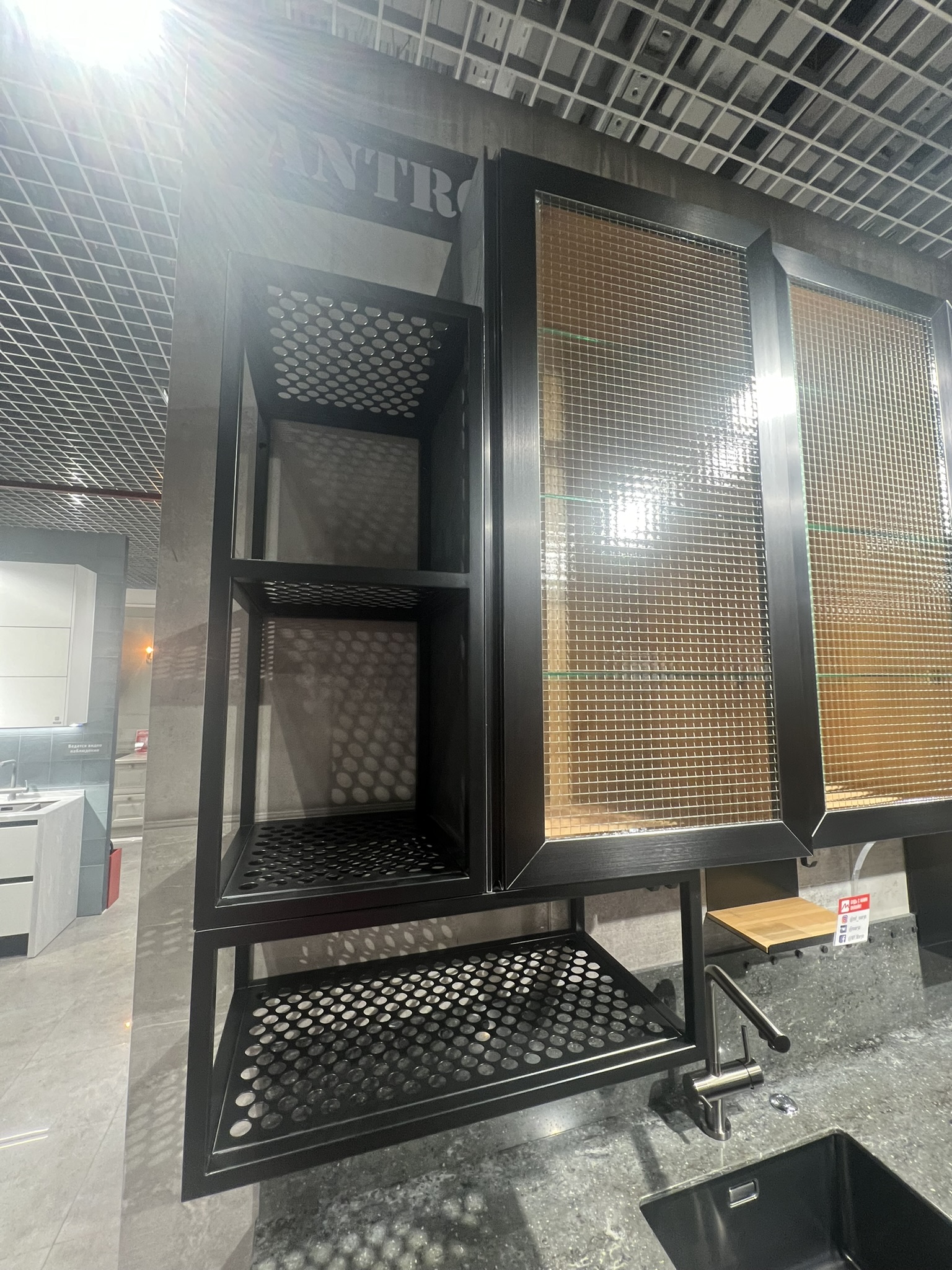 VETRO – черная алюминиевая рама толщиной 20,5 мм с тремя видами вставки на выбор: перфорированная, просечно-вытяжная и прозрачное армированное стекло. Эти фасады создают индустриальный образ модели, придают кухне брутальный характер с нотками винтажа.