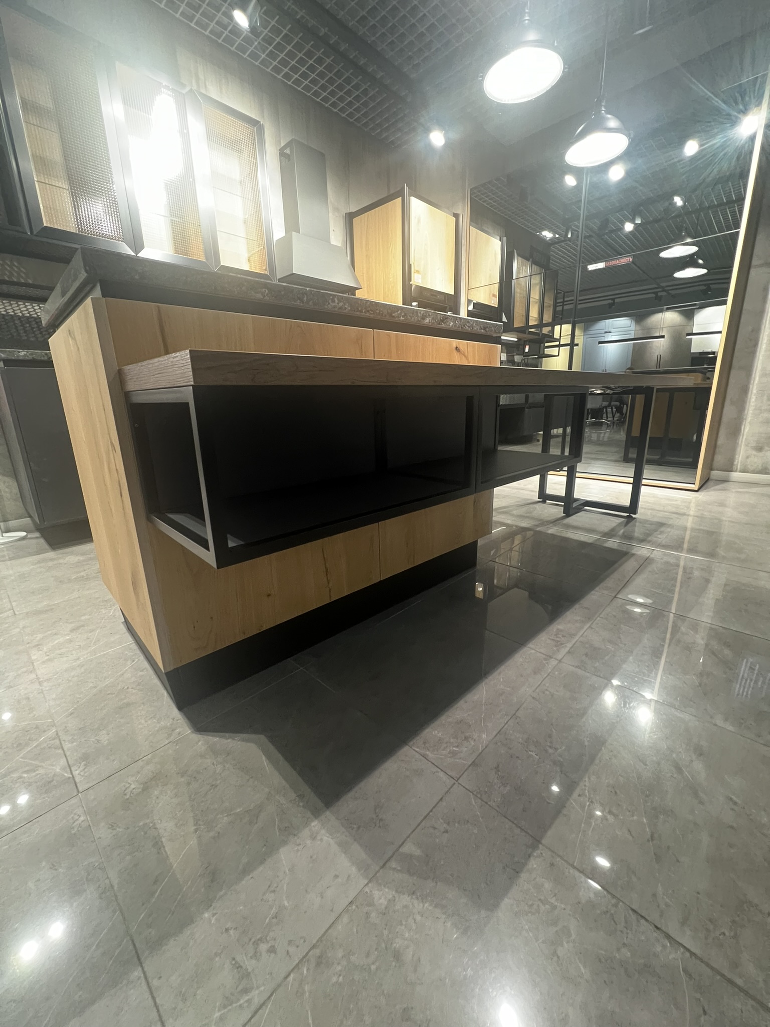 с простотой форм. Для создания особенного брутального образа используются фасады из алюминиевой рамы с грубой перфорацией и армированным стеклом. Каркас и ящики в цвете «антрацит», невидимые ручки, эксклюзивные аксессуары – все элементы кухни дополняют друг друга, складываясь в единую композицию. Гармония темных оттенков также подчеркивает индустриальный стиль. Разнообразие текстур, фактур и декоров позволяет воплощать в жизнь самые смелые дизайнерские решения.