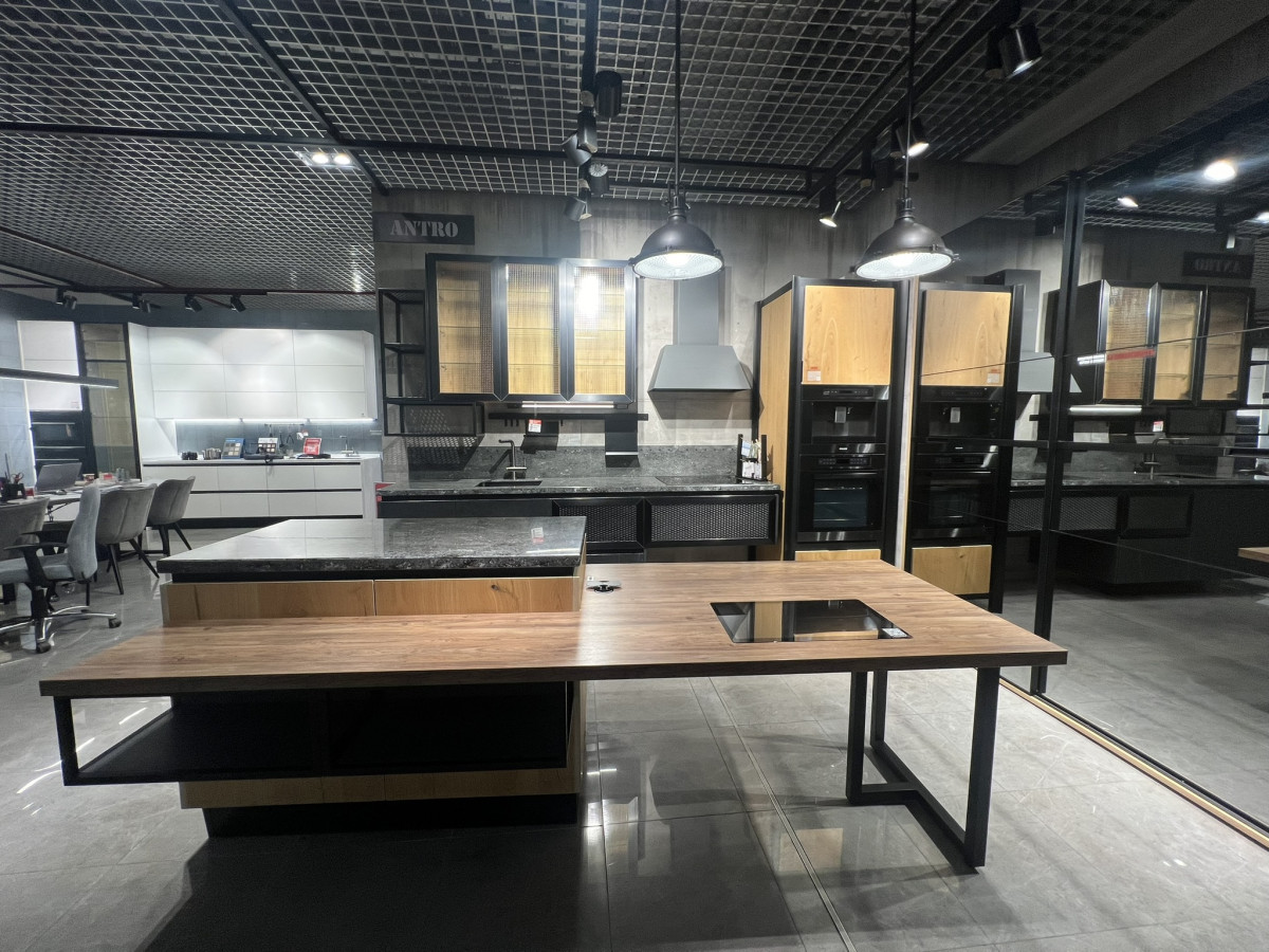 Описание модели AntroИзысканная брутальность – именно так можно охарактеризовать новые кухни Antro. Название коллекции, выполненной в модном стиле лофт, в переводе с итальянского языка означает «пещера». В отделке фасадов используются природные материалы – натуральный сланец или американский орех. Красота натуральных материалов идеально сочетается