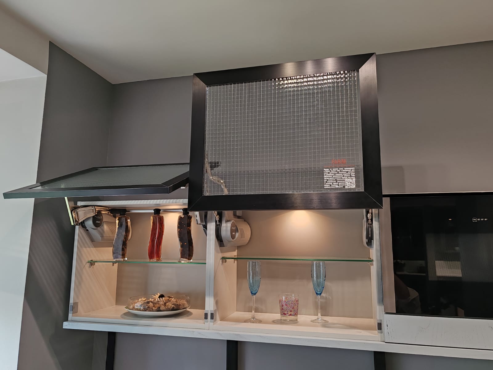 К данной модели кухни в классическом стиле разработана эксклюзивная вытяжка с оригинально функциональной навесной полкой.