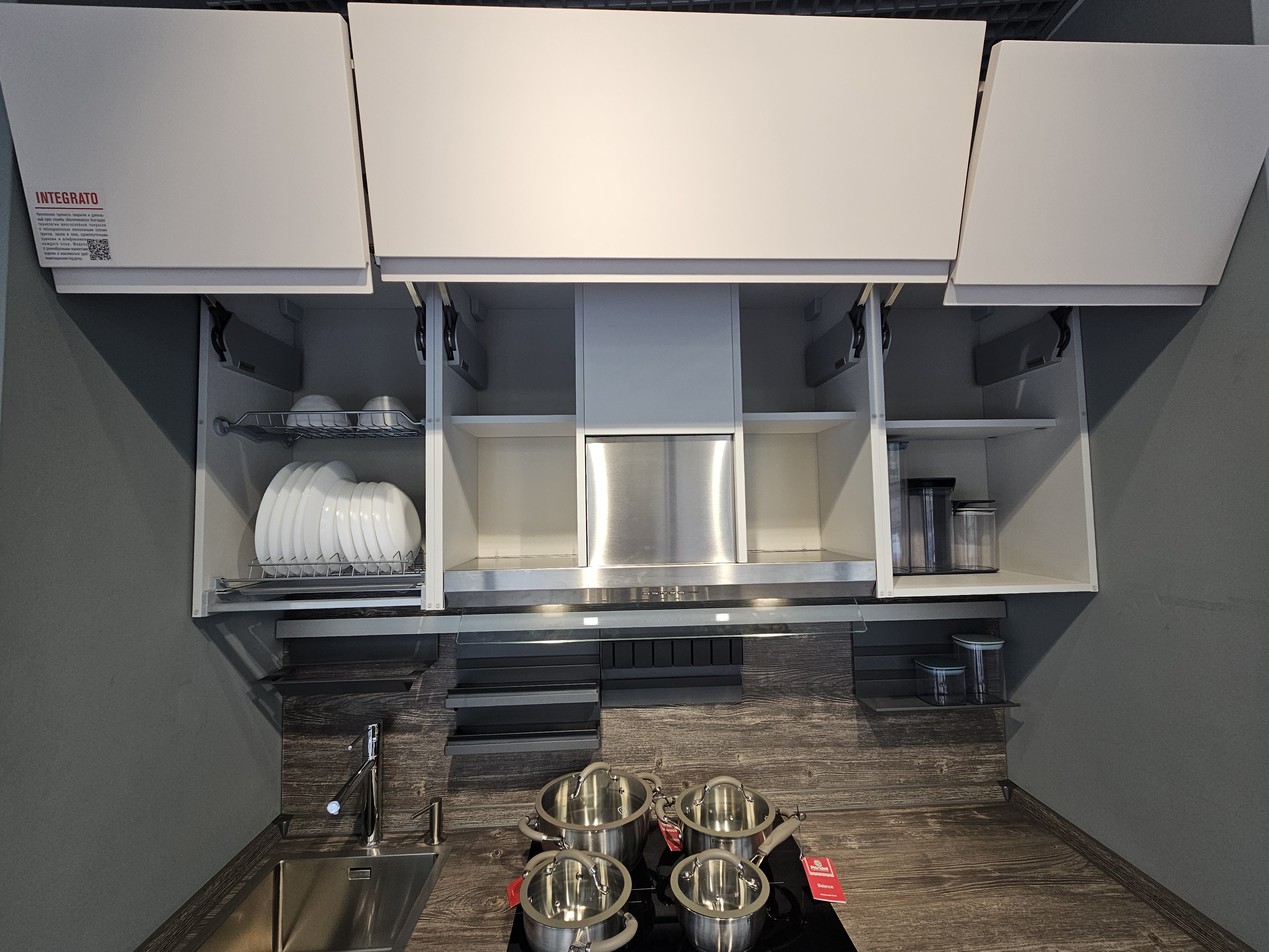 Integrato — это лаконичный образ модели в современном стиле. Особенность модели — оригинальное исполнение фасадов с глубоким вырезом с одной стороны. Вырез исполняет функцию ручек, за счет чего удается сохранить единство образа кухни.