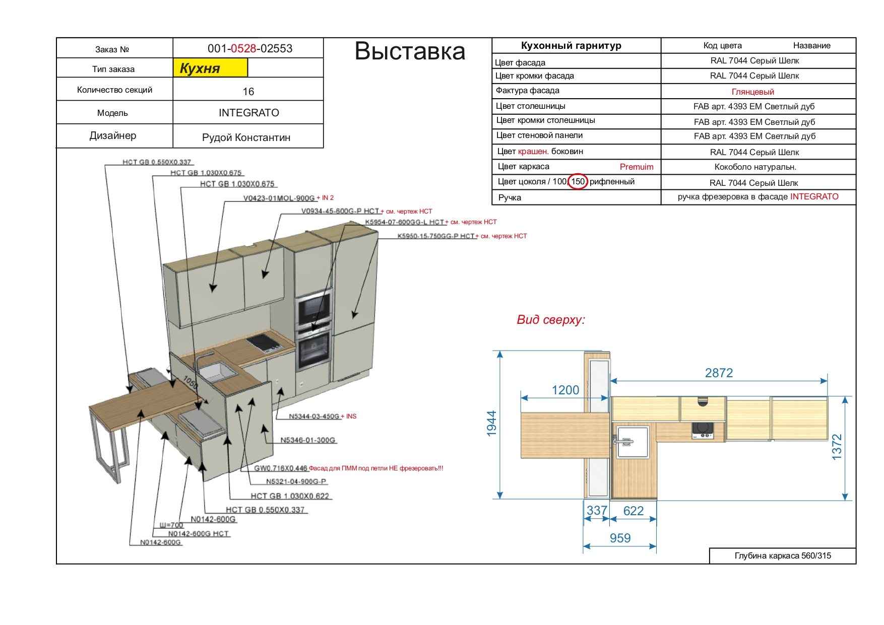 Размер Кухни слева направо: 1372/2872 мм.