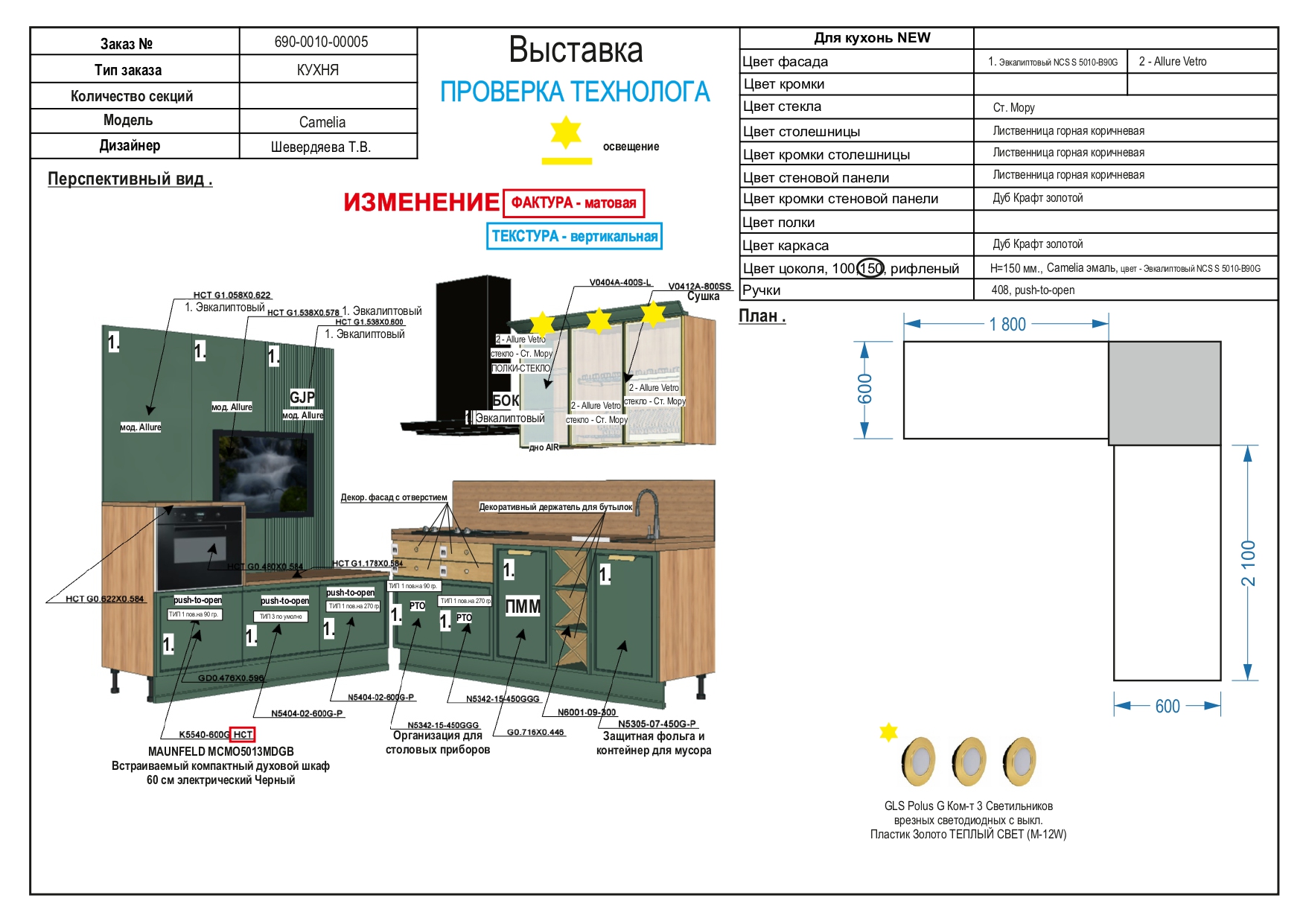 Размер Кухни (зона духового шкафа): В/Ш/Г 2170/1800/600 мм.