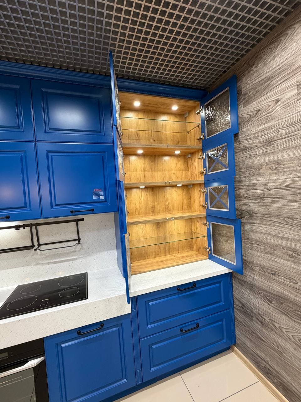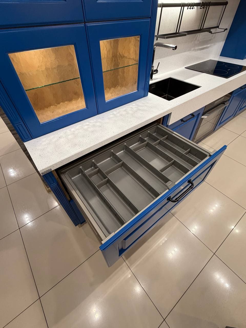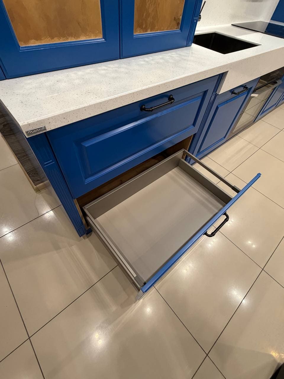 Фасады, выполненные из МДФ 19 мм. Покрытие: лицевая сторона — термопластик, обратная — белый ламинат;