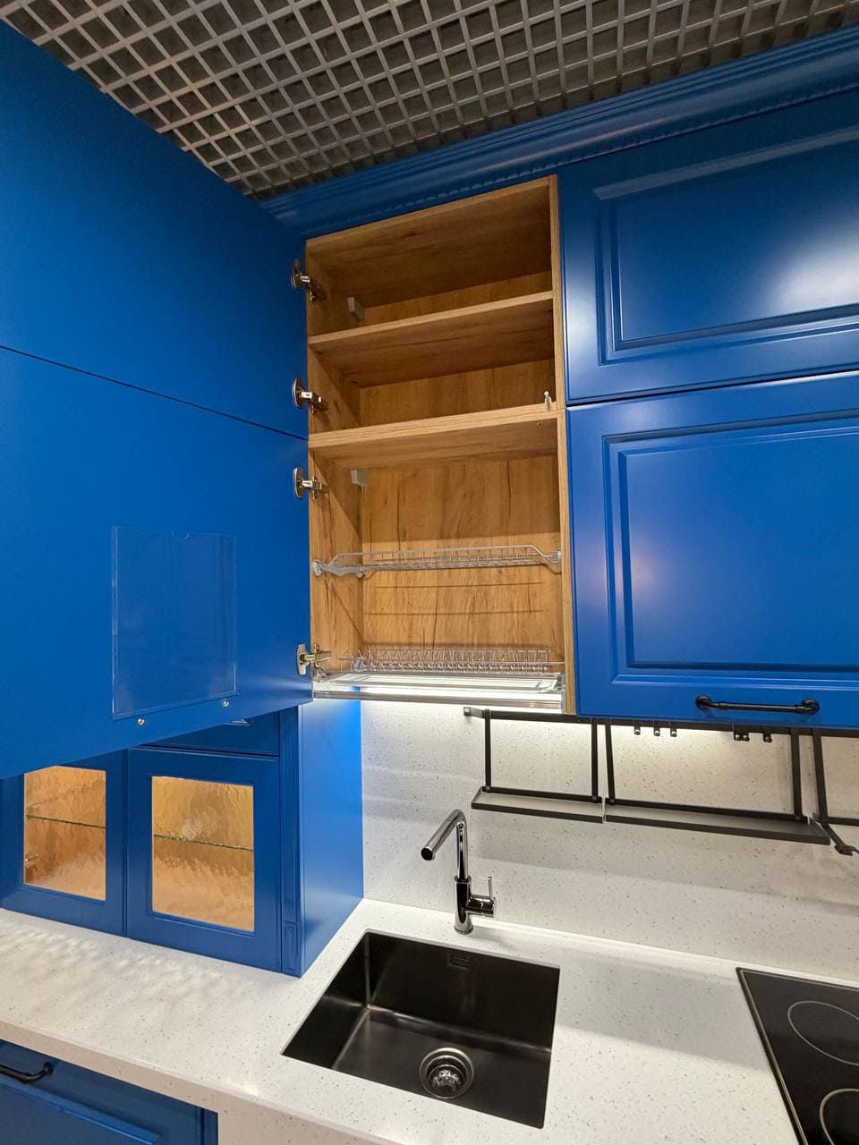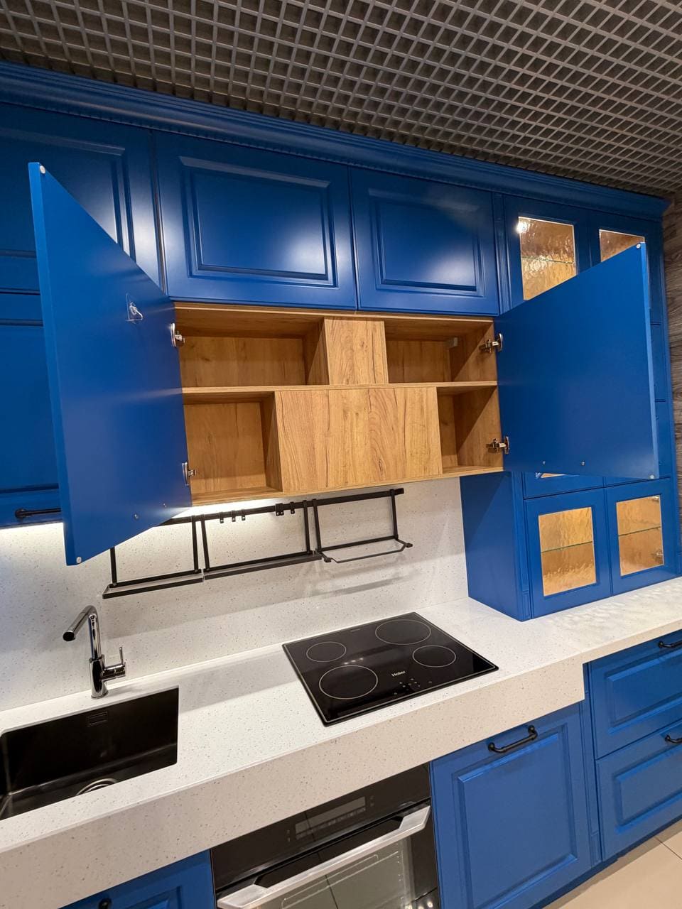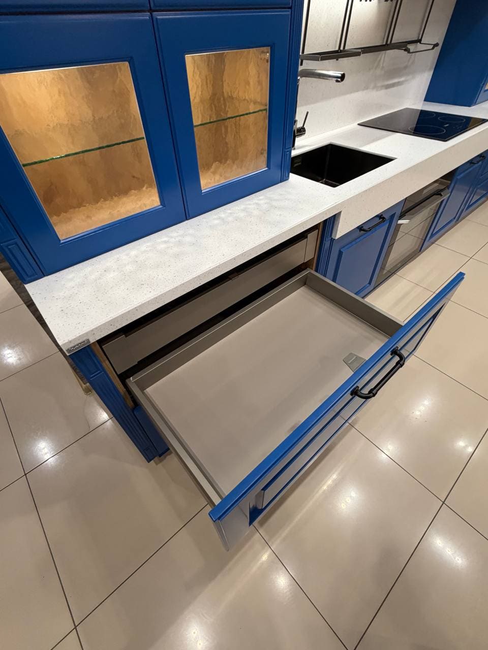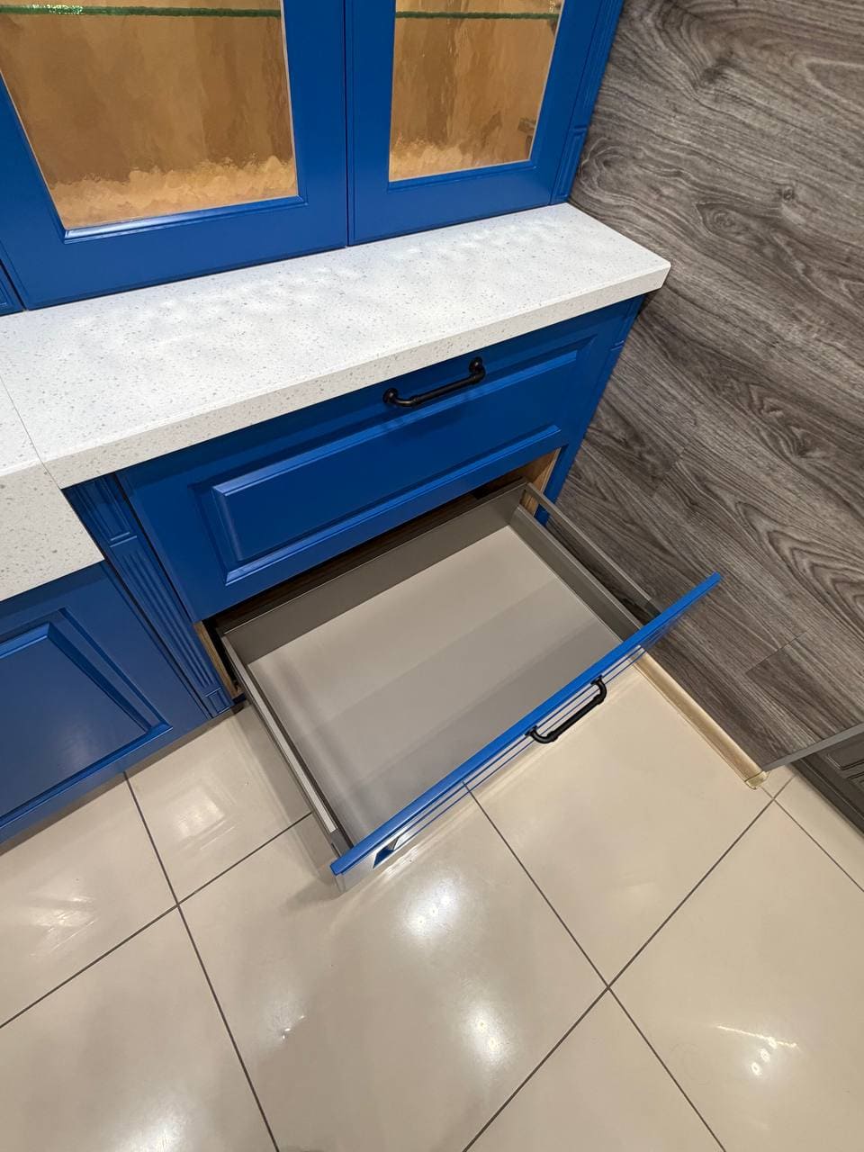 Фасады, выполненные из МДФ 19 мм. Покрытие: лицевая сторона — термопластик, обратная — белый ламинат;