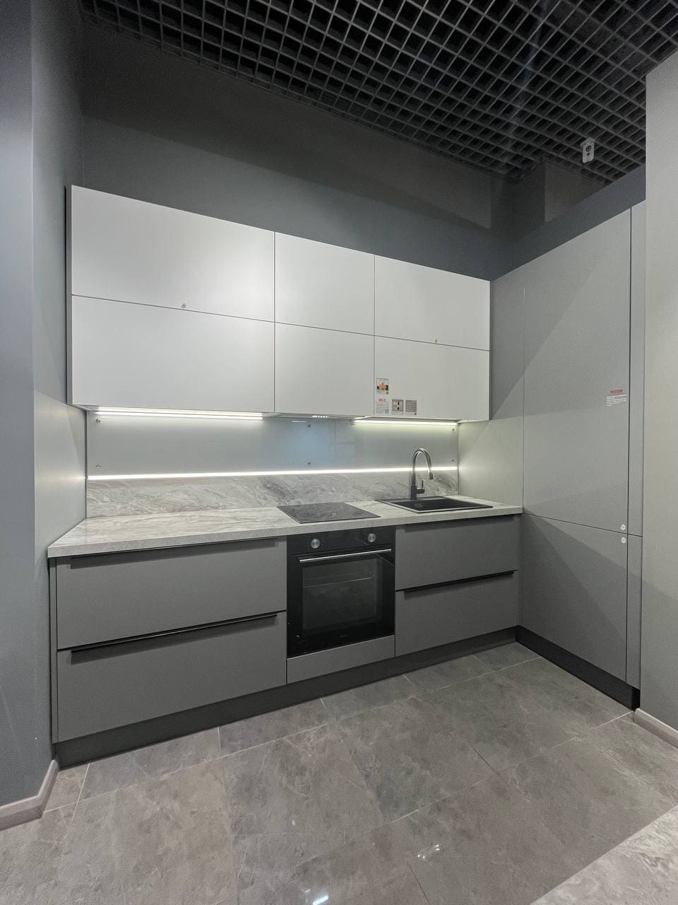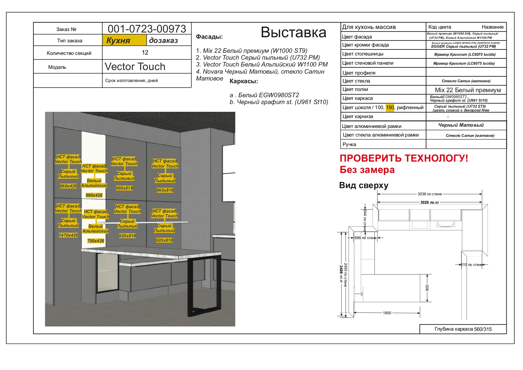 фасады, выполненные из МДФ 20 мм. Покрытие: лицевая сторона — акриловый пластик, обратная сторона — белый ламинат, кромка ABS 1 мм.