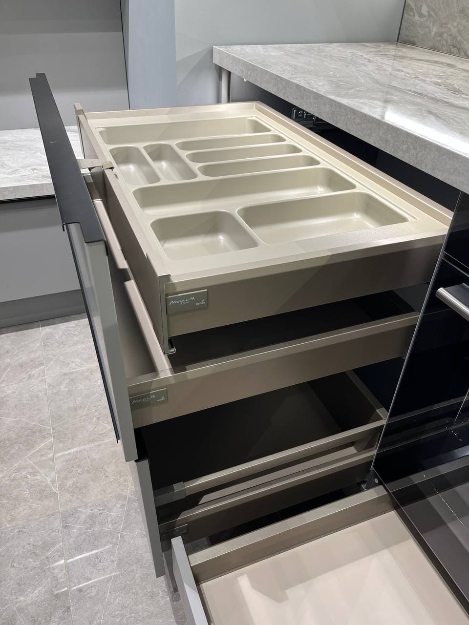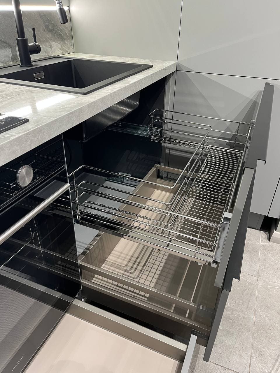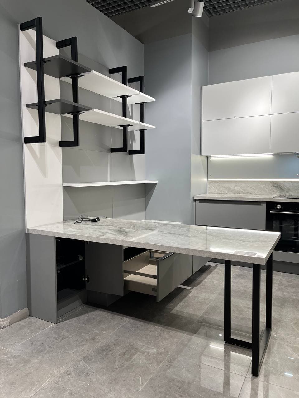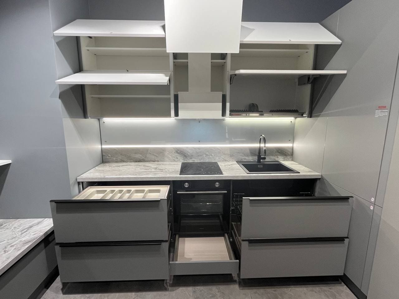 Гарнитур Vector, воплощающий стиль большого города, ультрамоден и бескомпромиссен в своем лаконичном великолепии. Четкие геометрические формы, открытые секции из фасадного материала, уникальные декоративные ящики, V-образные элементы декора создают аскетичный и решительный образ, излучающий ауру уверенности и особого магнетизма. Яркая индивидуальность кухонного гарнитура Vector рождается из сочетания элементов, объединенных единой направляющей идеей.
