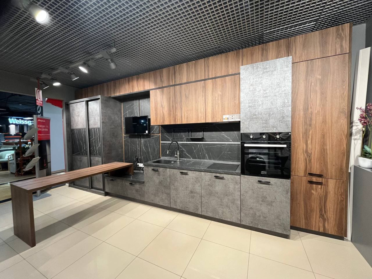 Внешний вид, описание дефектов: Образец упиливался при установке (подгоняли под кривые стены и пол с уклоном). Могут присутствовать незначительные потертости, сколы, царапины. Нет крепежей для 2-х полок сеток. Не включается светодиодная лента (перегорела). Шкаф-купе не входит в данный комплект кухонного гарнитура!