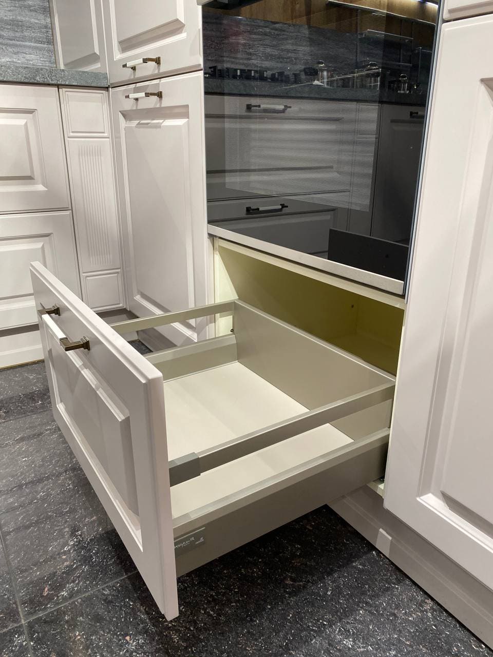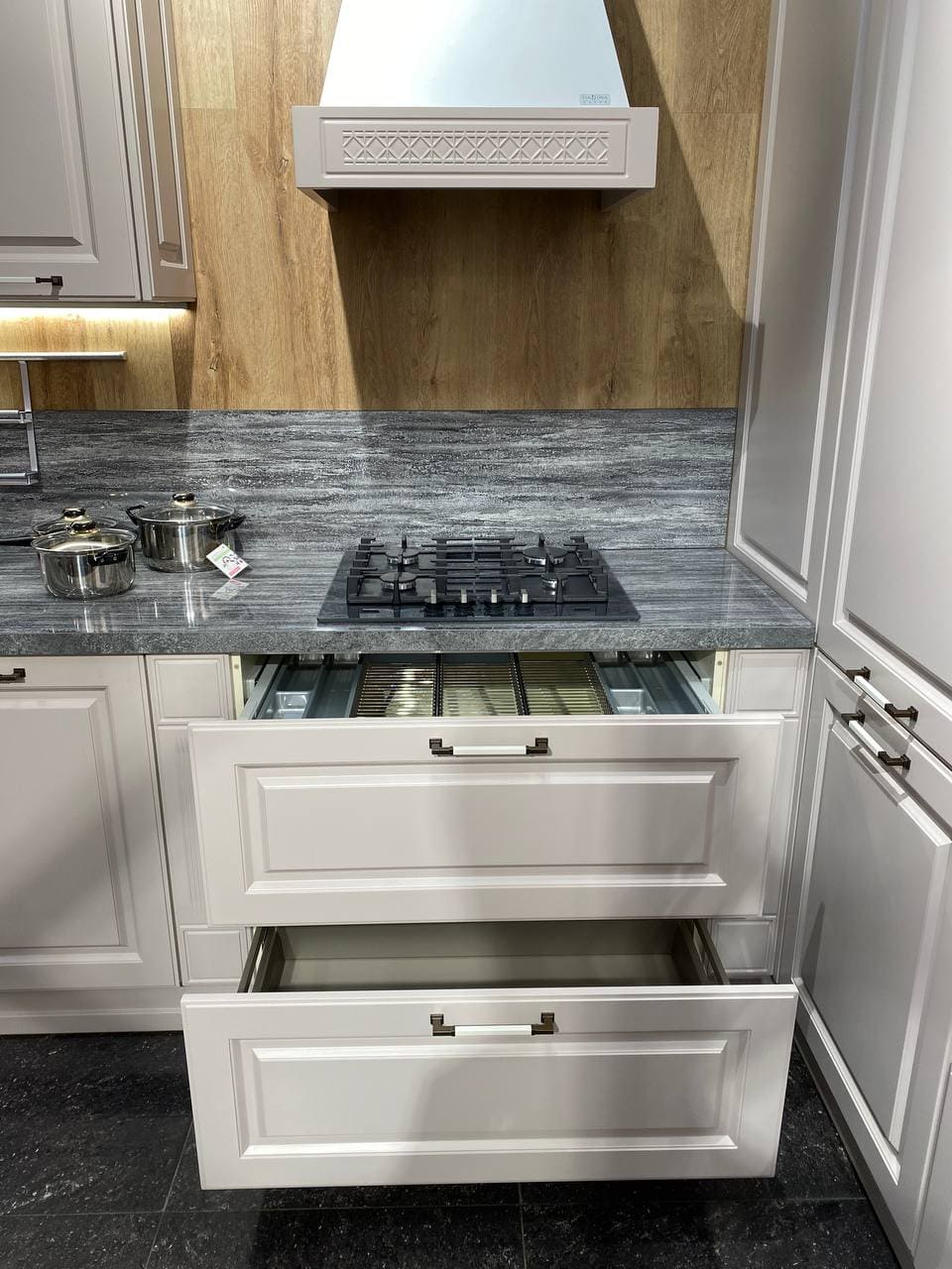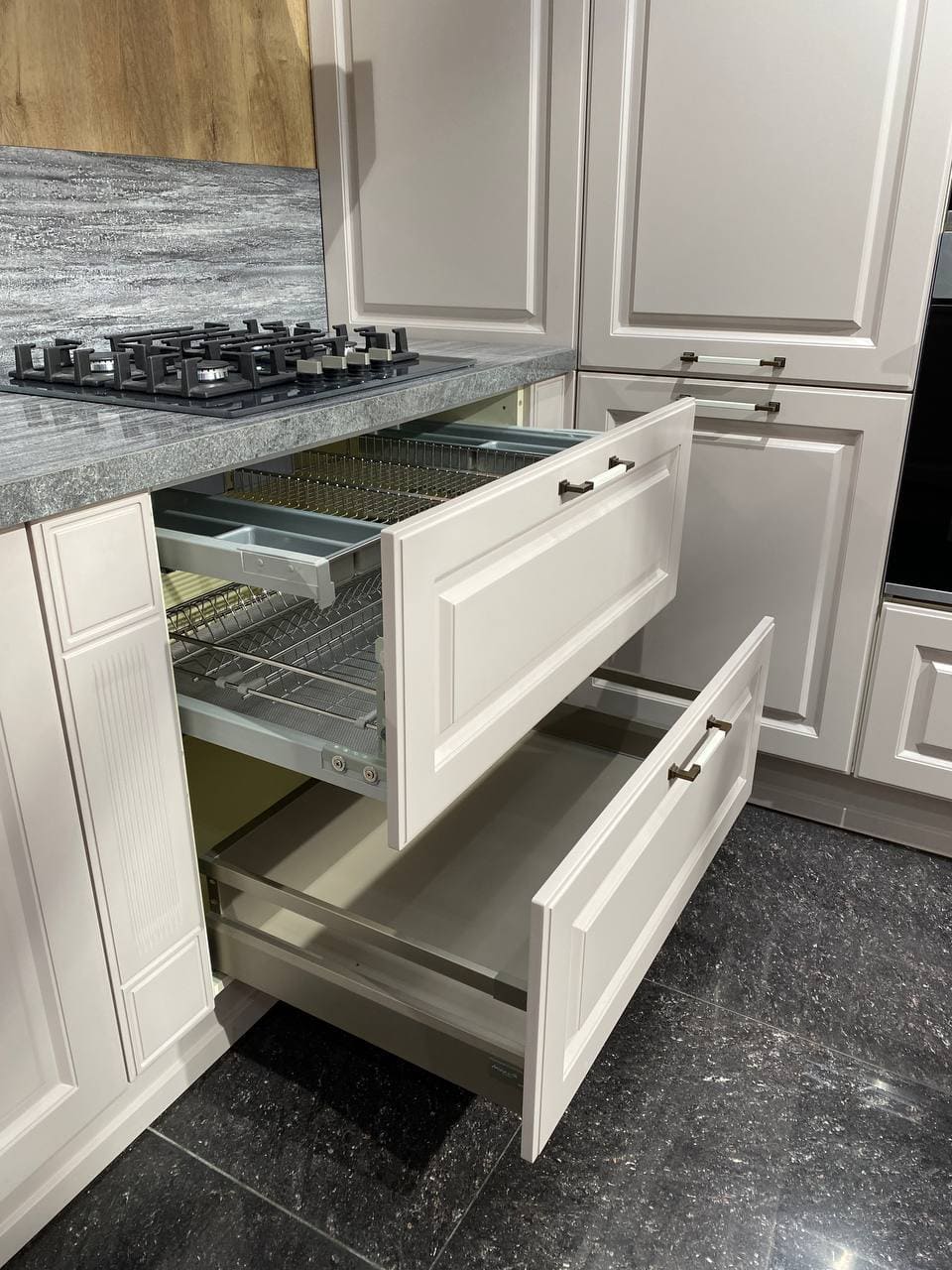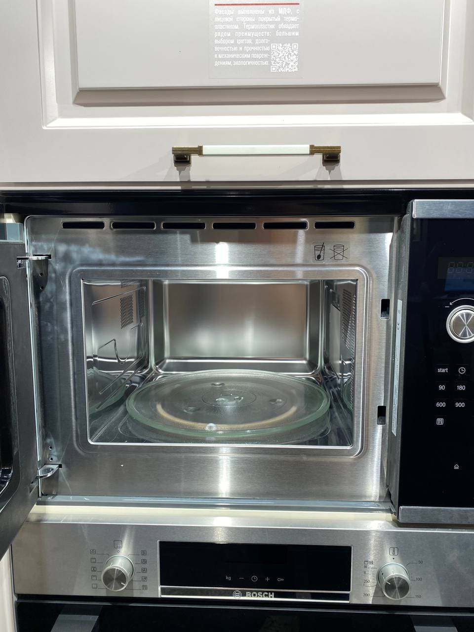 Фасады, выполненные из МДФ 19 мм. Покрытие: лицевая сторона — термопластик, обратная — белый ламинат;