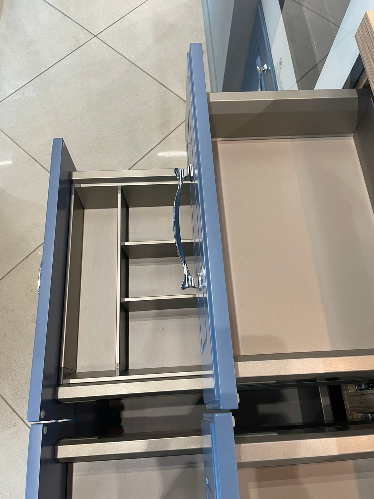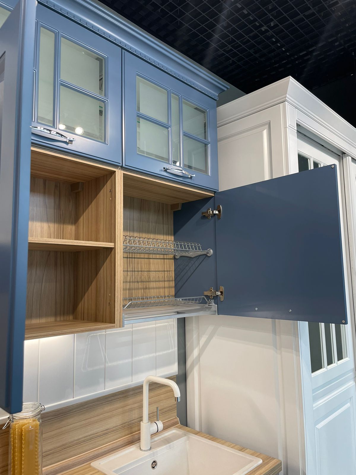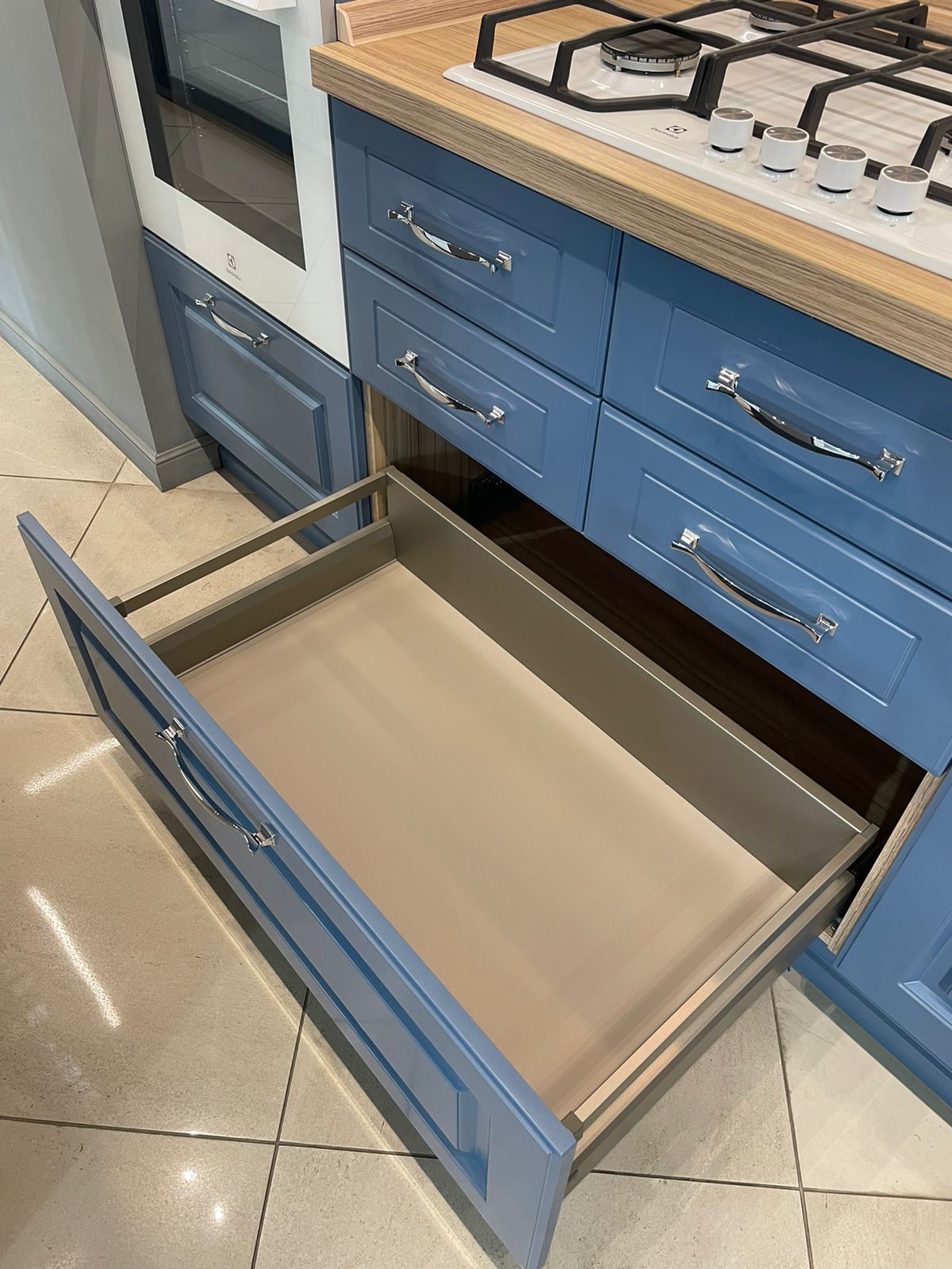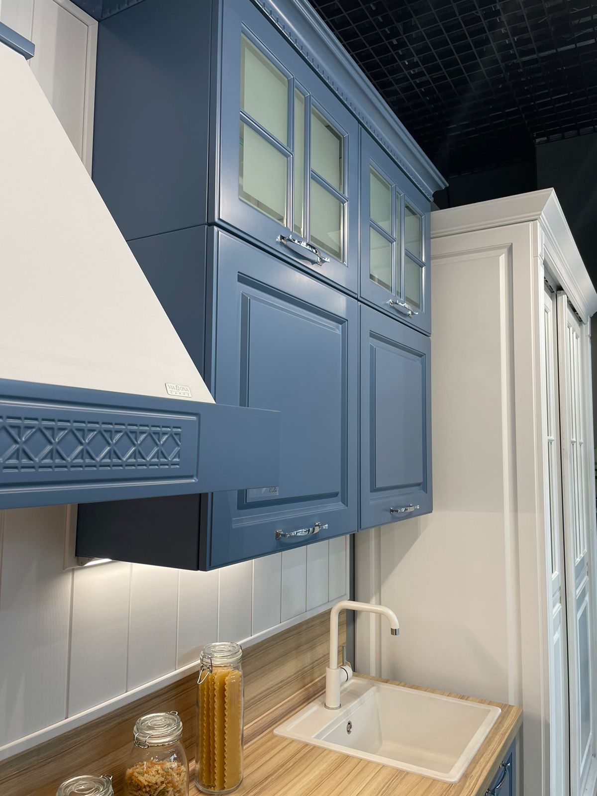 Фасады, выполненные из МДФ 19 мм. Покрытие: матовая эмаль, дополнительное покрытие: глянец, мат. Внутренняя сторона матовая, в цвет фасада. Фасады могут патинироваться.