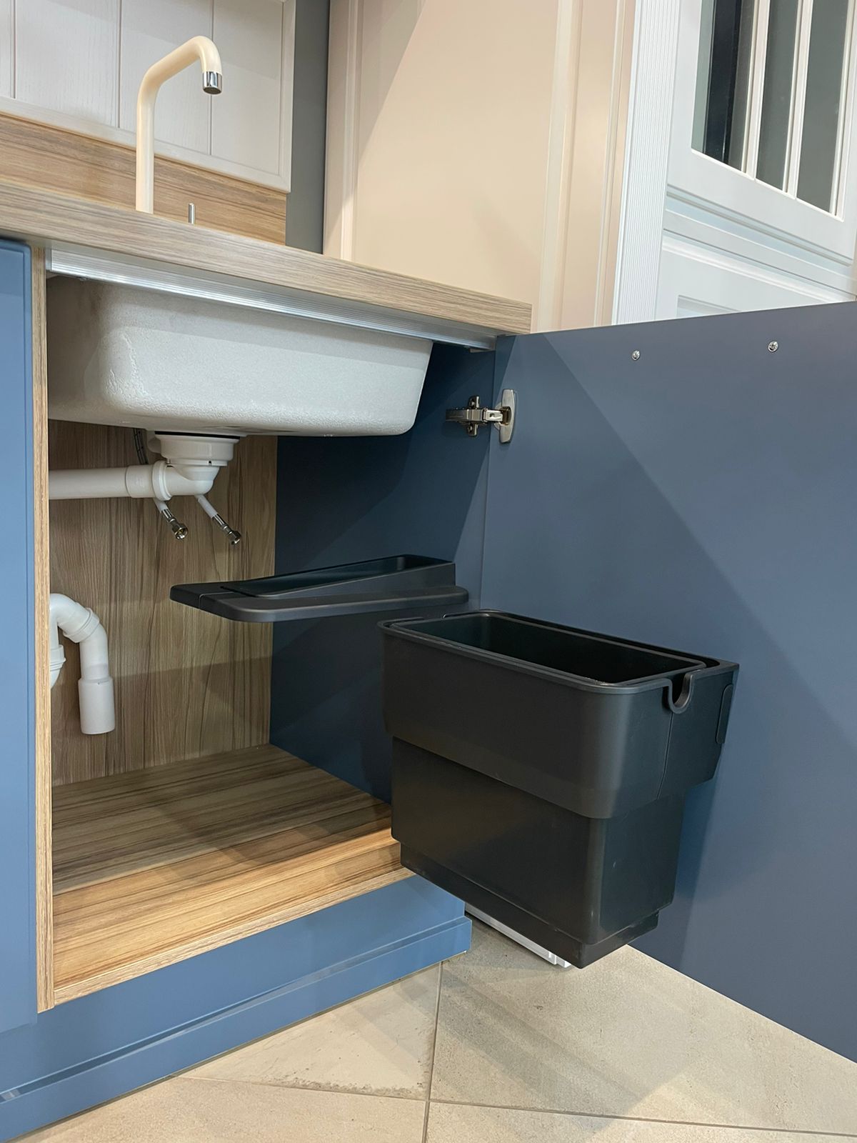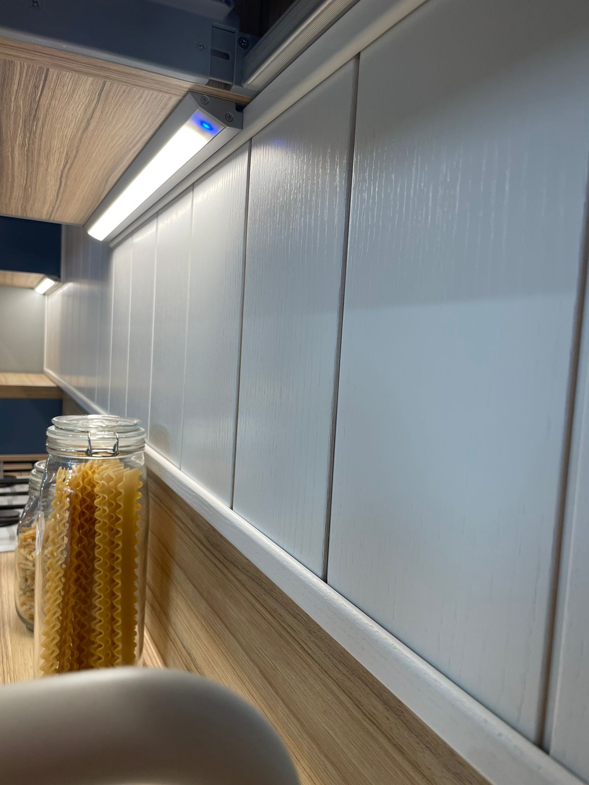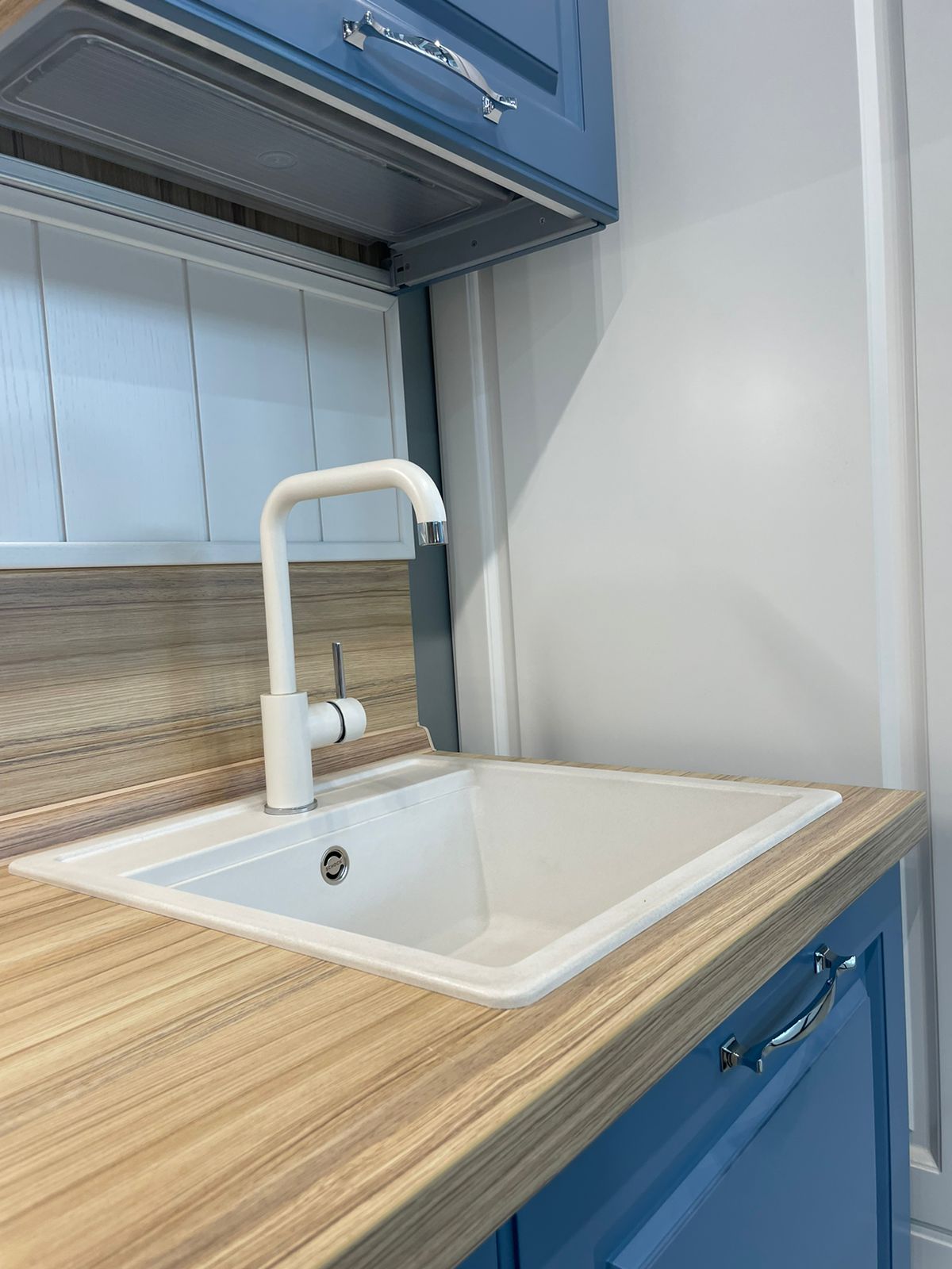 Фасады, выполненные из МДФ 19 мм. Покрытие: лицевая сторона — термопластик, обратная — белый ламинат;