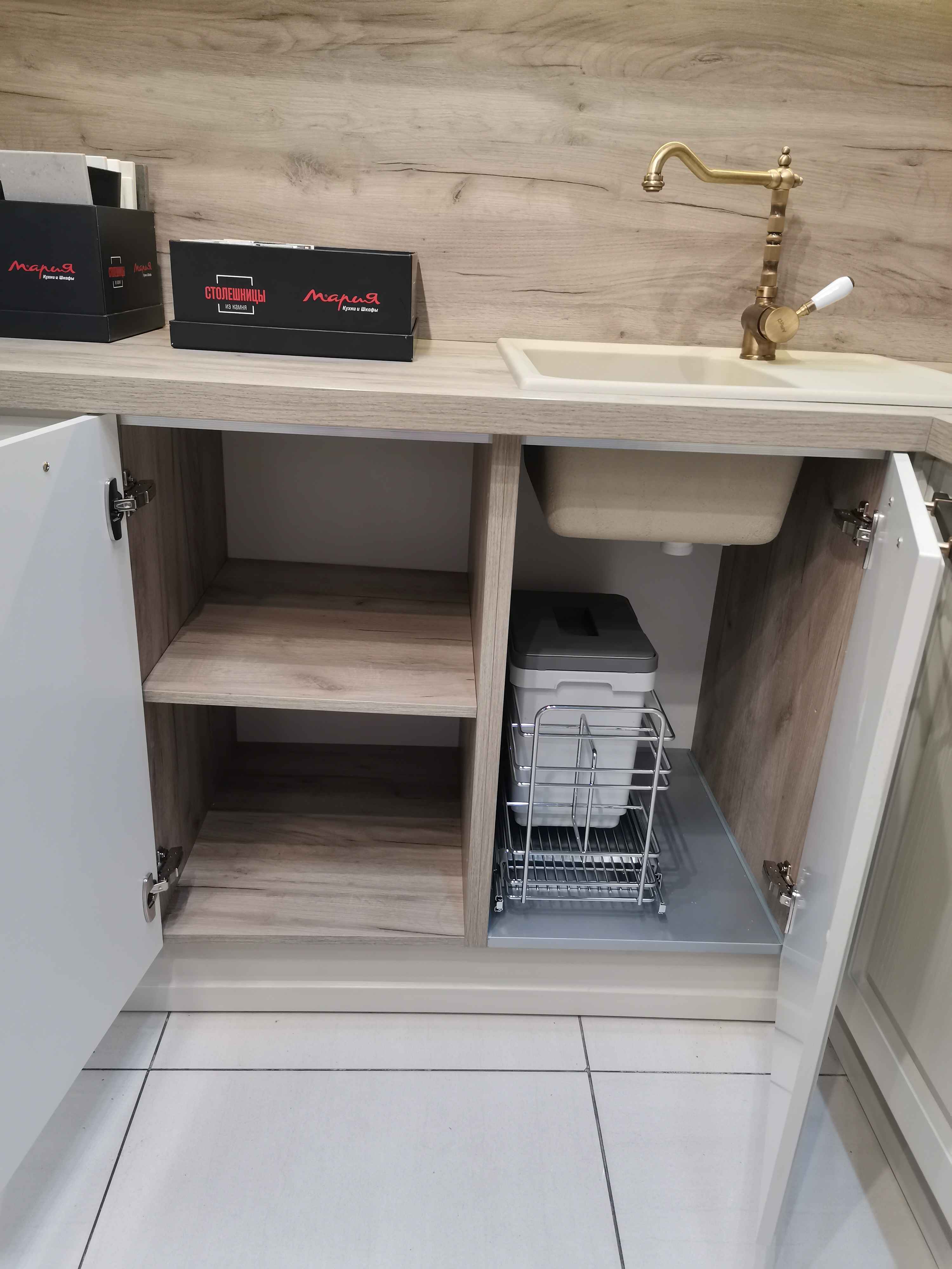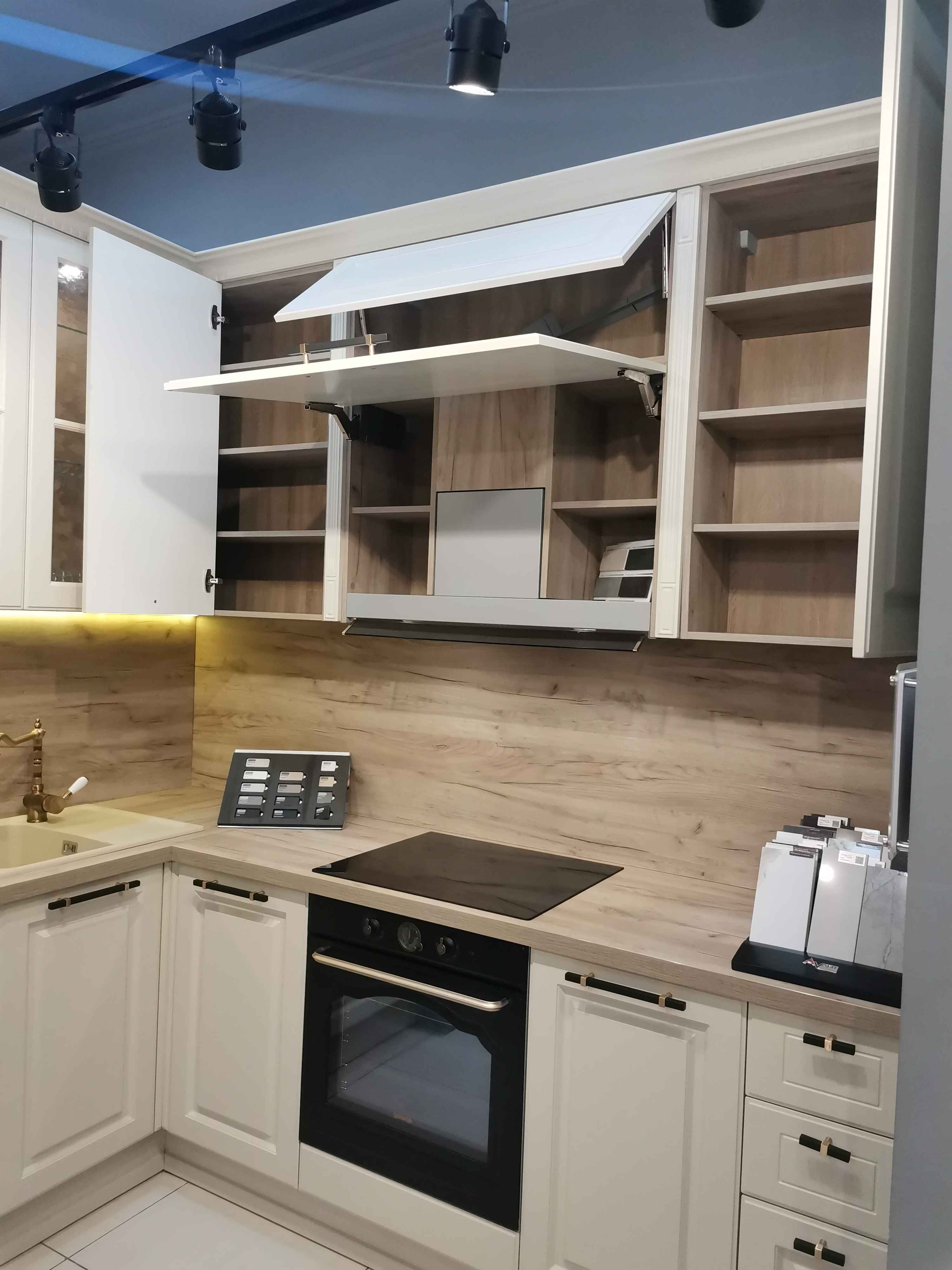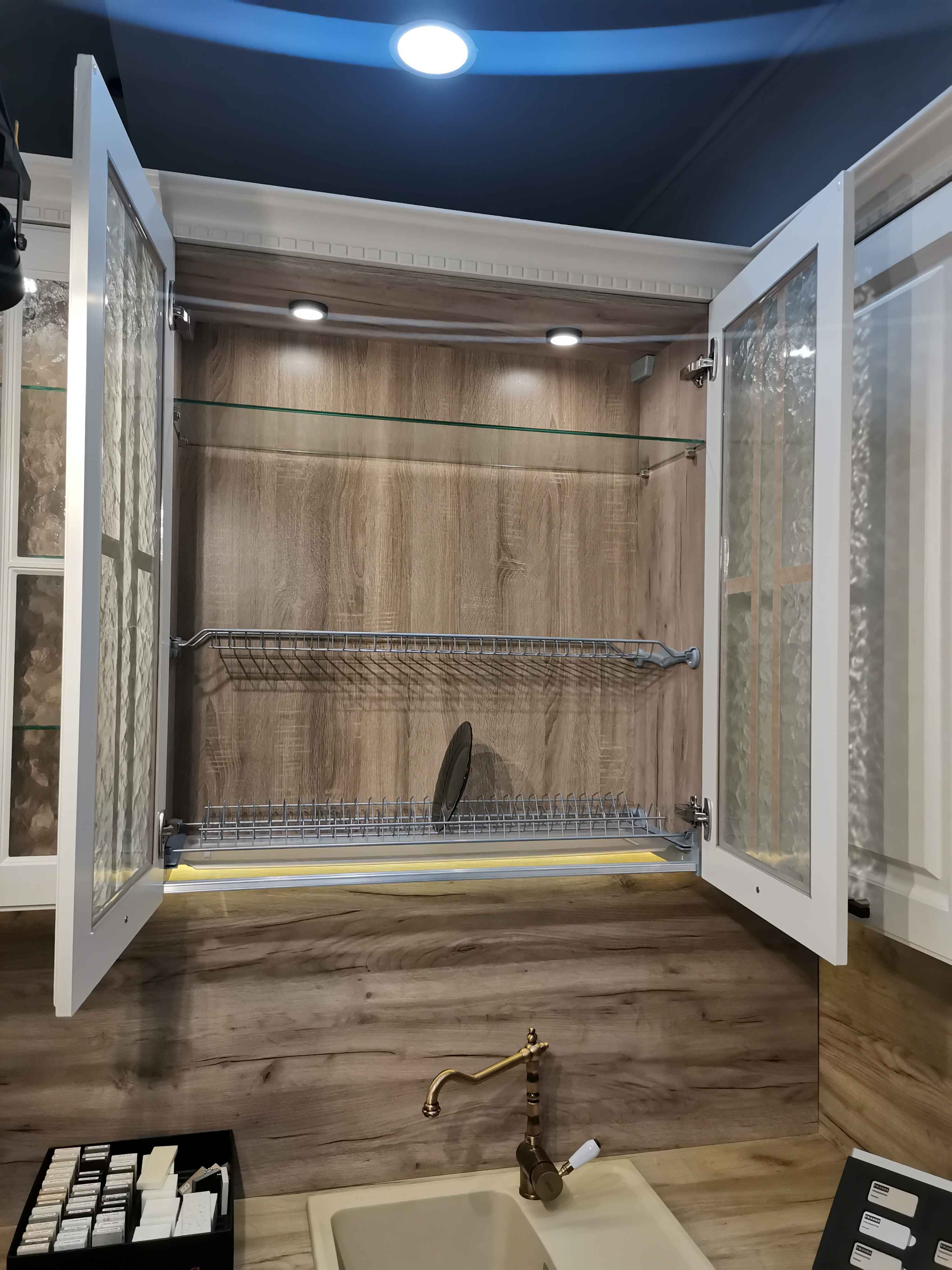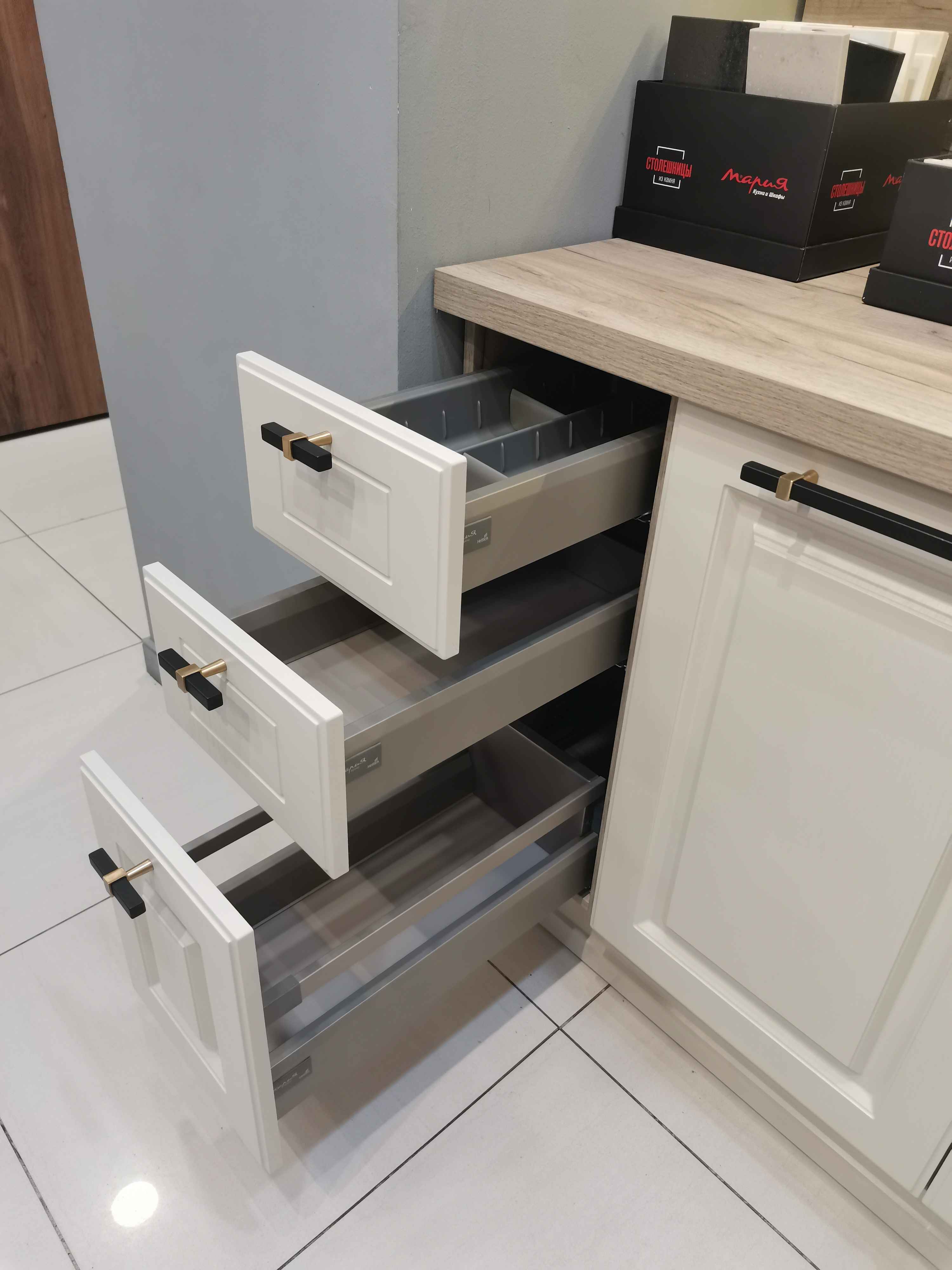 Фасады, выполненные из МДФ 19 мм. Покрытие: лицевая сторона — термопластик, обратная — белый ламинат;