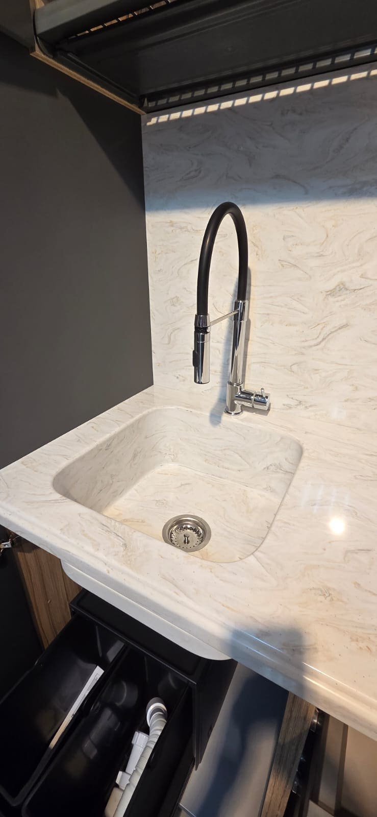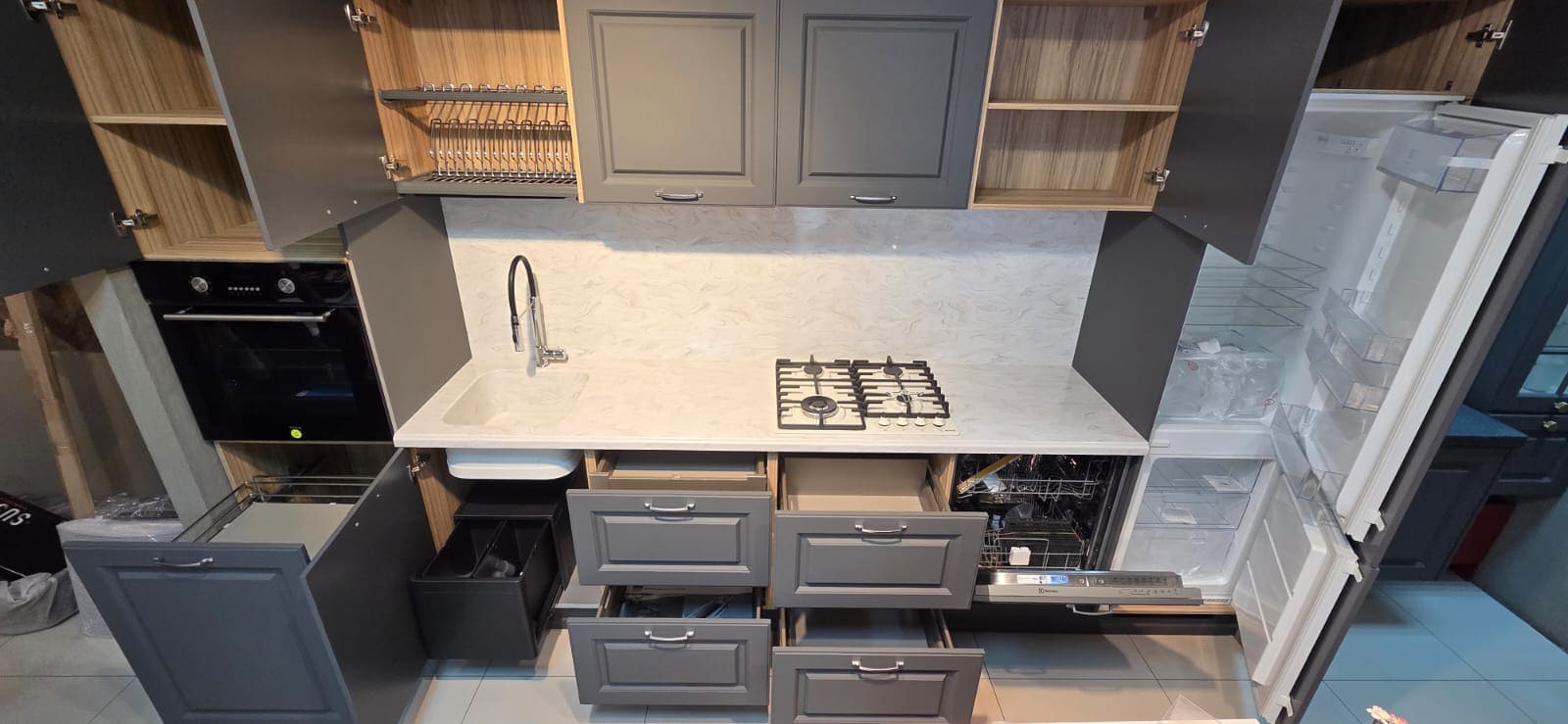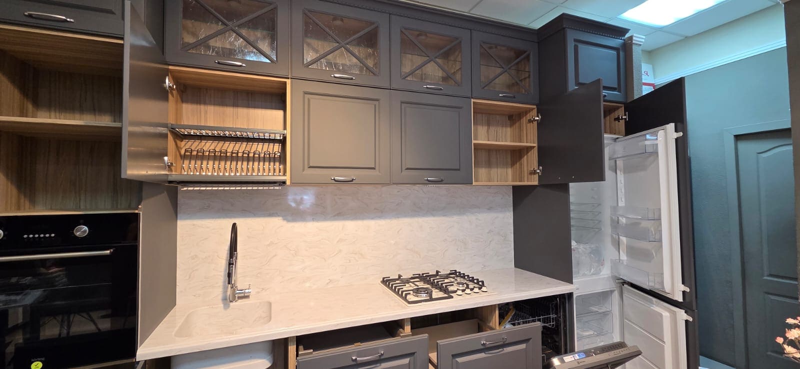 Фасады, выполненные из МДФ 19 мм. Покрытие: лицевая сторона — термопластик, обратная — белый ламинат;