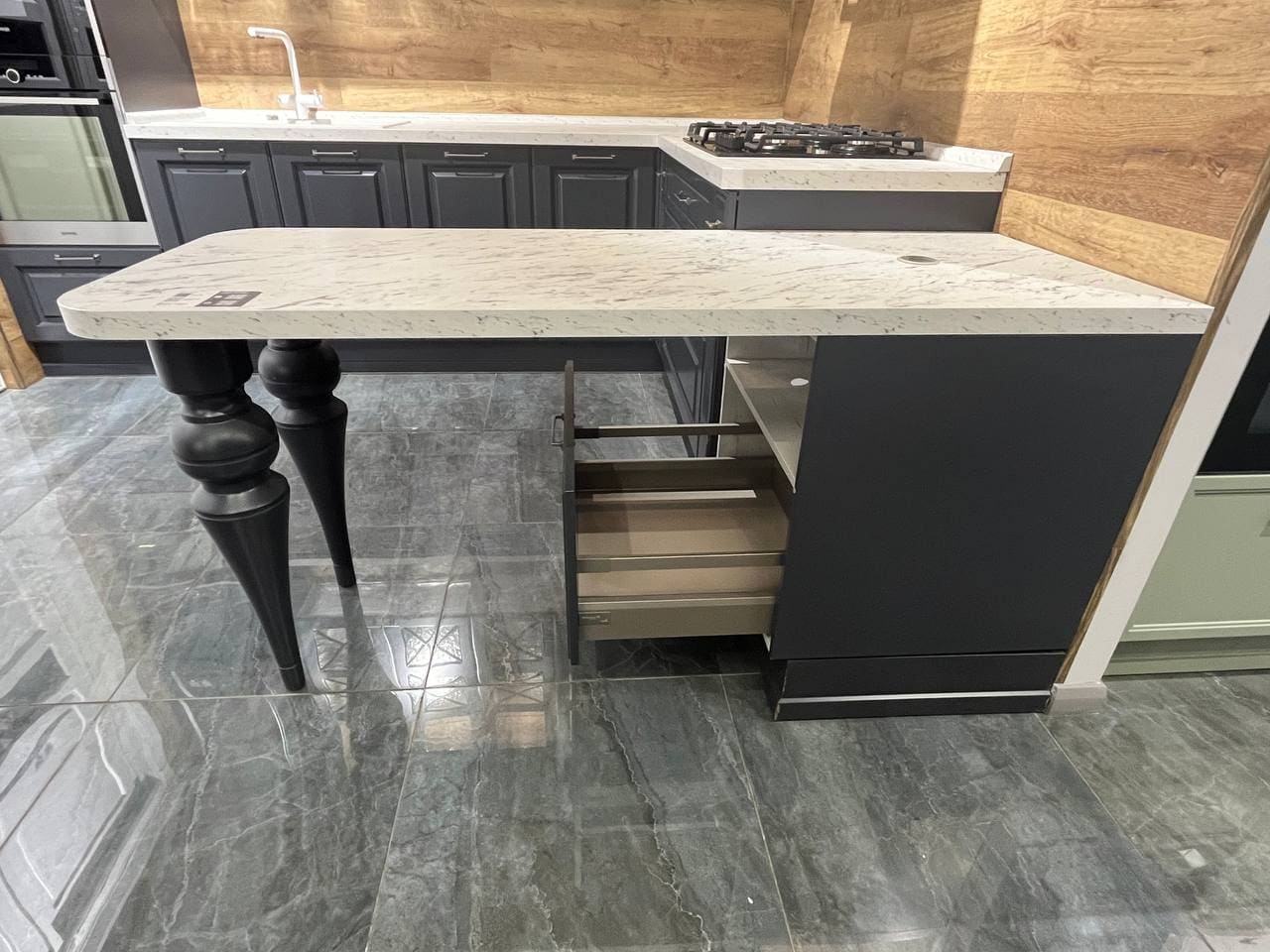 Внешний вид, описание дефектов: Незначительные сколы и царапины на фасадах. Дефект на внешней стороне фасада в нижней пристыковочной секции. Рассохлась склейка на одной барной ноге.