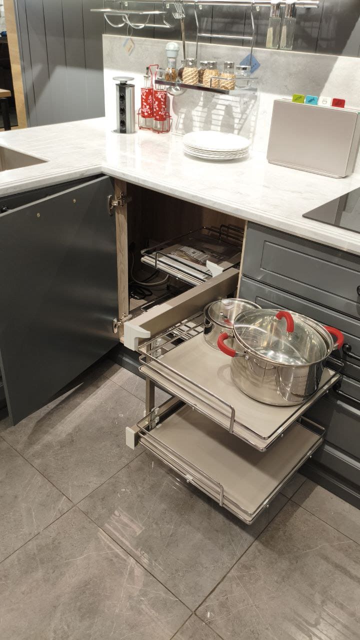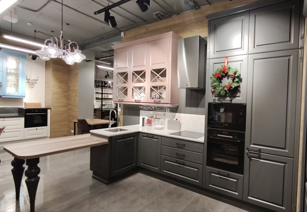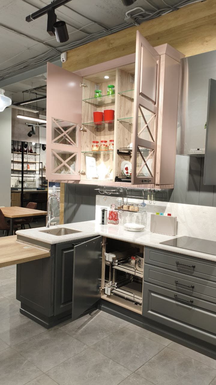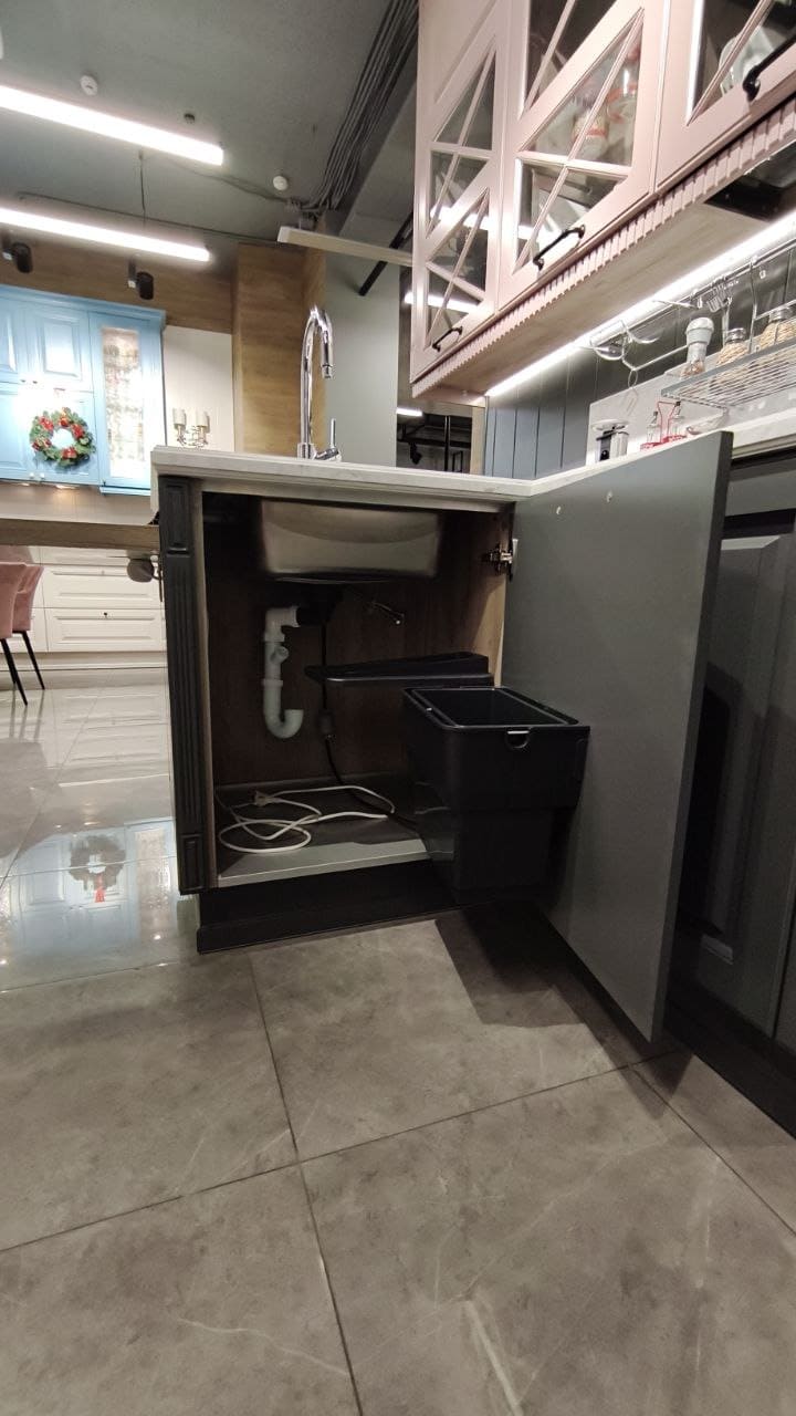Внешний вид, описание дефектов: Фасад под мойкой не плотно закрывается, выпил в боковине под провод с заглушкой. Механизм в пристыковочной секции до конца не выдвигается, мешает фасад под мойкой. Могут присутствовать незначительные потертости, сколы, царапины. Люстра, ёмкости для печенья и бокалы не входят в данный комплект кухонного гарнитура.