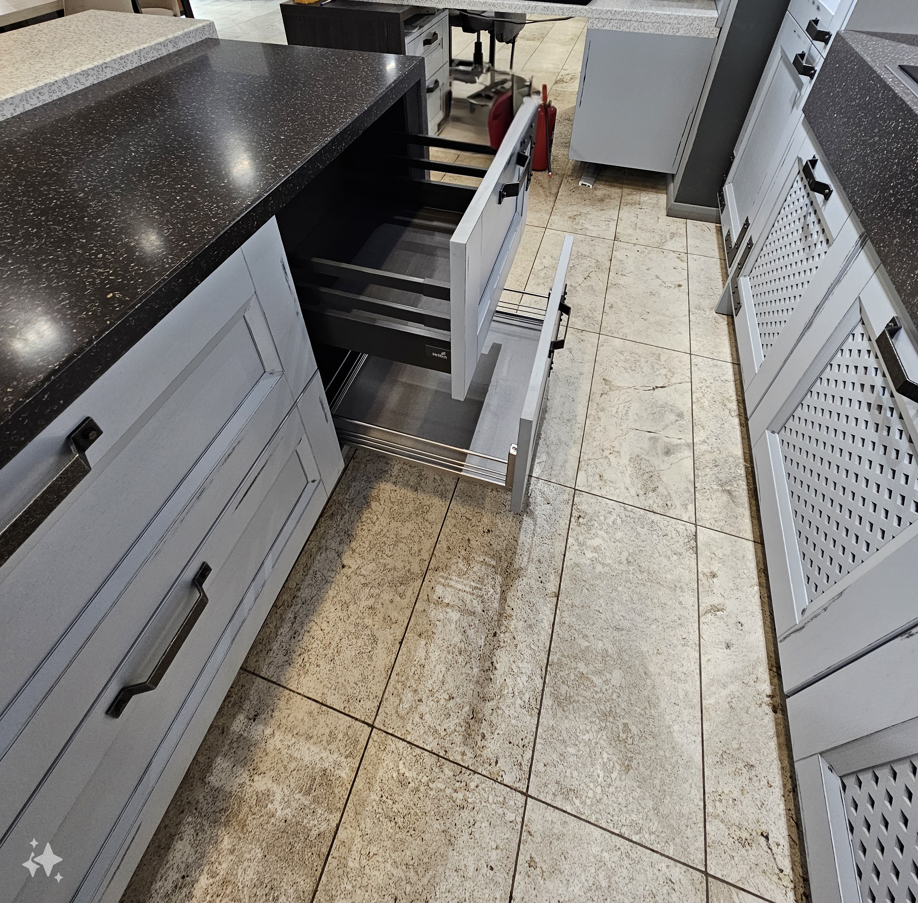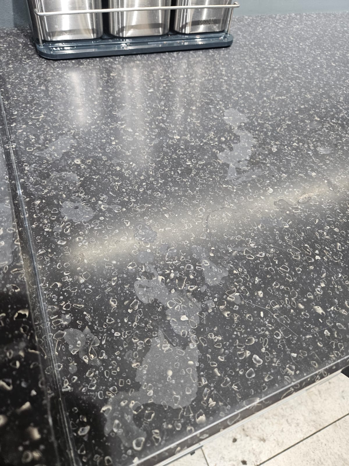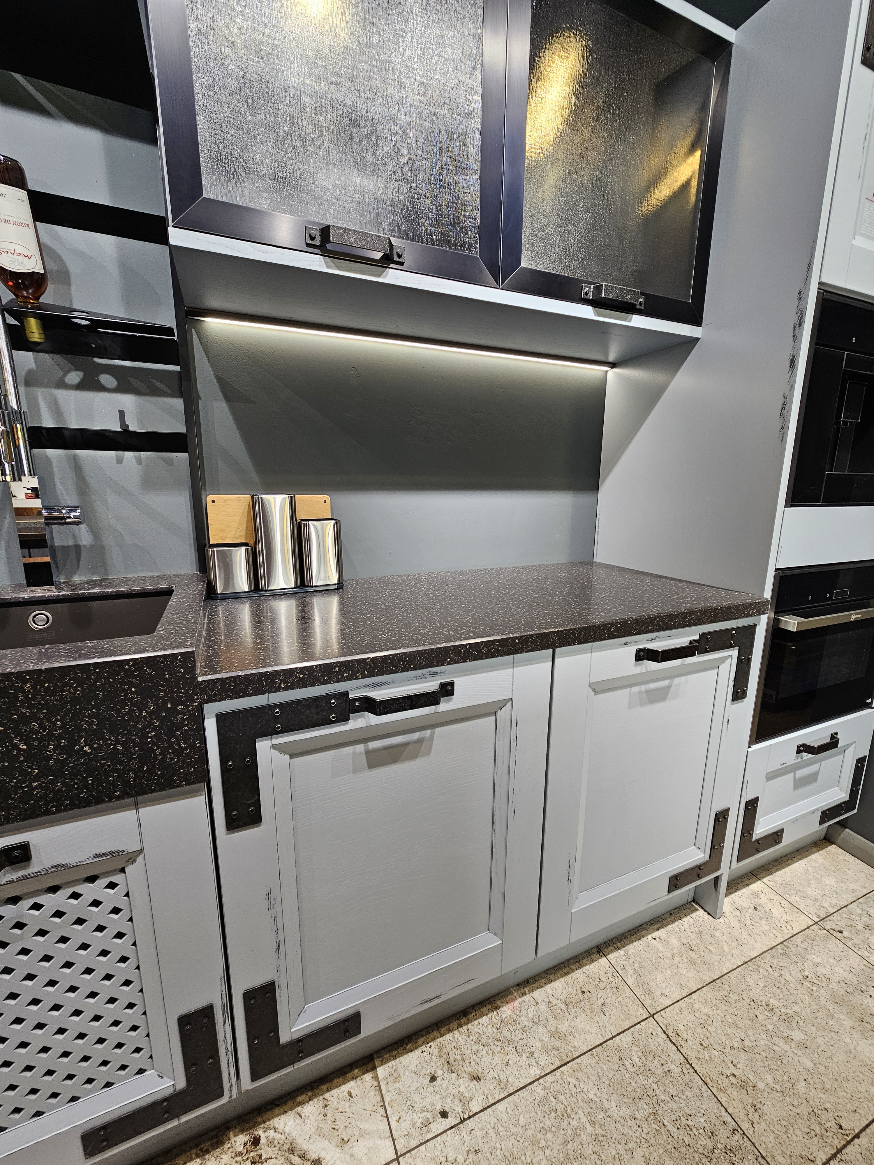 Внешний вид, описание дефектов: Потертости, сколы, царапины. Кухня в активной эксплуатации, подробные дефекты см. в спецификации. Стулья и аксессуары не входят в данный комплект кухонного гарнитура. На столешнице пятна от химии (см. фото).