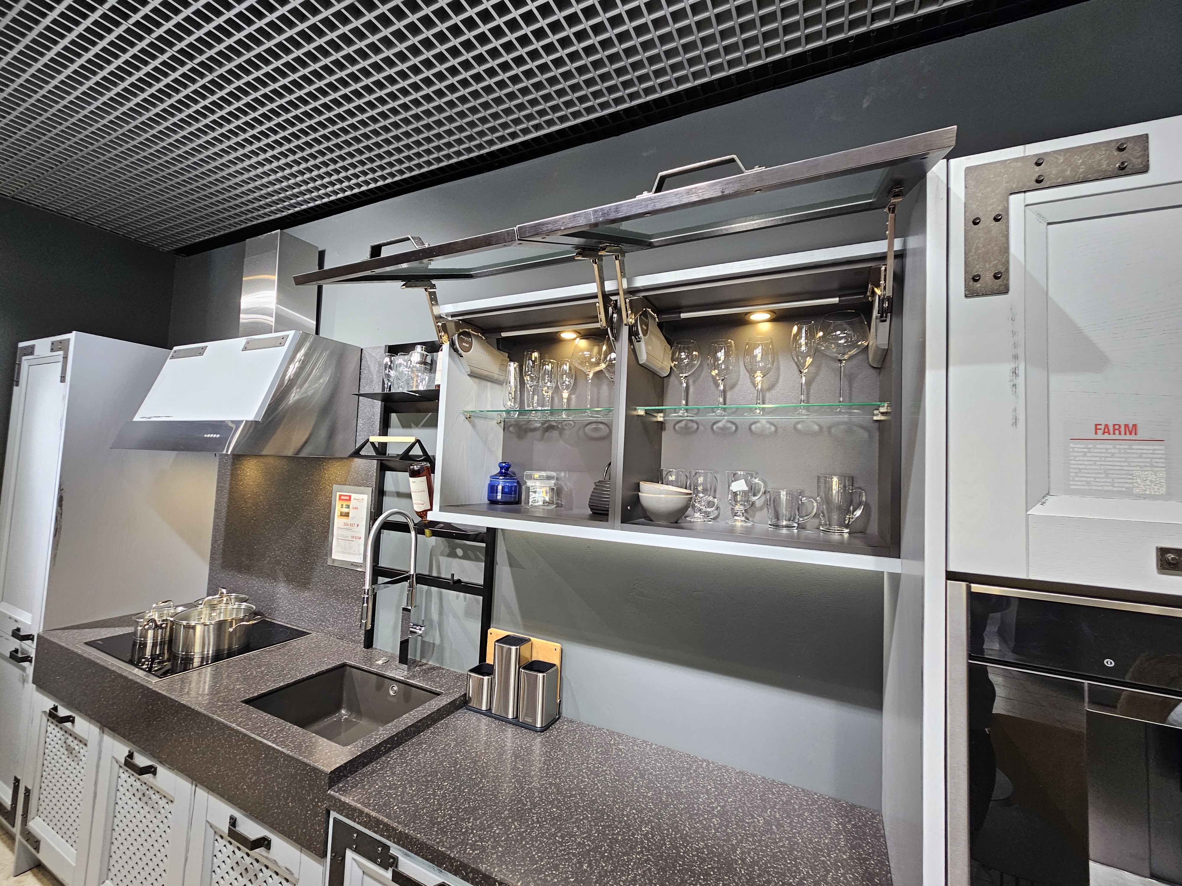 В FARM гармонично сочетаются современные элементы с классическими: декоративная панель с несовременной вытяжкой, открытые деревянные полки с хромированными держателями.