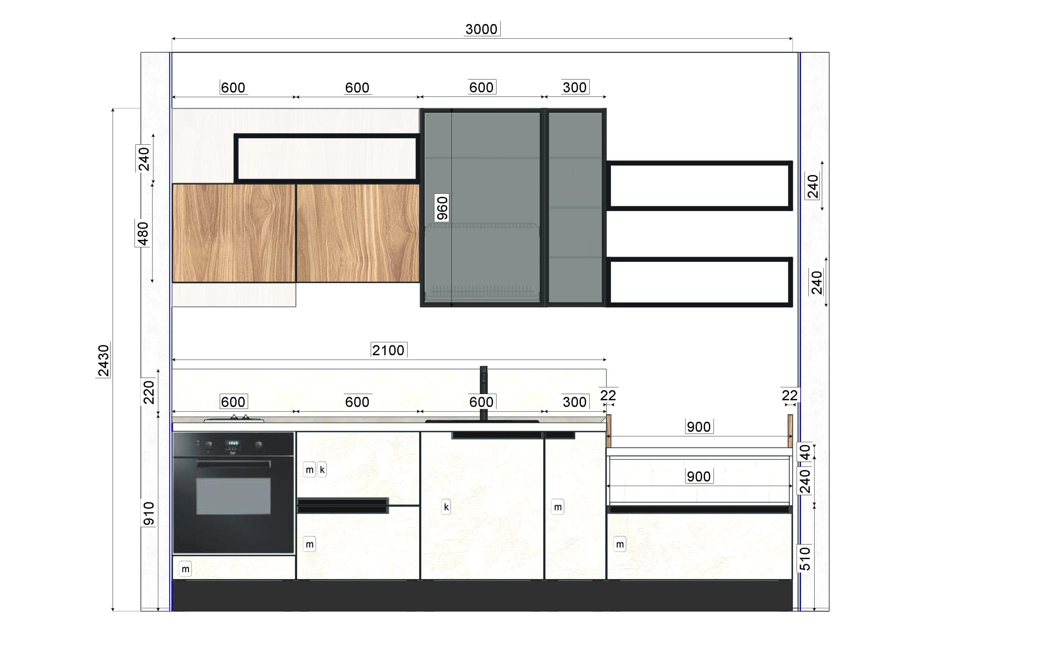 Размер Кухни слева направо: 3000 х 1800 мм.