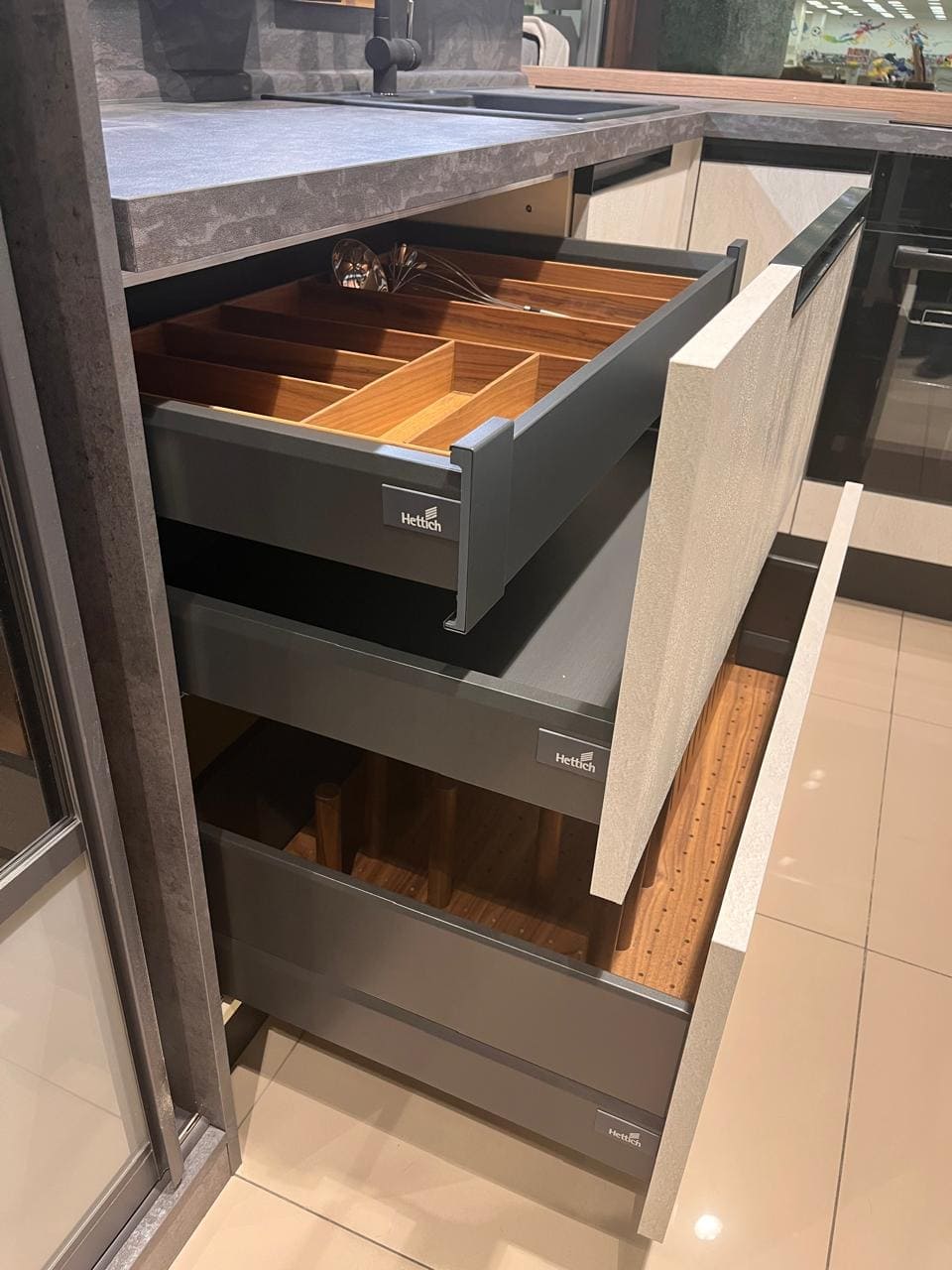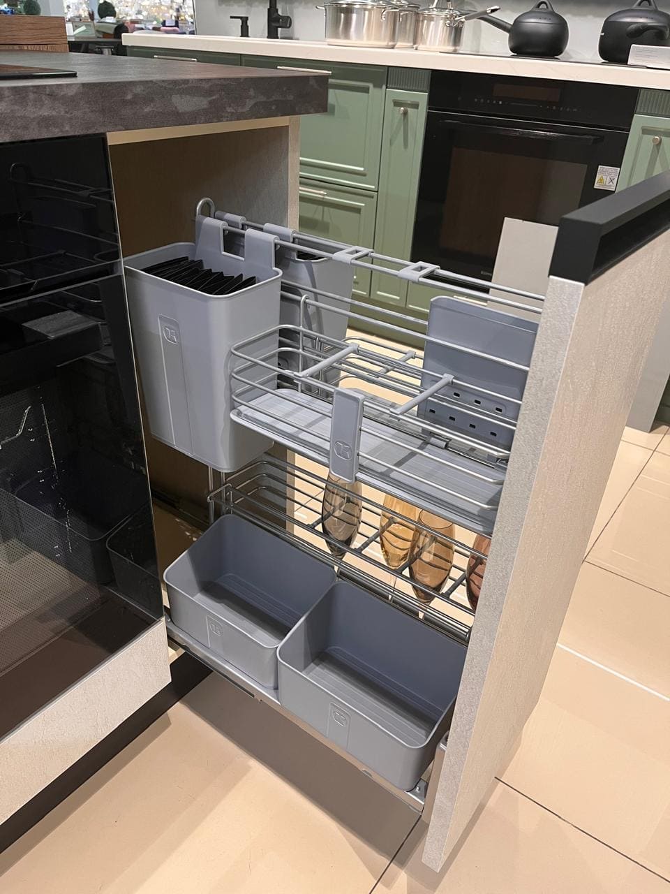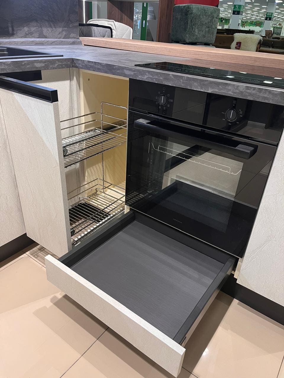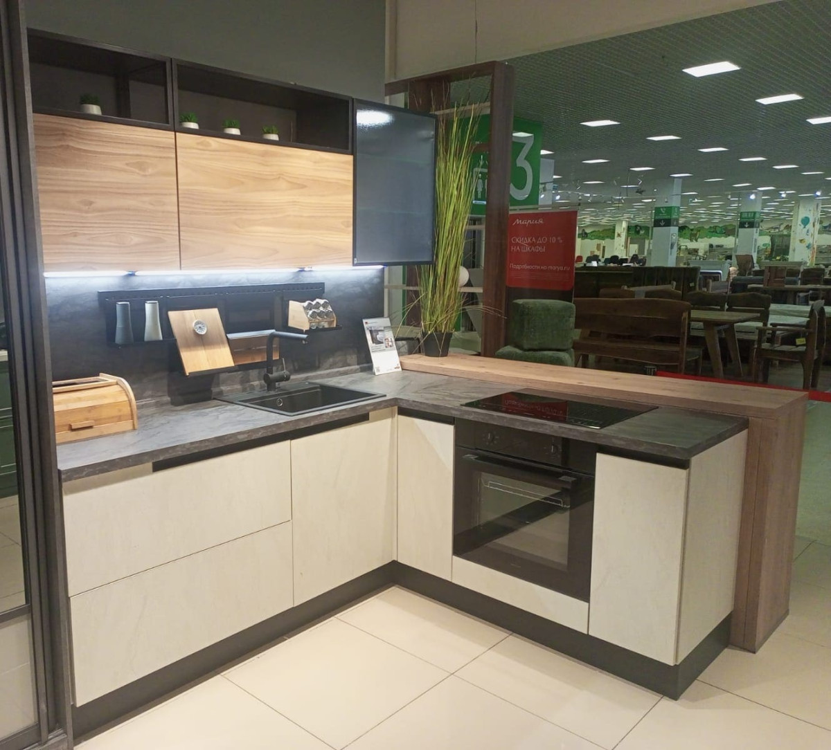 Внешний вид, описание дефектов: Незначительные потертости, сколы, царапины. Стулья, хлебница и аксессуары не входят в данный комплект кухонного гарнитура. Вытяжка не установлена на выставочном образце, в комплекте!