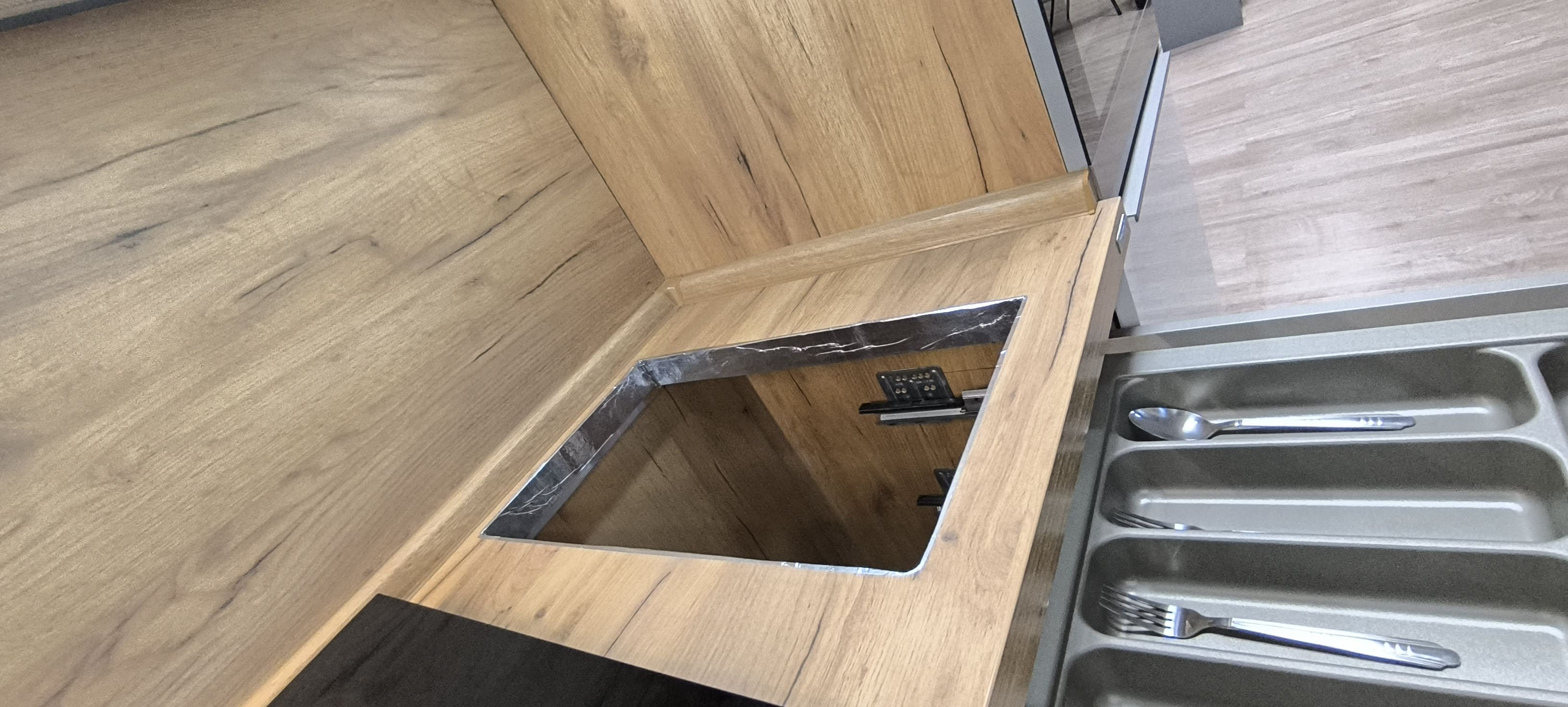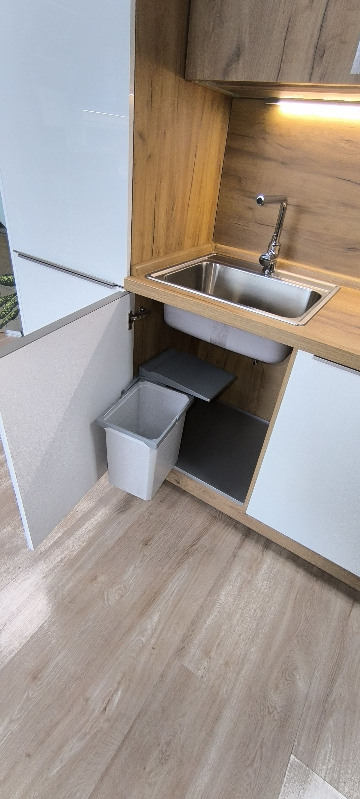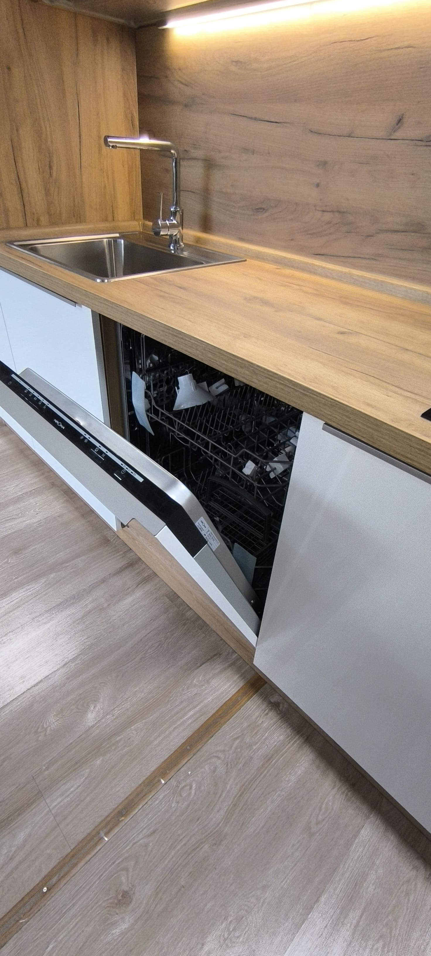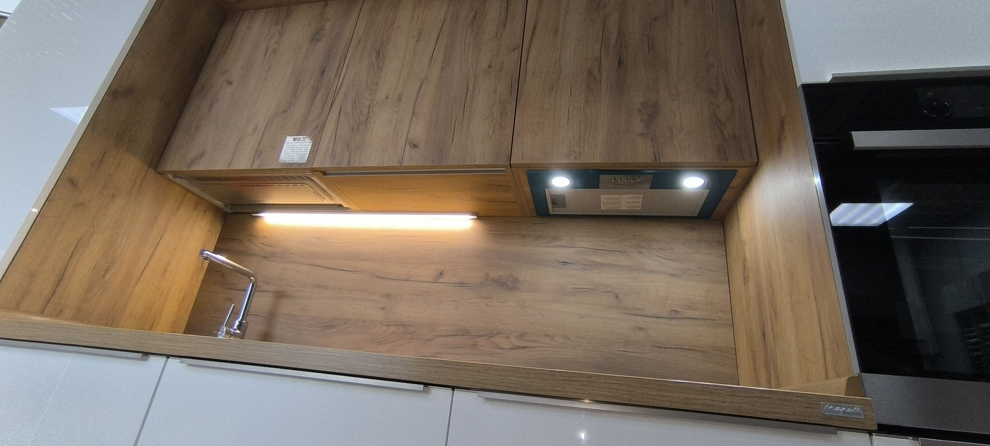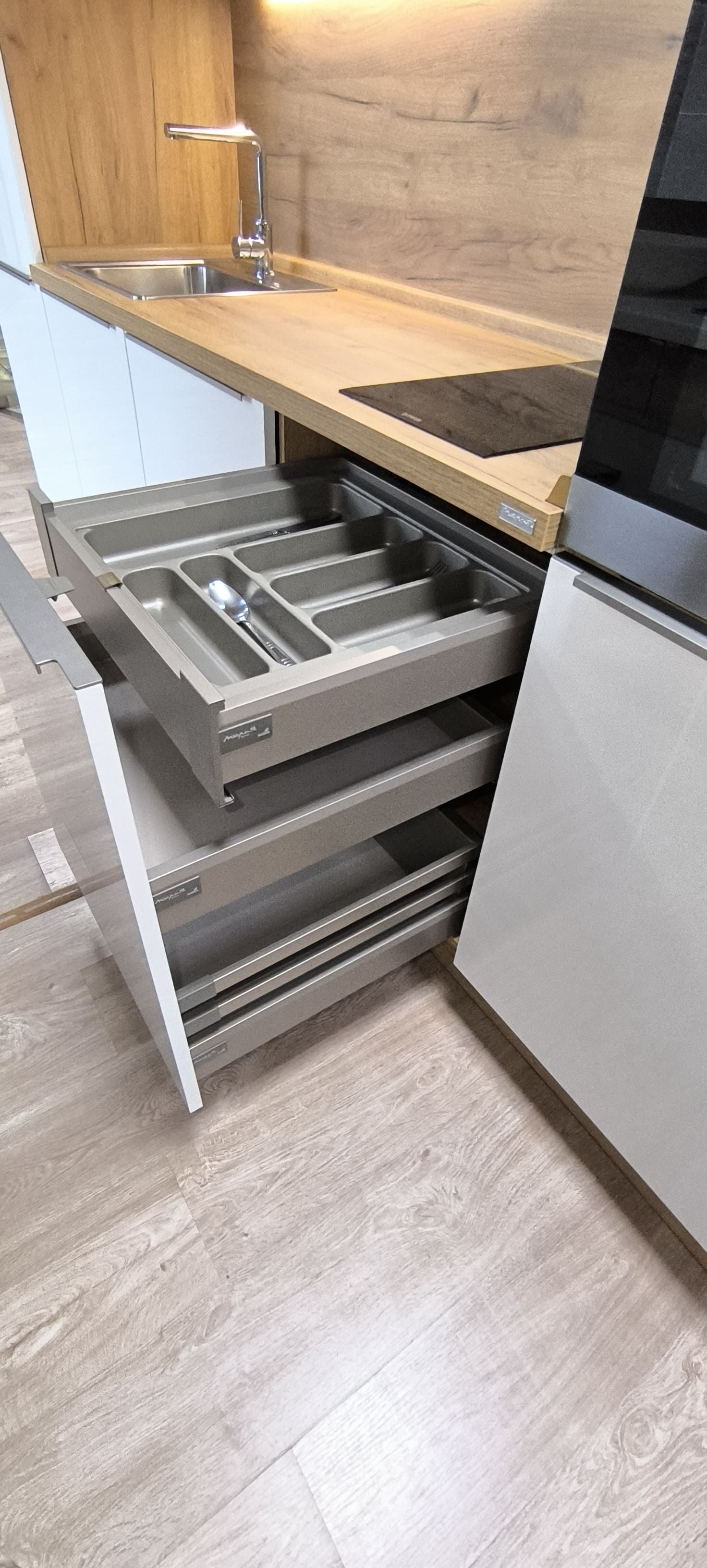 Внешний вид: Кухонный гарнитур в идеальном состоянии, но т.к. это витринный образец, то могут присутствовать незначительные потертости, сколы, царапины. В выдвижном ящике 2 нижних яруса соединены, из-за чего затруднен доступ к нижнему ящику (на фото). Секция под вытяжку глухая. Данный комплект мебели возможно приобрести как без техники, так и комплектно!