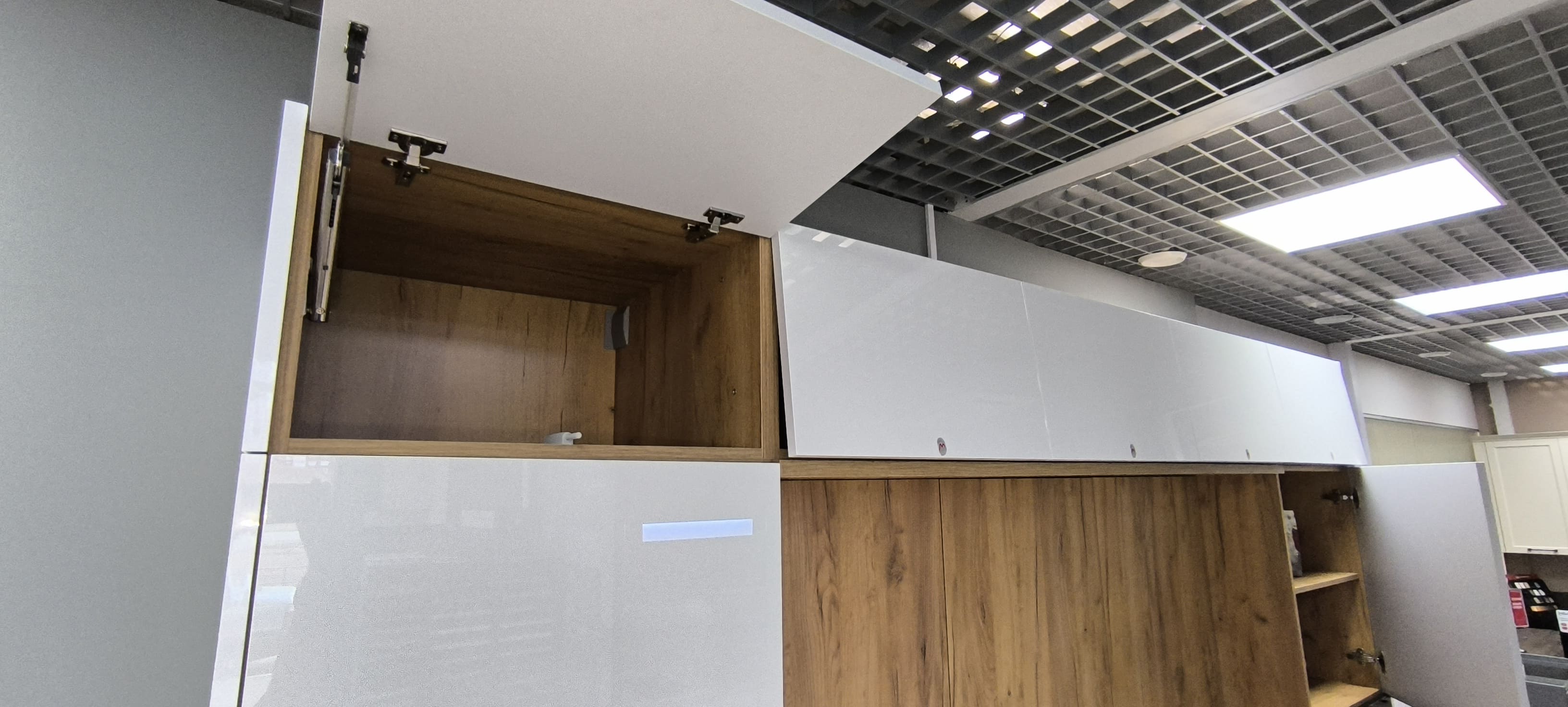 фасады, выполненные из МДФ 20 мм. Покрытие: лицевая сторона — акриловый пластик, обратная сторона — белый ламинат, кромка ABS 1 мм.
