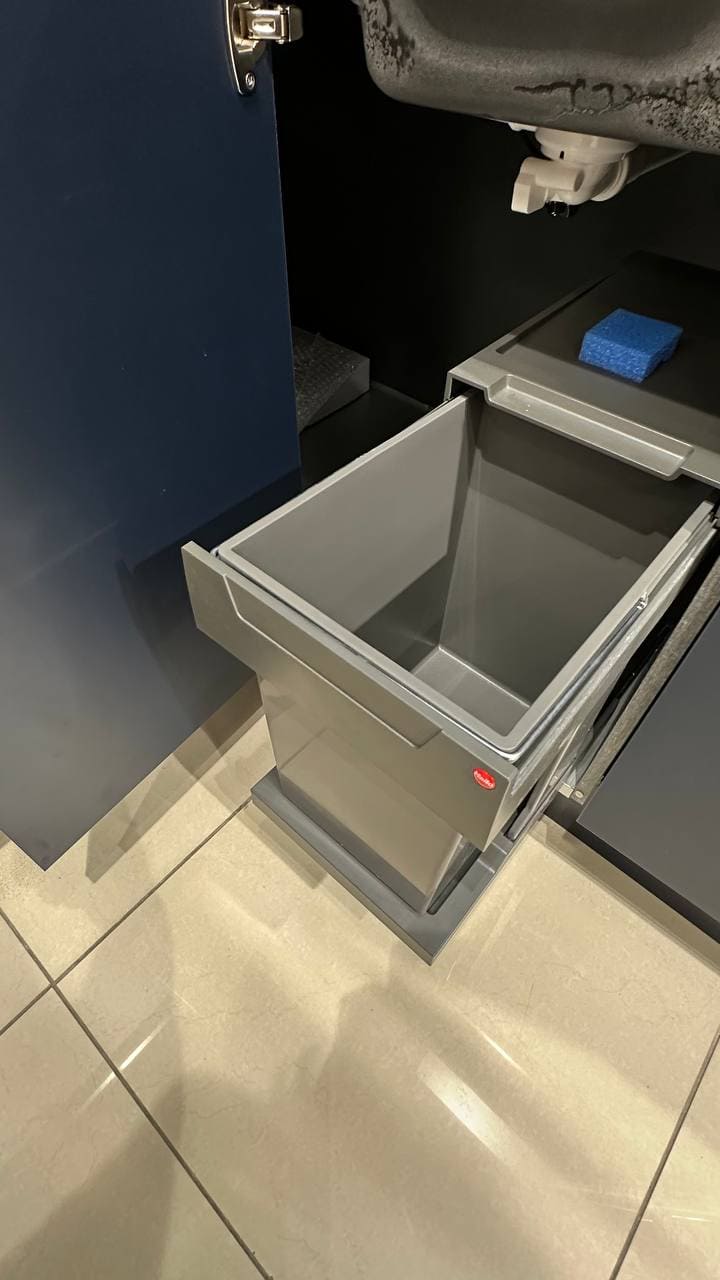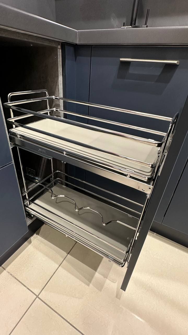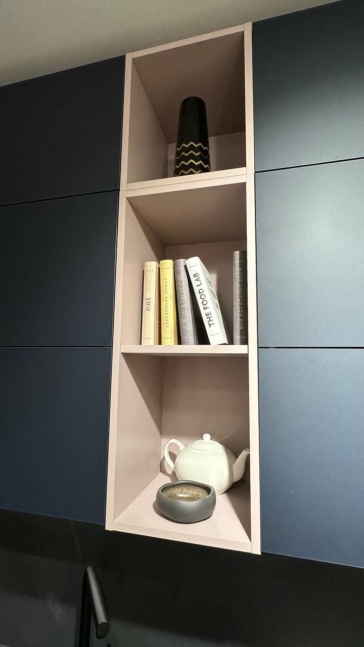 фасады, выполненные из МДФ 20 мм. Покрытие: лицевая сторона — акриловый пластик, обратная сторона — белый ламинат, кромка ABS 1 мм.