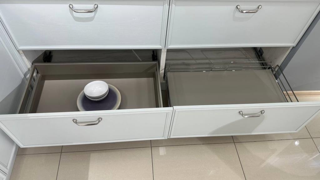 Рамка фасадов изготовлена из массива ясеня с филенкой из МДФ, покрытой шпоном. Покрытие: стойкая к истиранию, пластичная и высокопрочная матовая эмаль.
