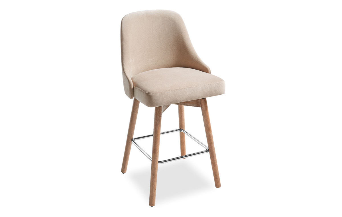 Полубарный стул Jimmy (Джимми) с поворотным механизмом имеет удобную высокую спинку, ножки из дерева с металлической подставкой для ног. Обивка нейтрального бежевого оттенка из велюра. Такой барный стул подходит в большинство современных интерьеров, особенно в скандинавский стиль и софт-минимализм.