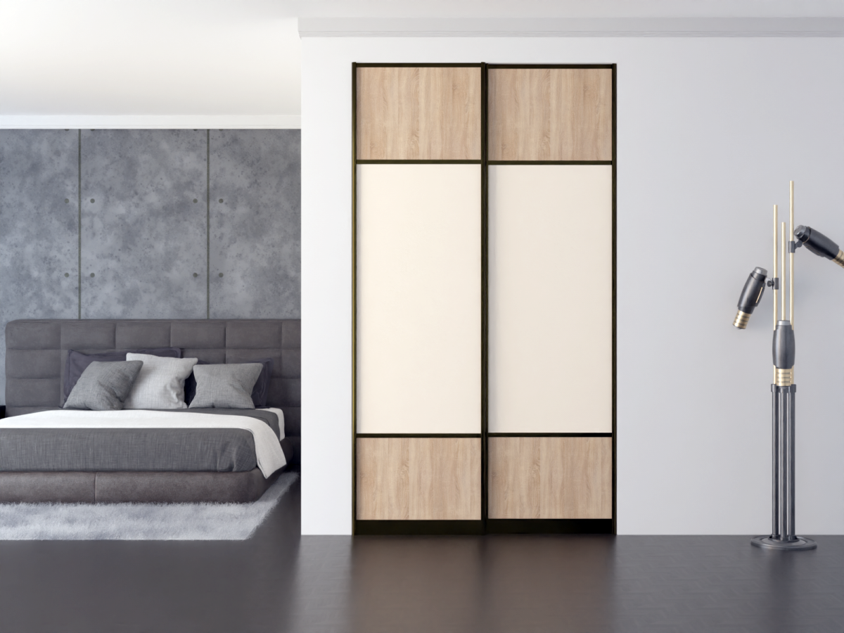 Фасады выполнены из алюминиевой рамы толщиной 1 мм со вставками ДСП толщиной 10 мм., крашеными стеклами, зеркалами, стеклами с фотопечатью. Широкий выбор оформления: натуральные древесные, яркие глянцевые, матовые, однотонные покрытия и фотопечать.