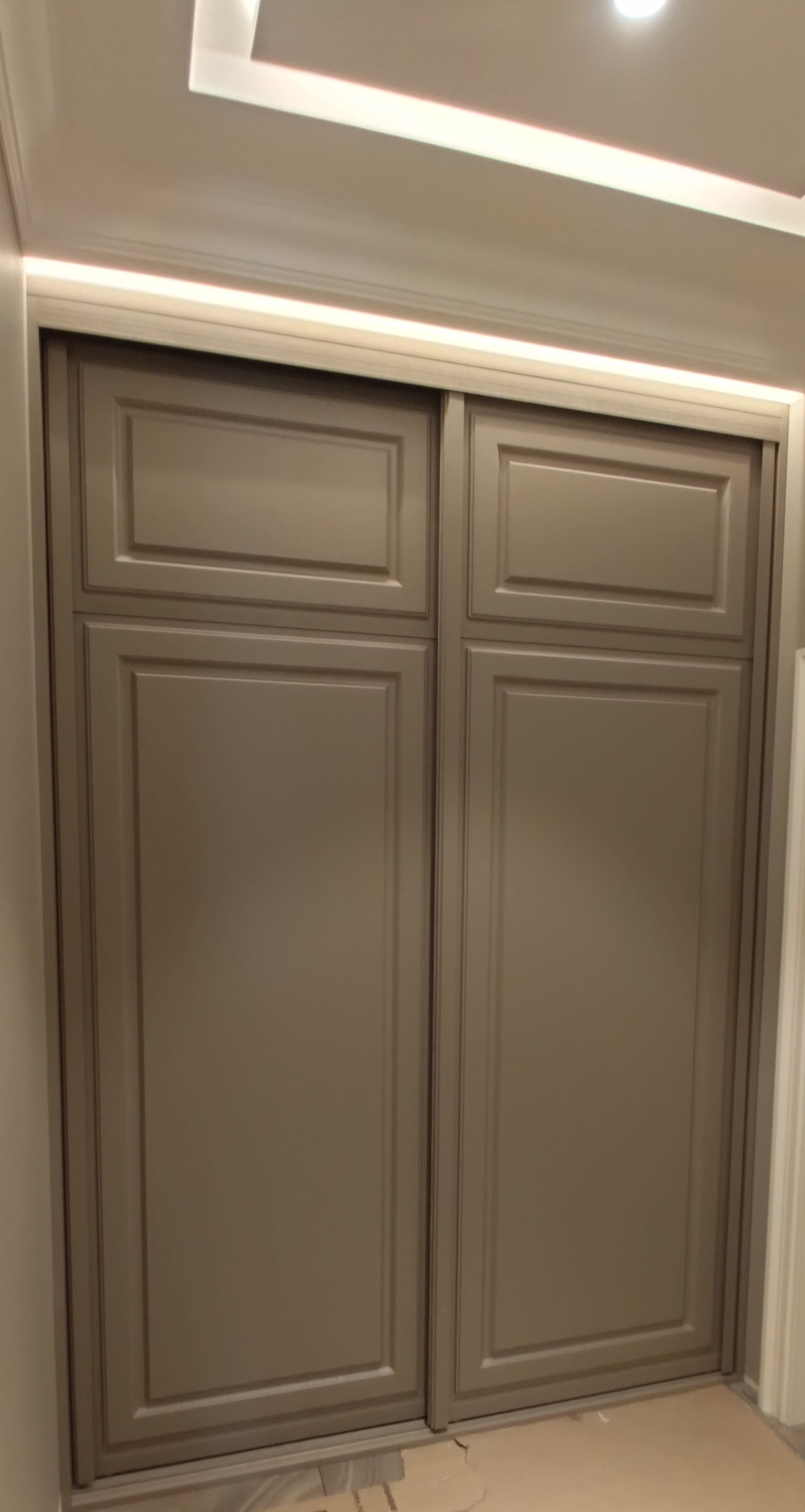 Фасады классических шкафов выполнены из МДФ толщиной 19 мм и обтянуты термоплатиком, возможны варианты с патинированием. В классических шкафах-купе используется профиль Flat в цвет фасада, - лаконичный и изысканный. Двери шкафов могут быть дополнены стеклами (серебро, антрацит, бронза) и зеркалами.