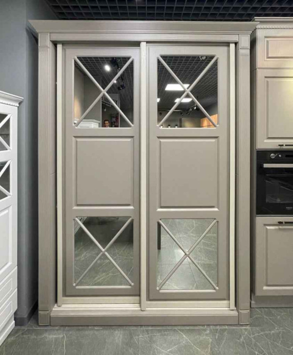 Фасады классических шкафов выполнены из МДФ толщиной 19 мм и обтянуты термоплатиком, возможны варианты с патинированием. В классических шкафах-купе используется профиль Flat в цвет фасада, — лаконичный и изысканный. Двери шкафов могут быть дополнены стеклами (серебро, антрацит, бронза) и зеркалами.