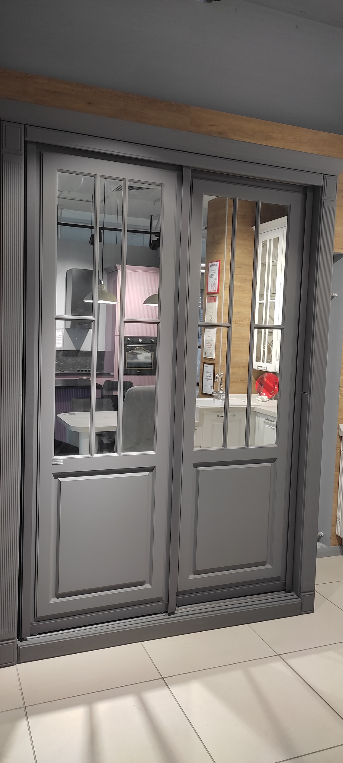 Фасады классических шкафов выполнены из МДФ толщиной 19 мм и обтянуты термоплатиком, возможны варианты с патинированием. В классических шкафах-купе используется профиль Флат в цвет фасада, — лаконичный и изысканный. Двери шкафов могут быть дополнены стеклами (серебро, антрацит, бронза) и зеркалами.