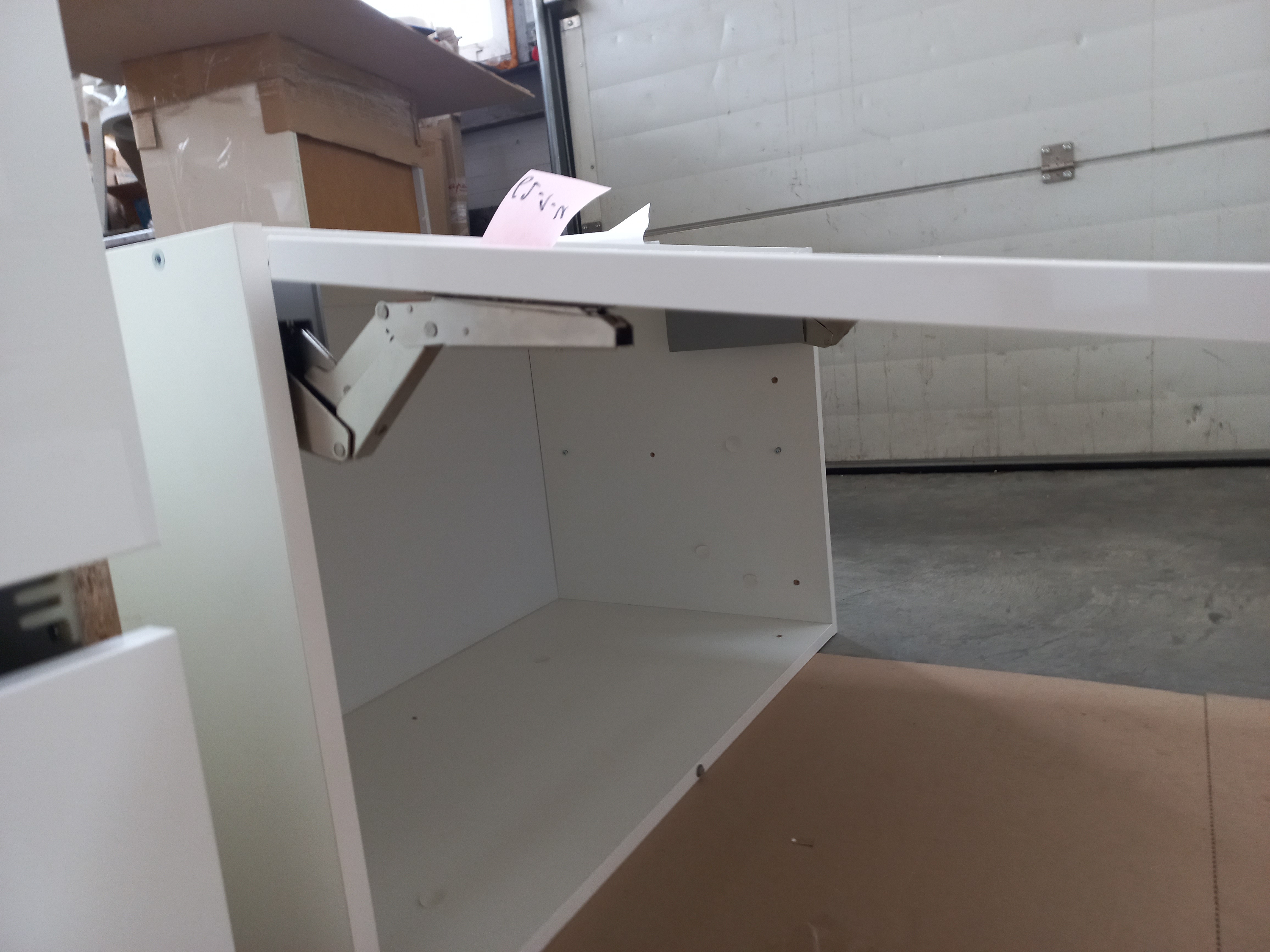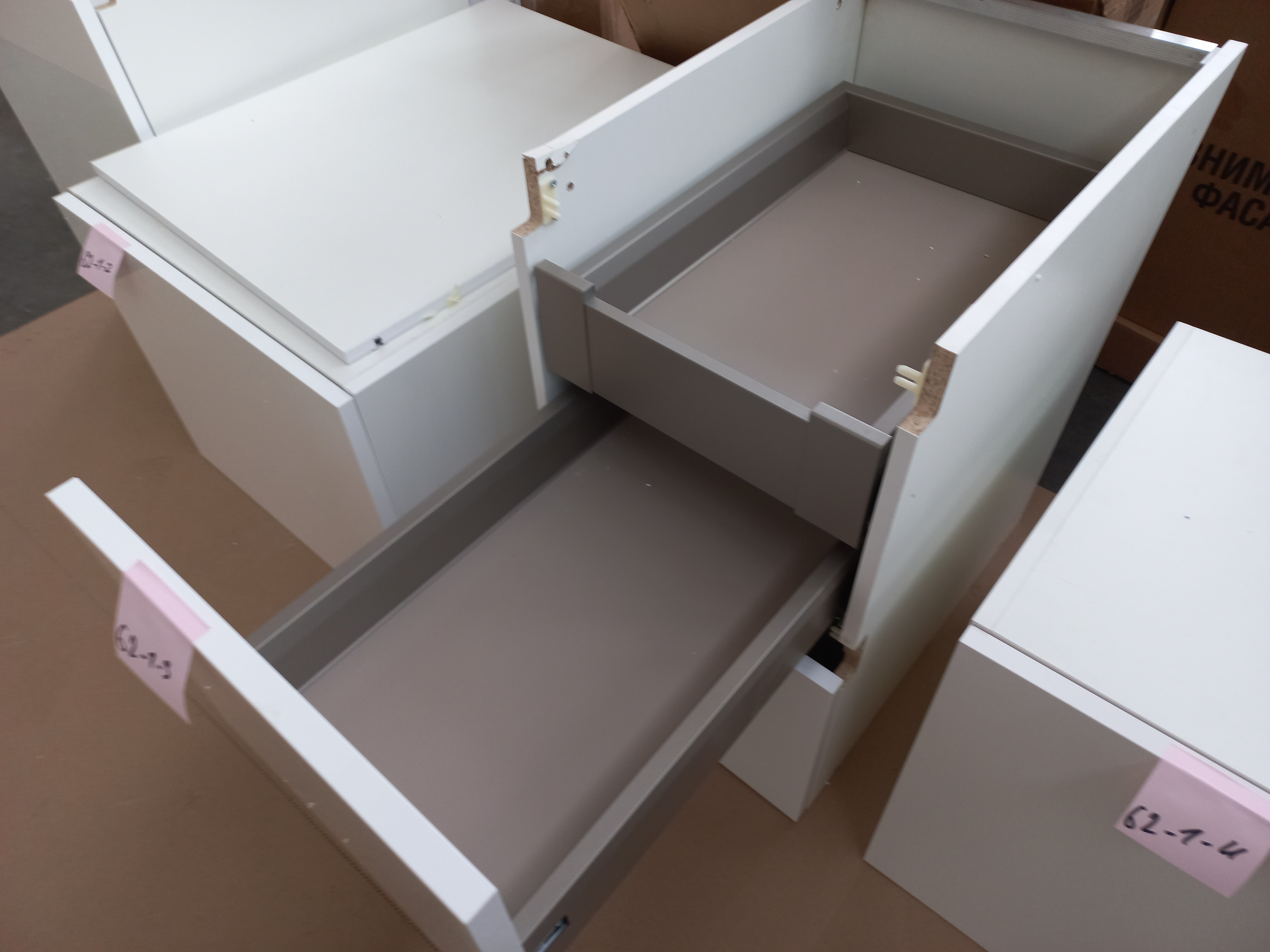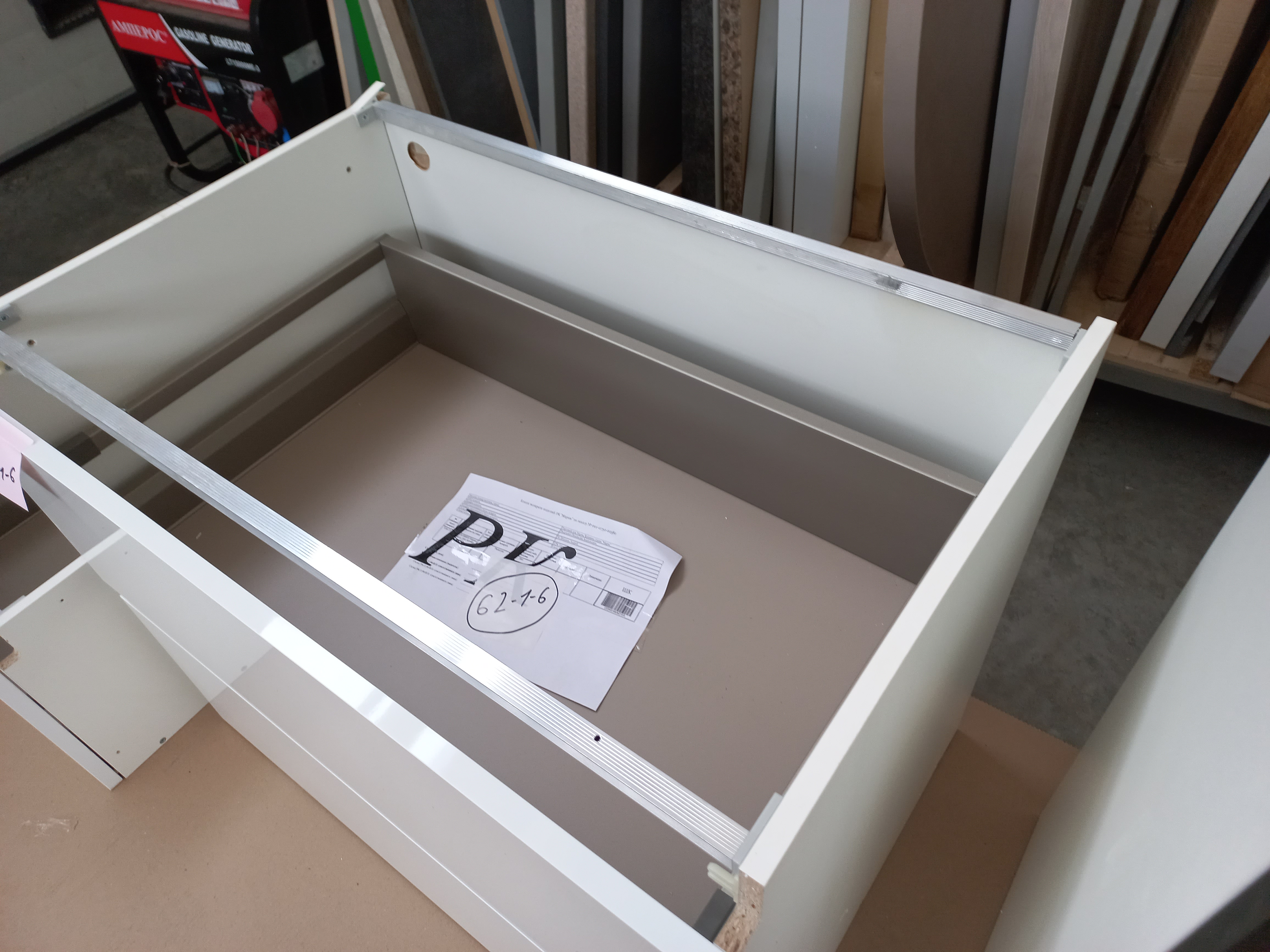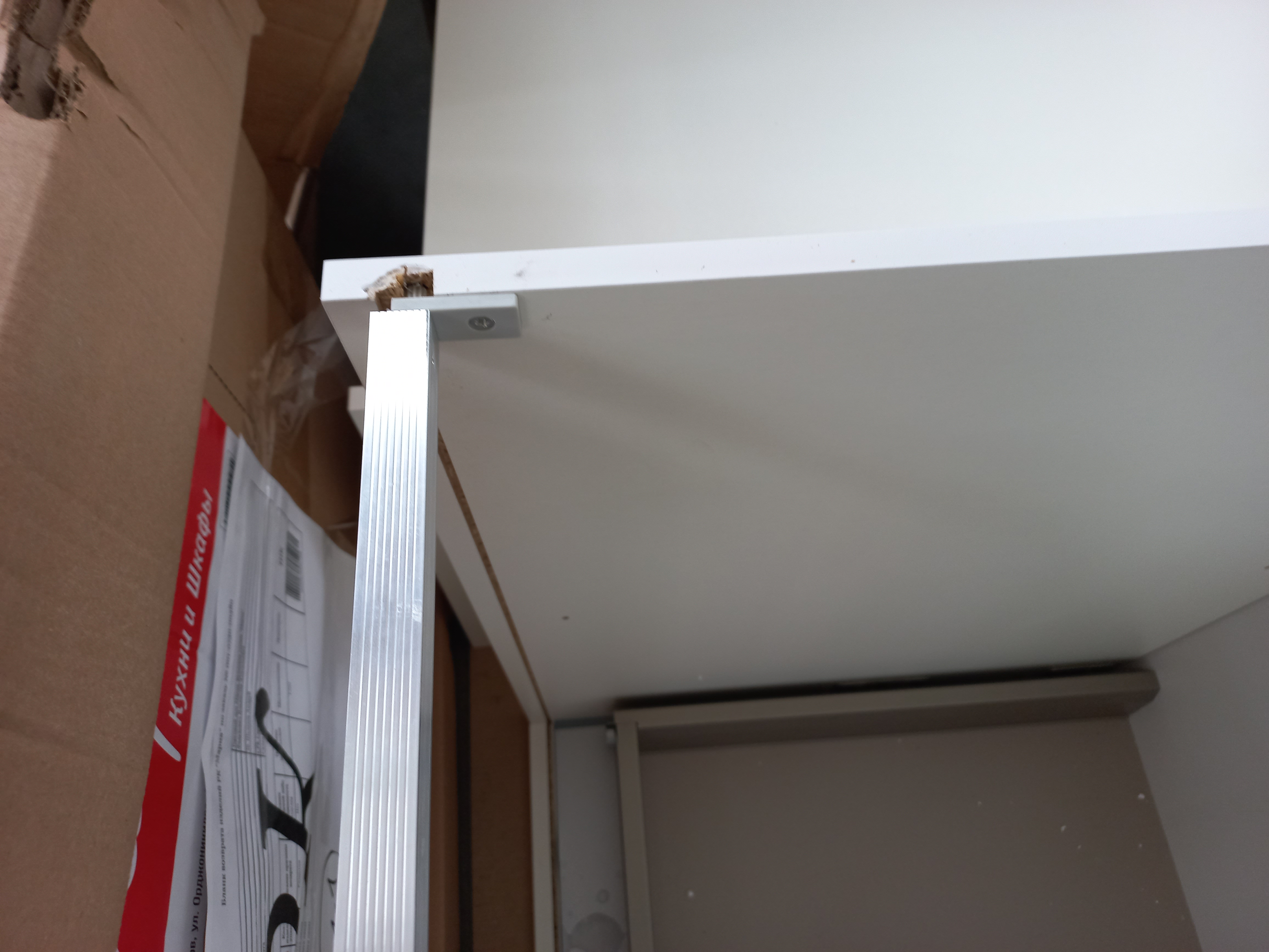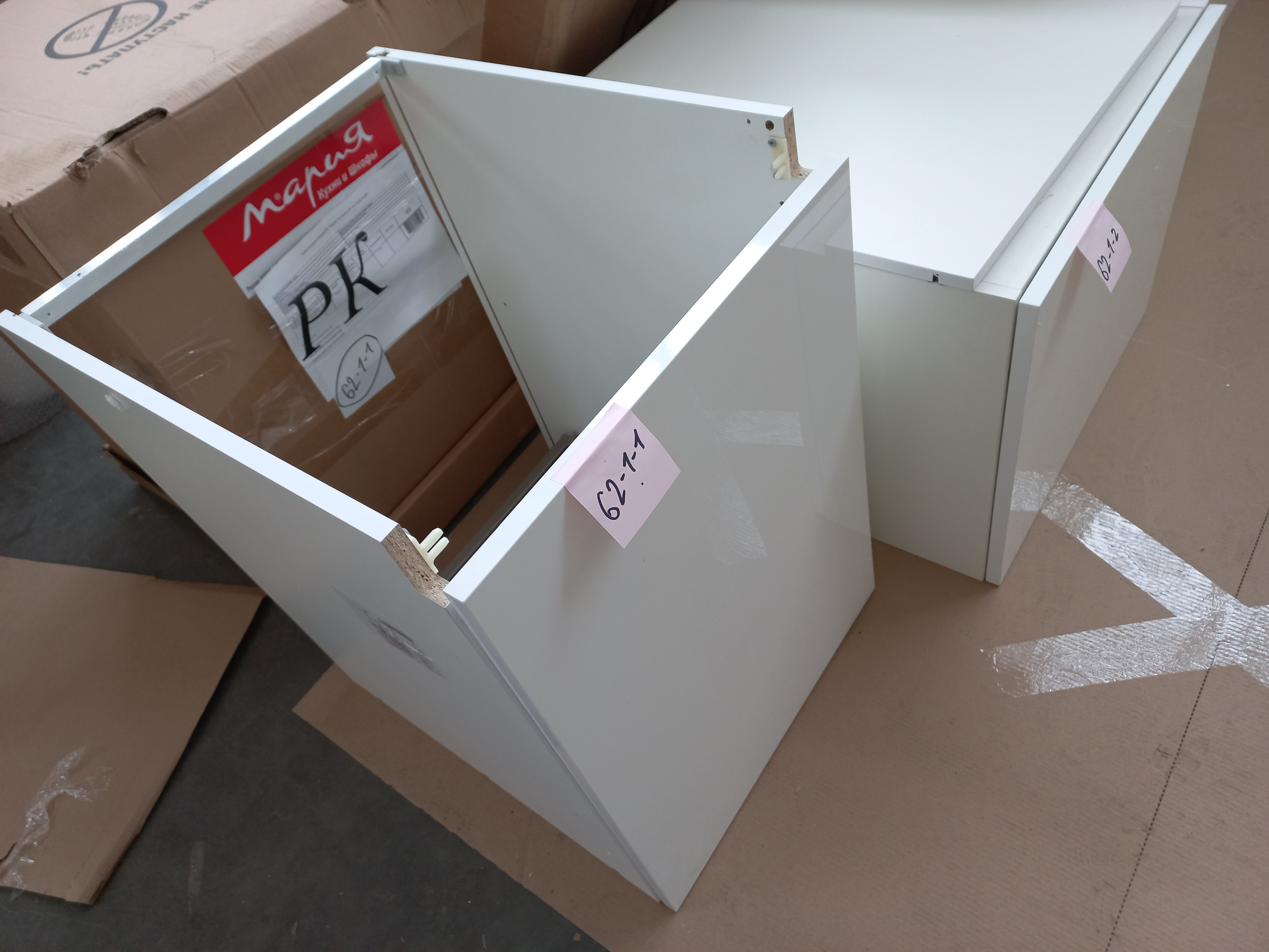 Внешний вид, описание дефектов: Возможно присутствие незначительных потертостей и царапин. Сколы, царапины, вырезы каркаса. В некоторых секциях сломаны: скрепляющие части каркаса и элементы каркаса рядом с профилем GOLA (см. фото). Секция над варочной панелью под встраиваемую вытяжку, с фасадным дном снизу (см. фото). Нестандартные глубины секций подразумевают свес столешницы сзади 200мм.