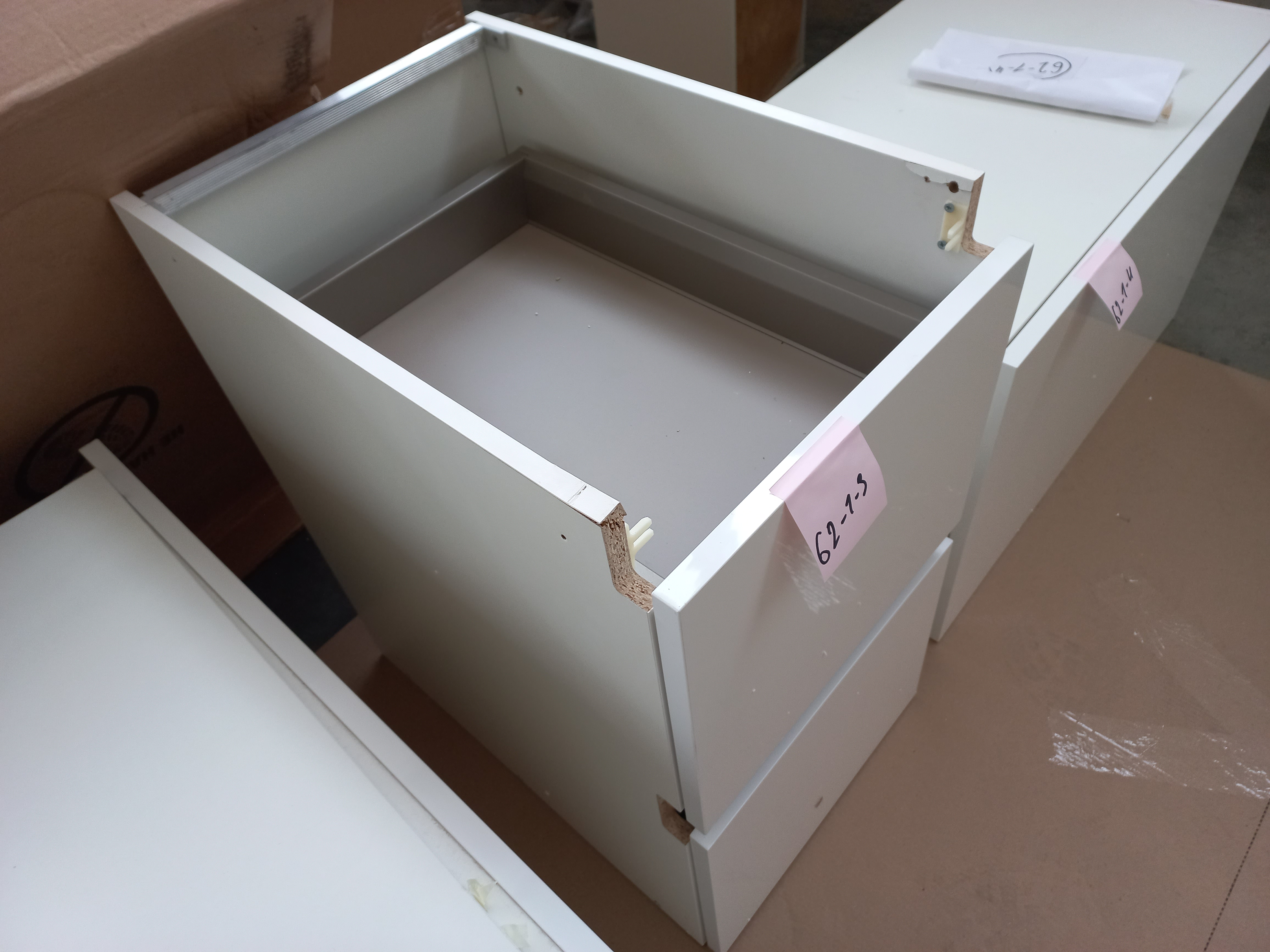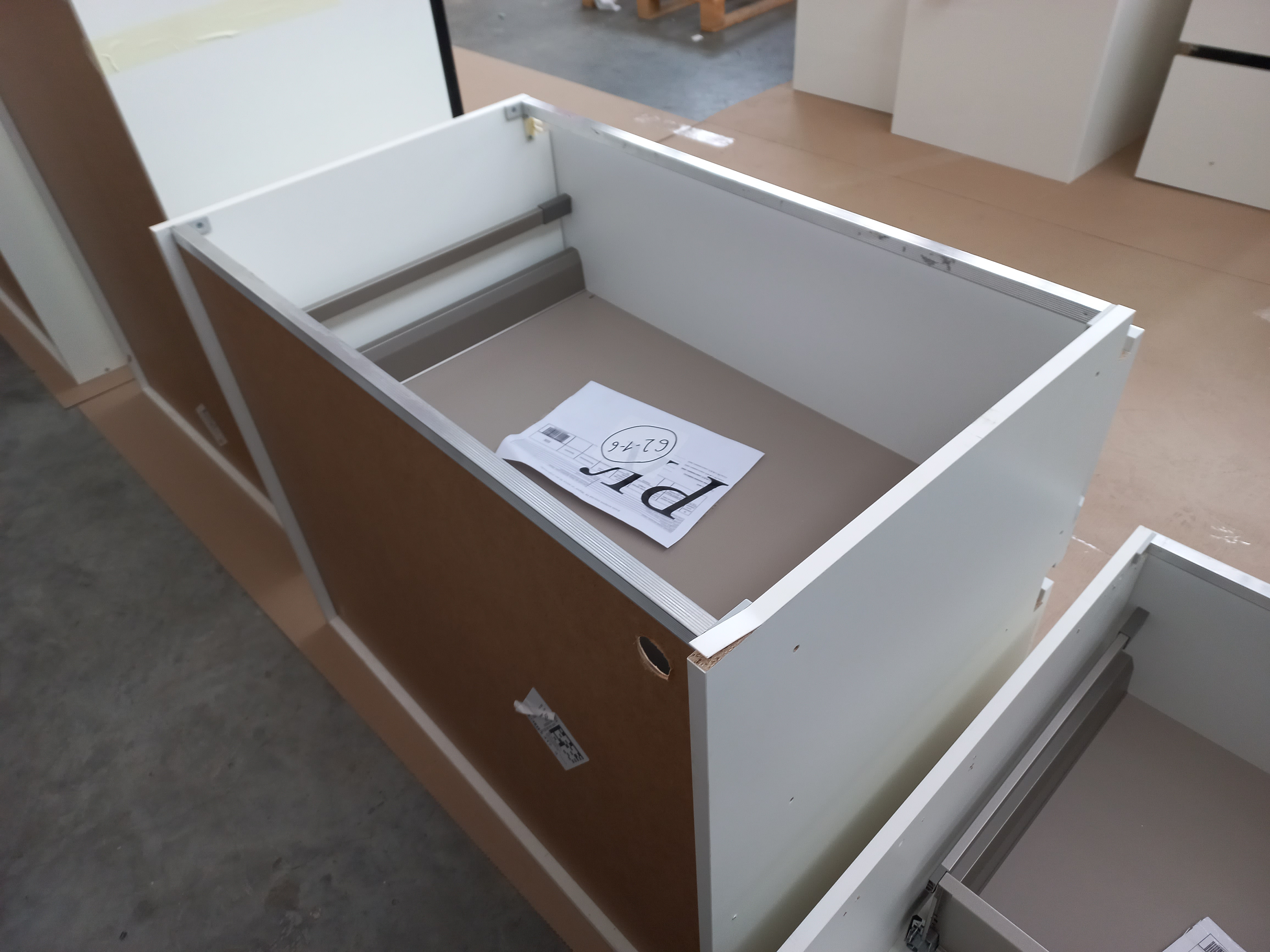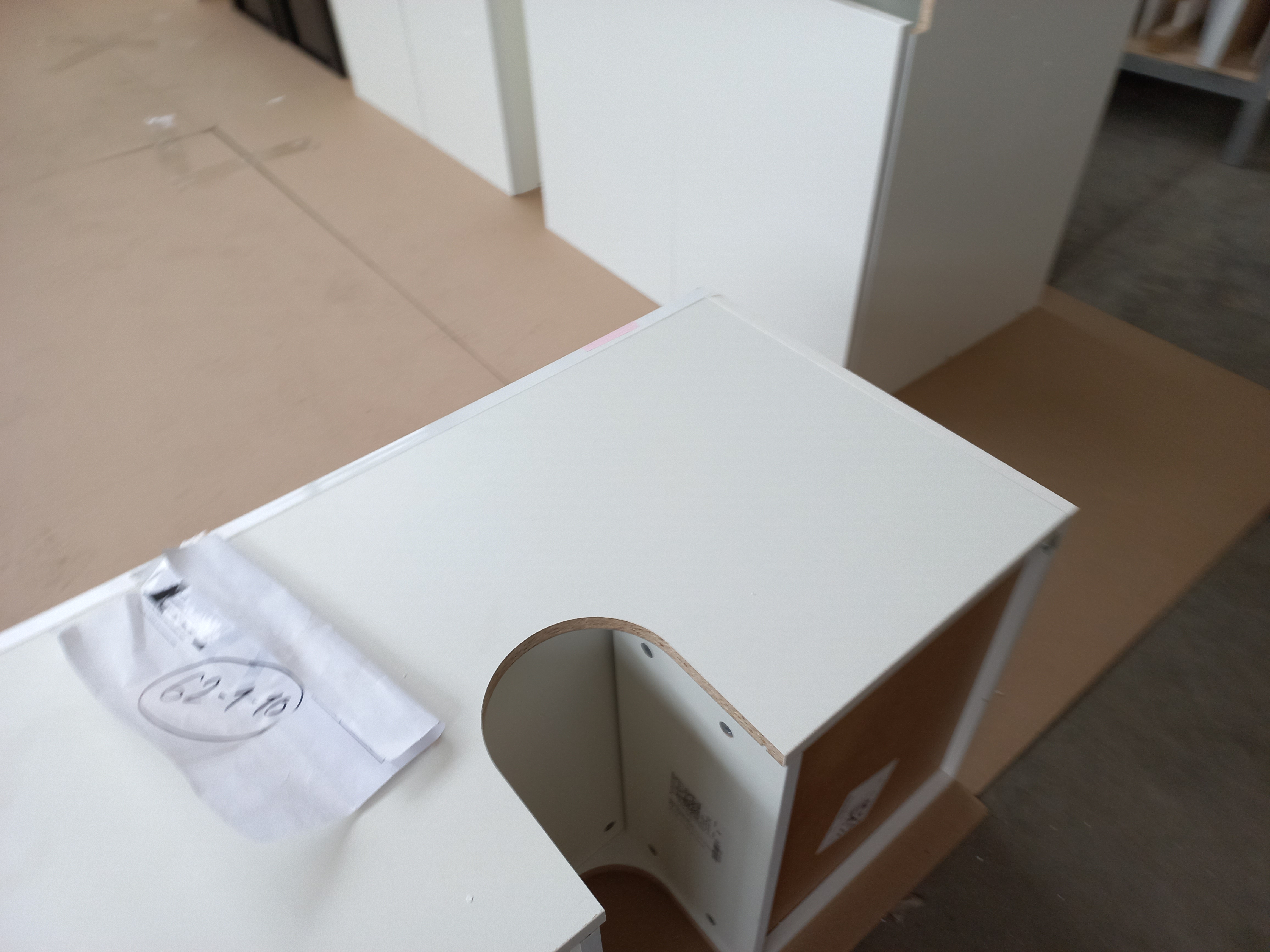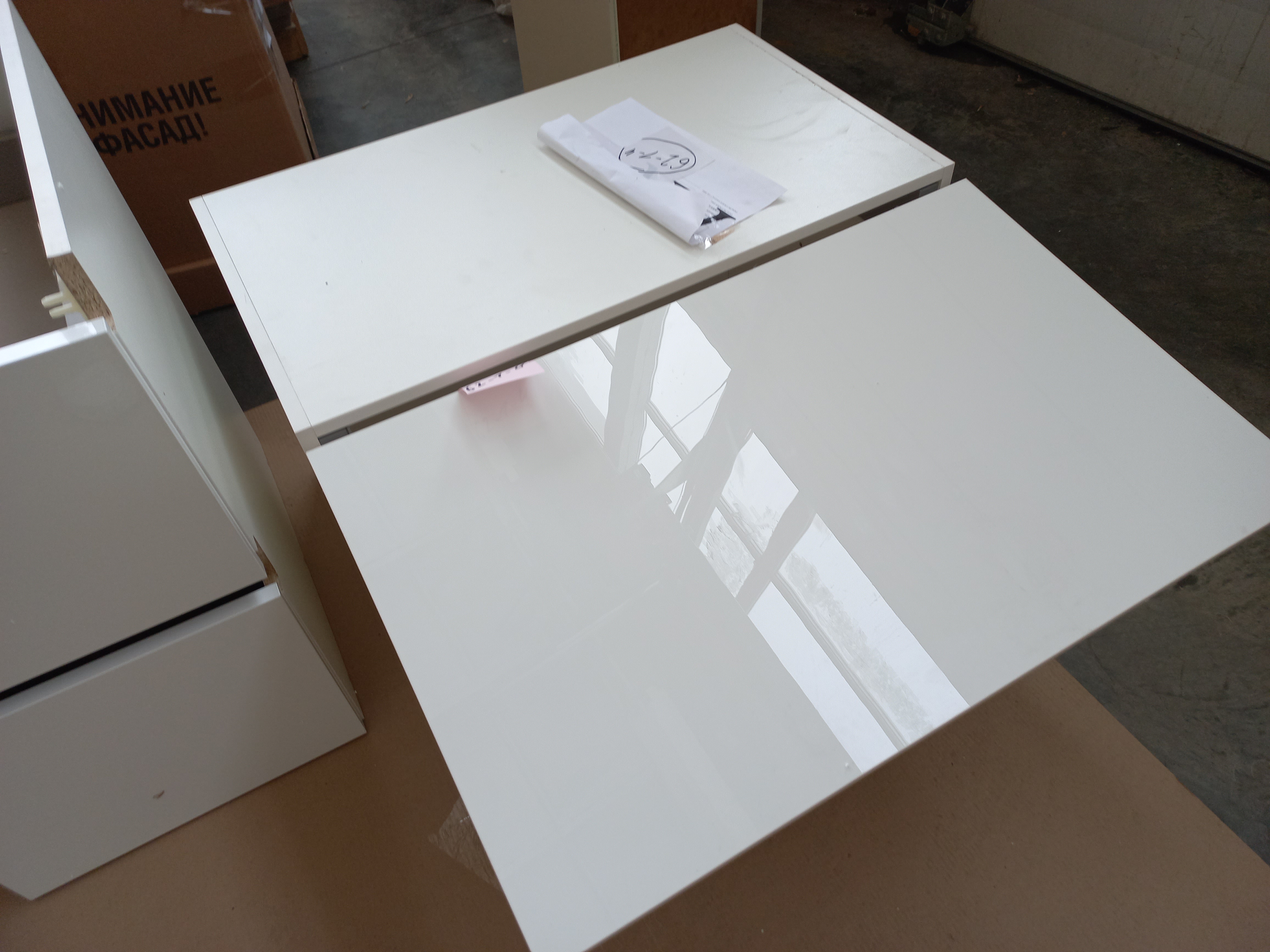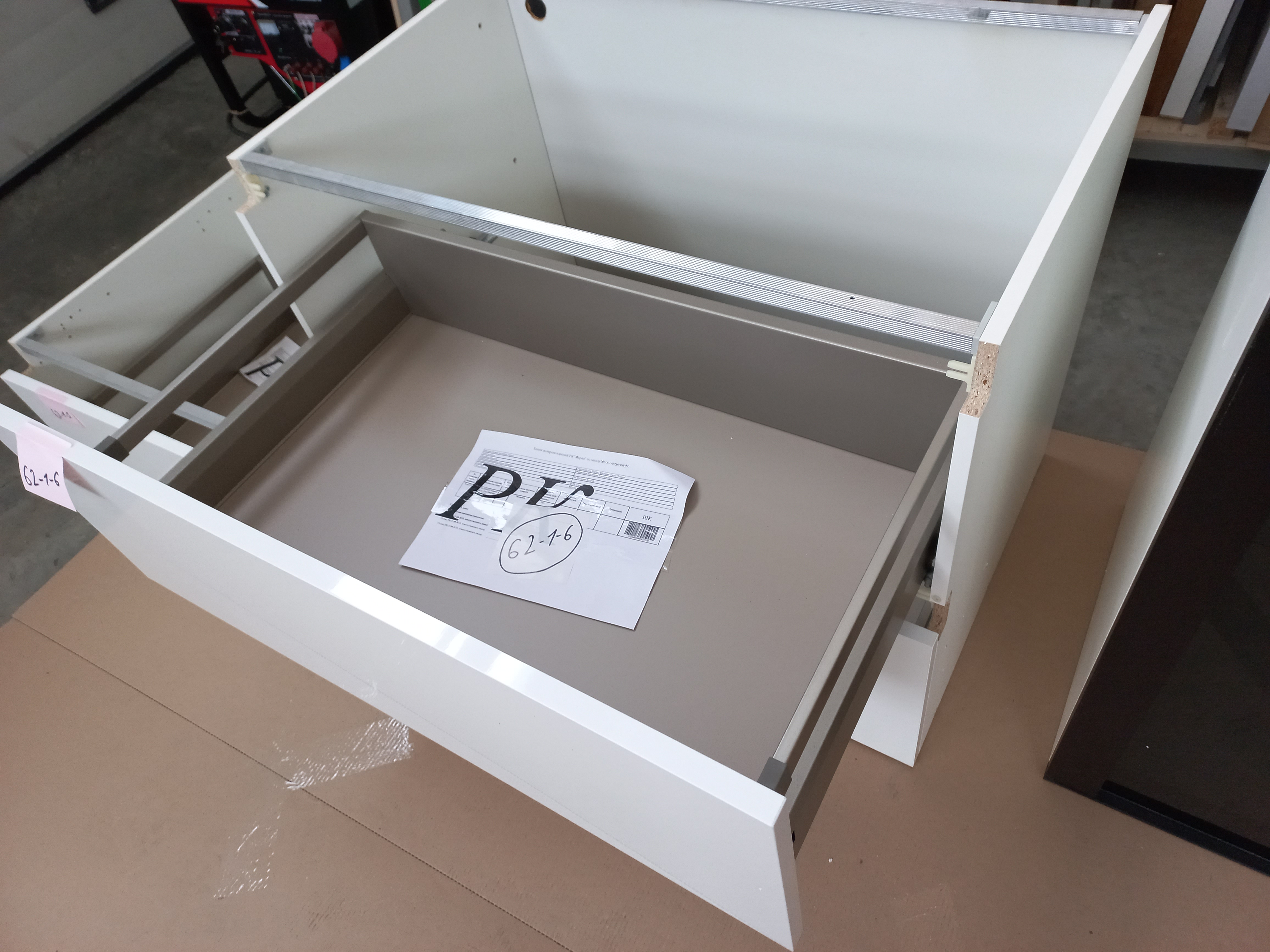 Внешний вид, описание дефектов: Возможно присутствие незначительных потертостей и царапин. Сколы, царапины, вырезы каркаса. В некоторых секциях сломаны: скрепляющие части каркаса и элементы каркаса рядом с профилем GOLA (см. фото). Секция над варочной панелью под встраиваемую вытяжку, с фасадным дном снизу (см. фото). Нестандартные глубины секций подразумевают свес столешницы сзади 200мм.
