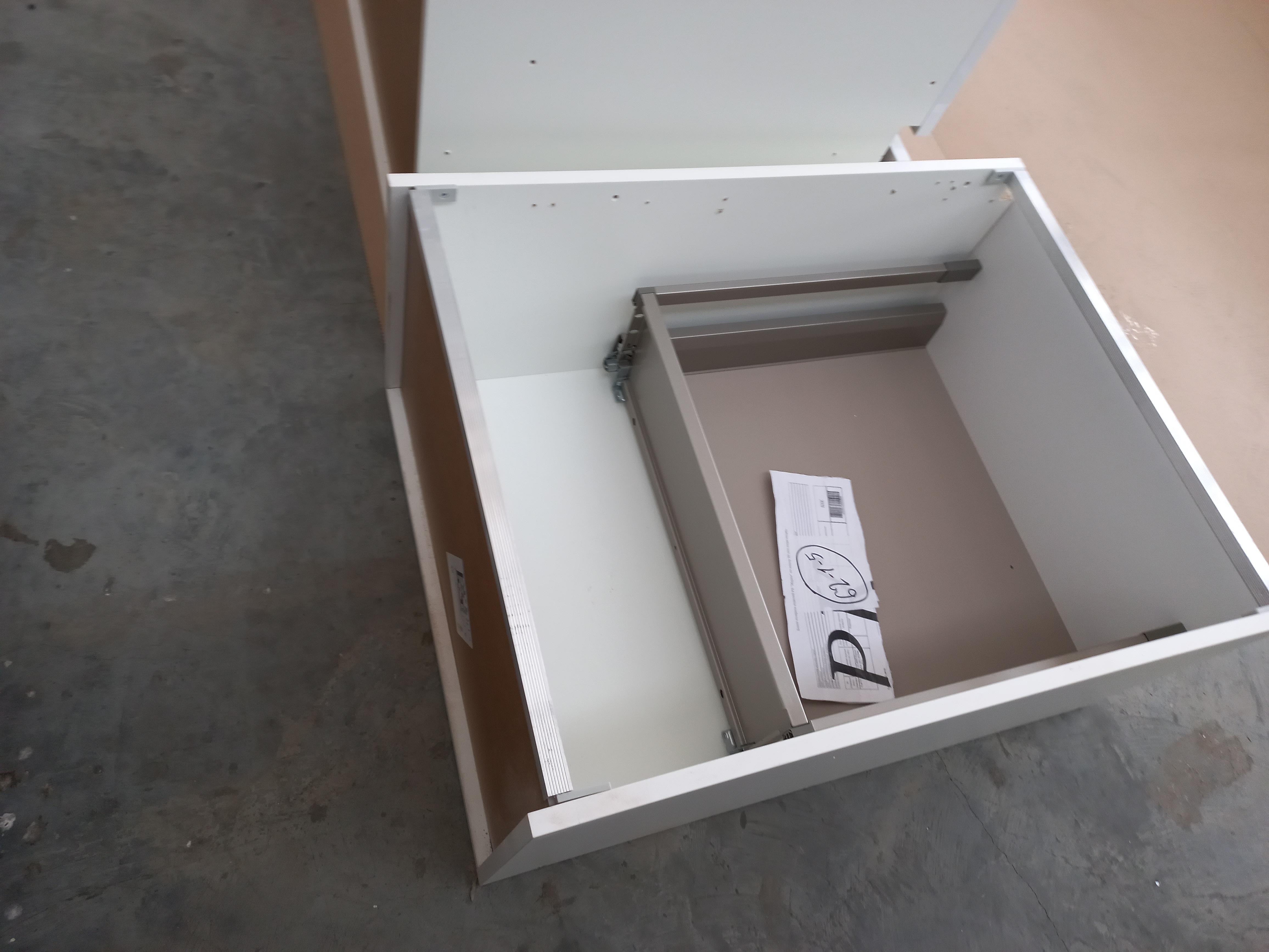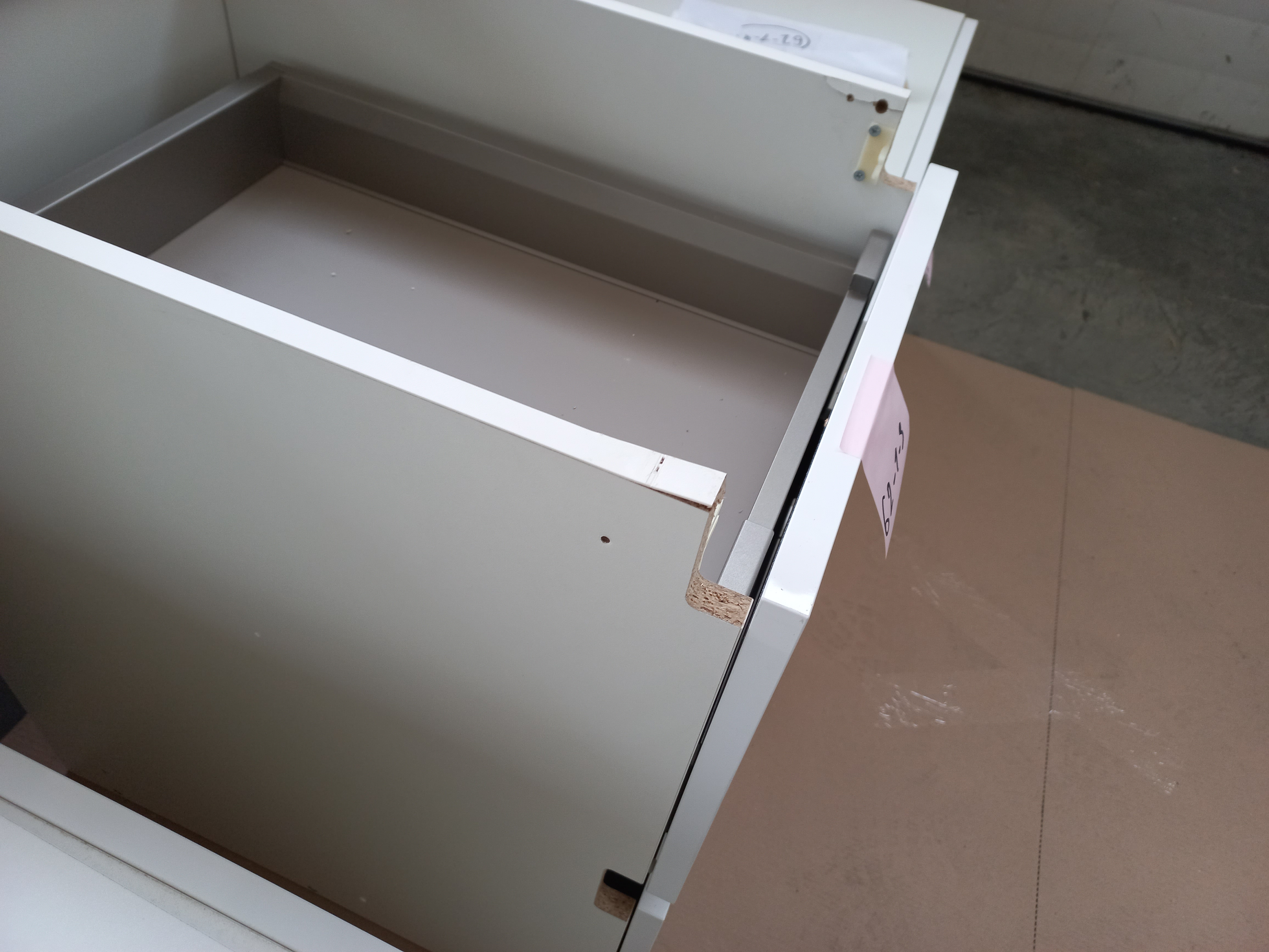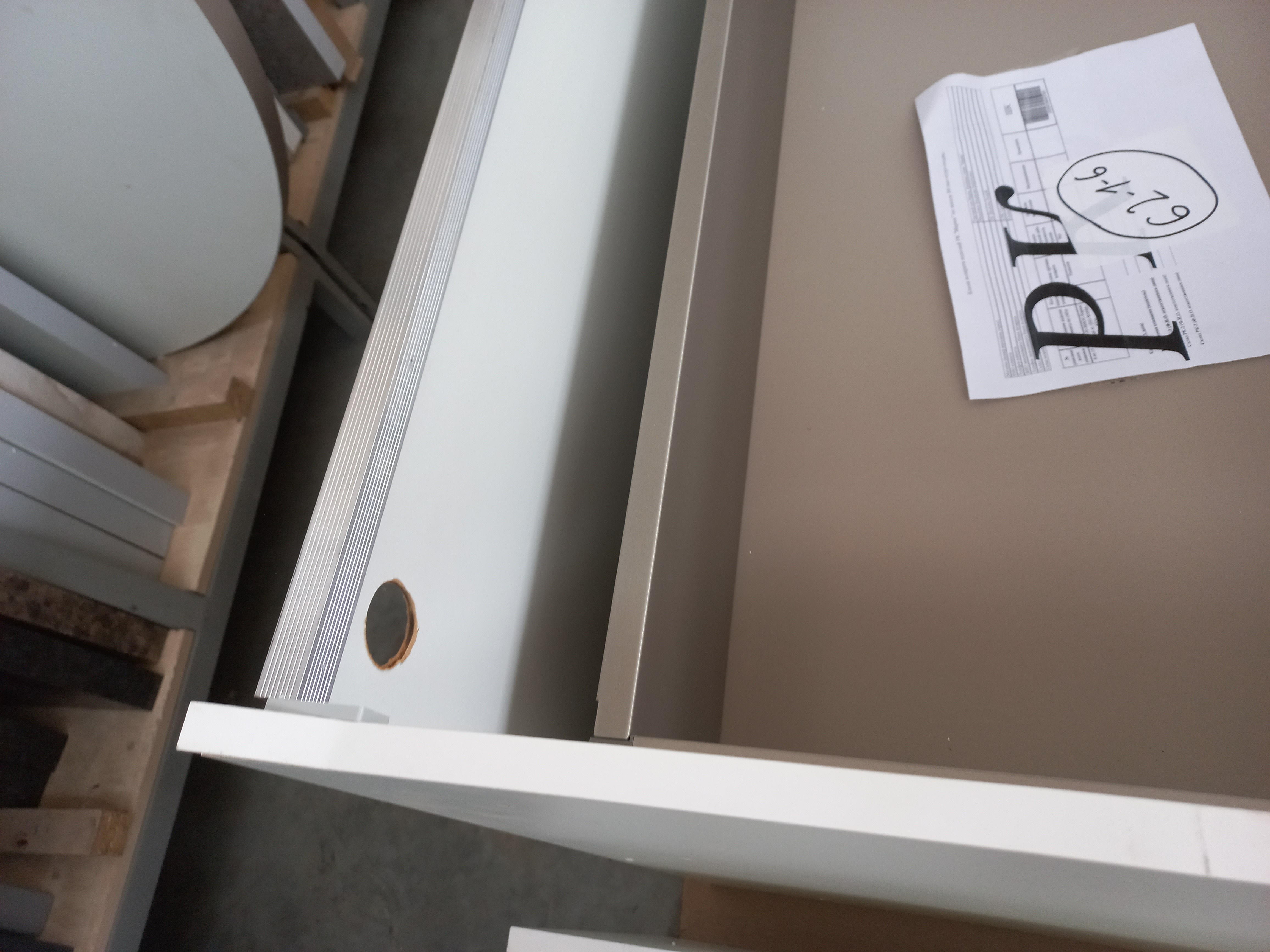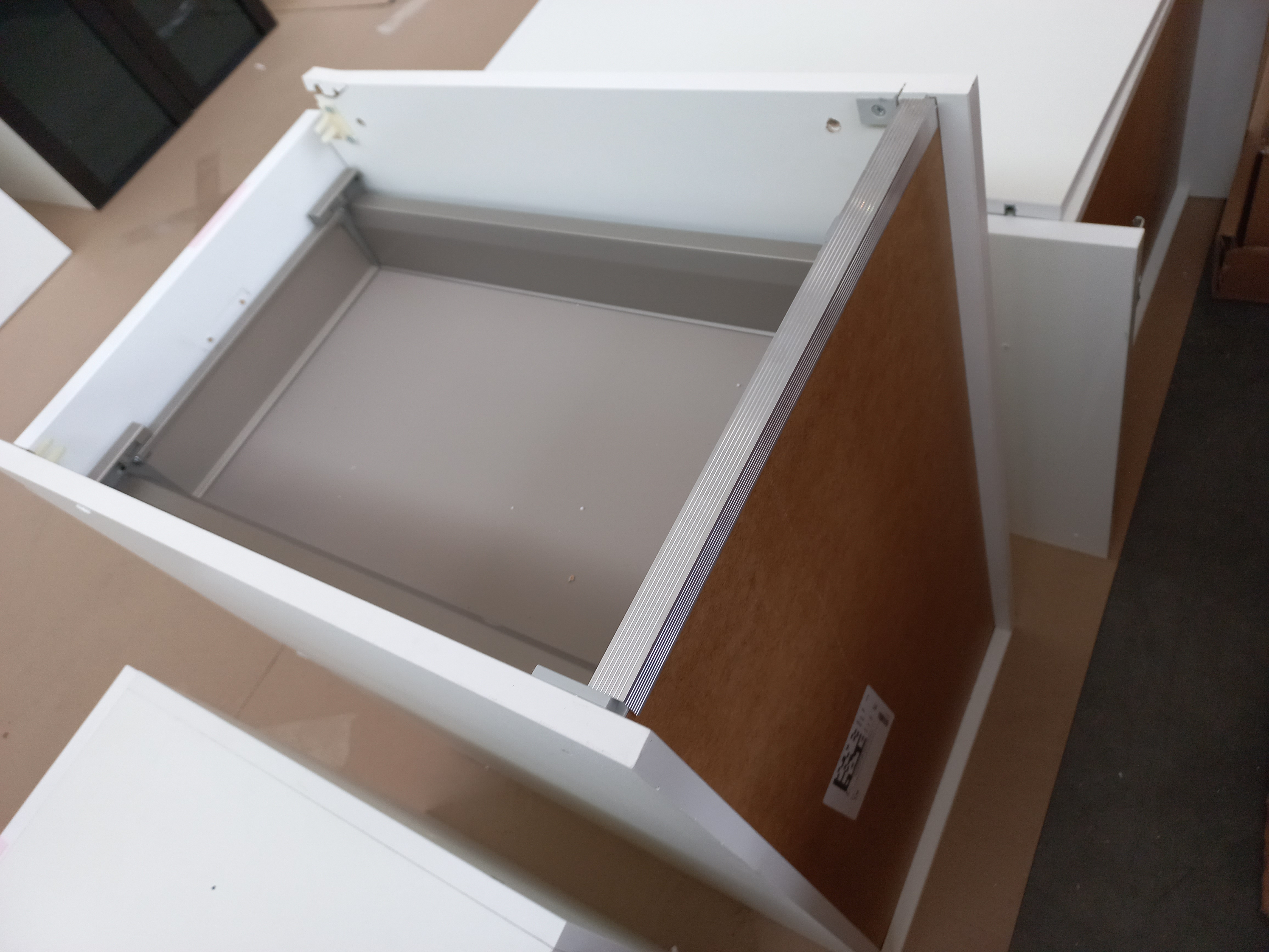 Внешний вид, описание дефектов: Возможно присутствие незначительных потертостей и царапин. Сколы, царапины, вырезы каркаса. В некоторых секциях сломаны: скрепляющие части каркаса и элементы каркаса рядом с профилем GOLA (см. фото). Секция над варочной панелью под встраиваемую вытяжку, с фасадным дном снизу (см. фото). Нестандартные глубины секций подразумевают свес столешницы сзади 200мм.
